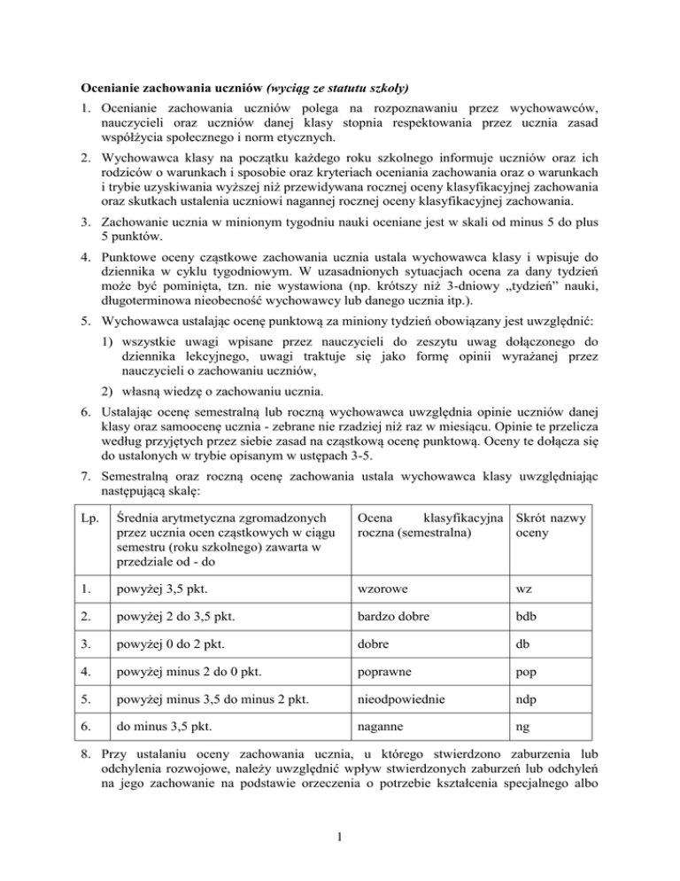 Ocenianie zachowania uczniów (wyciąg ze statutu szkoły) 1. Ocenianie zachowania uczniów polega na rozpoznawaniu przez wychowawców, nauczycieli oraz uczniów danej klasy stopnia respektowania przez ucznia zasad współżycia społecznego i norm etycznych. 2. Wychowawca klasy na początku każdego roku szkolnego informuje uczniów oraz ich rodziców o warunkach i sposobie oraz kryteriach oceniania zachowania oraz o warunkach i trybie uzyskiwania wyższej niż przewidywana rocznej oceny klasyfikacyjnej zachowania oraz skutkach ustalenia uczniowi nagannej rocznej oceny klasyfikacyjnej zachowania. 3. Zachowanie ucznia w minionym tygodniu nauki oceniane jest w skali od minus 5 do plus 5 punktów. 4. Punktowe oceny cząstkowe zachowania ucznia ustala wychowawca klasy i wpisuje do dziennika w cyklu tygodniowym. W uzasadnionych sytuacjach ocena za dany tydzień może być pominięta, tzn. nie wystawiona (np. krótszy niż 3-dniowy „tydzień” nauki, długoterminowa nieobecność wychowawcy lub danego ucznia itp.). 5. Wychowawca ustalając ocenę punktową za miniony tydzień obowiązany jest uwzględnić: 1) wszystkie uwagi wpisane przez nauczycieli do zeszytu uwag dołączonego do dziennika lekcyjnego, uwagi traktuje się jako formę opinii wyrażanej przez nauczycieli o zachowaniu uczniów, 2) własną wiedzę o zachowaniu ucznia. 6. Ustalając ocenę semestralną lub roczną wychowawca uwzględnia opinie uczniów danej klasy oraz samoocenę ucznia - zebrane nie rzadziej niż raz w miesiącu. Opinie te przelicza według przyjętych przez siebie zasad na cząstkową ocenę punktową. Oceny te dołącza się do ustalonych w trybie opisanym w ustępach 3-5. 7. Semestralną oraz roczną ocenę zachowania ustala wychowawca klasy uwzględniając następującą skalę: Lp. Średnia arytmetyczna zgromadzonych przez ucznia ocen cząstkowych w ciągu semestru (roku szkolnego) zawarta w przedziale od - do Ocena klasyfikacyjna Skrót nazwy roczna (semestralna) oceny 1. powyżej 3,5 pkt. wzorowe wz 2. powyżej 2 do 3,5 pkt. bardzo dobre bdb 3. powyżej 0 do 2 pkt. dobre db 4. powyżej minus 2 do 0 pkt. poprawne pop 5. powyżej minus 3,5 do minus 2 pkt. nieodpowiednie ndp 6. do minus 3,5 pkt. naganne ng 8. Przy ustalaniu oceny zachowania ucznia, u którego stwierdzono zaburzenia lub odchylenia rozwojowe, należy uwzględnić wpływ stwierdzonych zaburzeń lub odchyleń na jego zachowanie na podstawie orzeczenia o potrzebie kształcenia specjalnego albo 1 indywidualnego nauczania lub opinii publicznej poradni psychologiczno-pedagogicznej, w tym poradni specjalistycznej. 9. Wychowawca na bieżąco informuje wychowanków o wystawionych ocenach cząstkowych z zachowania podając niezbędne uzasadnienia podczas godziny do dyspozycji wychowawcy. 10. Ocena zachowania nie może mieć wpływu na: a) oceny z zajęć edukacyjnych, b) promocję do klasy programowo wyższej lub ukończenie szkoły, z zastrzeżeniem § 46, ust. 3 i 4 11. Uczeń może otrzymać ocenę klasyfikacyjną z zachowania inną niż ustalona w trybie ust. 3-7 tylko w sytuacji, gdy w okresie od ustalenia przewidywanej oceny klasyfikacyjnej do ustalenia ostatecznej oceny z zachowania ujawnione zostały istotne fakty, informacje lub dokonały się z udziałem ucznia zdarzenia, które radykalnie rzutują na istotę oceny zachowania ucznia, np.: 1) bohaterski czyn ucznia, 2) dopuszczenie się czynu karalnego (kradzież, rozbój, inne), 3) rażące naruszenie zasad współżycia społecznego, 4) rażące naruszenie interesu szkoły, 5) inne szczególne wydarzenia lub okoliczności. 12. Odstąpienie przez wychowawcę od trybu ustalonego w ust. 3-7 i ustalenie zaproponowanej przez wychowawcę oceny w trybie ust. 11 wymaga uzyskania pozytywnej opinii rady pedagogicznej. § 48 1. Rodzice mogą w terminie do 7 dni po zakończeniu zajęć dydaktyczno-wychowawczych zgłosić zastrzeżenia do dyrektora szkoły, jeśli uznają że roczna ocena klasyfikacyjna z zachowania została ustalona niezgodnie z przepisami prawa dotyczącymi trybu jej ustalania. Celem rozpatrzenia wniosku, o którym mowa w ust. 1 stosuje się procedurę i zasady określone w § 17 Rozporządzenia MEN w sprawie warunków i sposobu oceniania, klasyfikowania i promowania uczniów …. 2