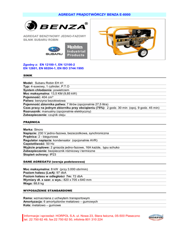 AGREGAT PRĄDOTWÓRCZY BENZA E-8000 AGREGAT BENZYNOWY JEDNO-FAZOWY SILNIK SUBARU ROBIN Zgodny z: EN 12100-1, EN 12100-2 EN 12601, EN 60204-1, EN ISO 3744:1995 SINIK Model: Subaru Robin EH 41 Typ: 4-suwowy, 1 cylinder, P.T.O System chłodzenia: powietrzem Moc maksymalna: 13,5 KM (9,85 kW) Pojemność: 404 cm³ Paliwo: benzyna bezołowiowa Pojemność zbiornika paliwa: 7 litrów (opcjonalnie 27,5 litra) Czas pracy na jednym zbiorniku przy obciążeniu (75%): 2 godz. 30 min (opcj. 9 godz. 45 min) Rozrusznik: manualny (opcjonalnie elektryczny) Zabezpieczenie: czujnik oleju PRĄDNICA Marka: Sincro Napięcie: 230 V jedno-fazowa, bezsczotkowa, synchroniczna Prądnica: 2 - biegunowa Regulator napięcia: kondensator (opcjonalnie AVR) Częstotliwość: 50 Hz Wyjście prądowe: 2 gniazda jedno-fazowe, 16A każde, typu schuko Zabezpieczenie: bezpiecznik różnicowy i termiczne Stopień ochrony: IP23 DANE AGREGATU (wersja podstawowa) Moc maksymalna: 8 kW (przy 3.000 obr/min) Poziom hałasu (LwA): 97 dbA Poziom hałasu w odległości 7m: 72 dbA Wymiary dł. x szer. x wys.: 820 x 705 x 640 mm Waga: 88,6 kg WYPOSAŻENIE STANDARDOWE Rama: wzmacniana z uchwytem transportowym Amortyzacja: 6 amortyztorów metalowo – gumowych Koła: metalowo – gumowe Informacje i sprzedaż: HORPOL S.A. ul. Nowa 23, Stara Iwiczna, 05-500 Piaseczno tel. 22 750 62 49, fax 22 750 62 50, infolinia 801 310 224