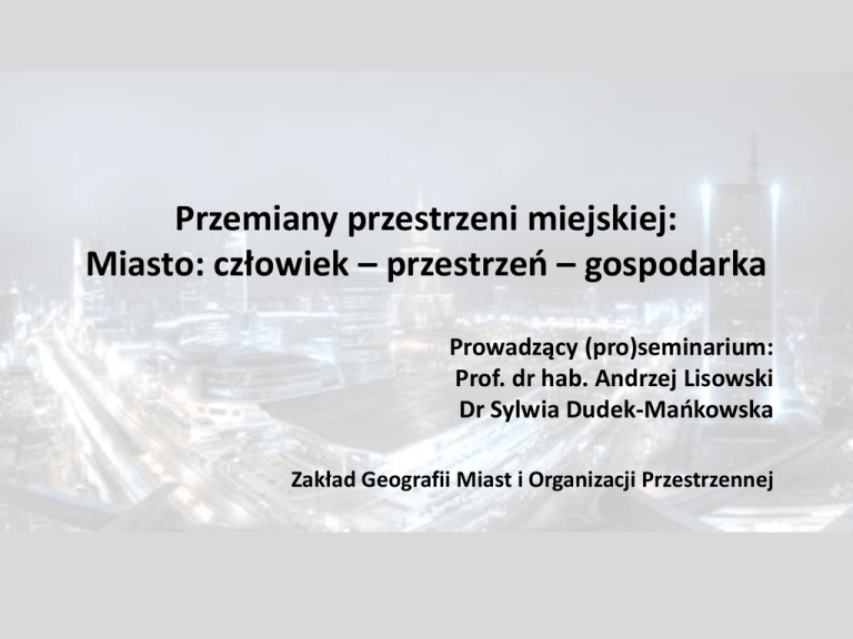 Przemiany przestrzeni miejskiej: Miasto: człowiek – przestrzeń – gospodarka Prowadzący (pro)seminarium: Prof. dr hab. Andrzej Lisowski Dr Sylwia Dudek-Mańkowska Zakład Geografii Miast i Organizacji Przestrzennej (Pro)Seminarium licencjackie Kto poprowadzi pro/seminarium? dr Sylwia Dudek-Mańkowska prof. dr hab. Andrzej Lisowski Kto zaopiekuje się pracami licencjackimi? Pracownicy Zakładu Geografii Miast i Organizacji Przestrzennej Klucz: zainteresowania studenta - pracownika Czego oczekujemy od kandydatów? Zainteresowania zmianami zachodzącymi w miastach …. POZNAWANIE WARTOŚCIOWANIE CZŁOWIEK PRZESTRZEŃ KSZTAŁTOWANIE UŻYTKOWANIE POZNAWANIE Znajomość Warszawy wśród mieszkańców Białołęki • Rola placówek kulturalnorozrywkowych w zmianie wizerunku Pragi Północ • Percepcja warszawskiego Miedzeszyna Mapa wyobrażeniowa Dostępność Dworca Centralnego samochodem WARTOŚCIOWANIE Ocena osiedli zamkniętych jako miejsca zamieszkania • Znaczenie kolei dla mieszkańców Otwocka dojeżdżających do Warszawy • Konflikty lokalne a przestrzeń miejska w Warszawie. Przykład ogrodów działkowych KSZTAŁTOWANIE Murale w przestrzeni publicznej miasta • Rozmieszczenie nośników reklamy zewnętrznej. Przypadek Alei Niepodległości w Warszawie • Kształtowanie przestrzeni miejskiej na przykładzie Placu Grzybowskiego w Warszawie Powiązania pomiędzy szkołami a basenami w Warszawie UŻYTKOWANIE Obecne użytkowanie fortów pierścienia wewnętrznego dawnej Twierdzy Warszawa Uczniowie LO jako klienci warszawskich sklepów z używaną odzieżą Atrakcyjność inwestycyjna gminy Raszyn Obiekty sportowo-rekreacyjne w Puławach • Konflikty funkcjonalno-przestrzenne inwestor – społeczność lokalna; inwestor – społeczność lokalna – władze; presja antropogeniczna na środowisko przyrodnicze [tereny cenne przyrodniczo; suburbanizacja] nowe inwestycje [usługi, przemysł] – stadion, kluby, zakłady, domy • Konflikty społeczne starzy mieszkańcy – nowi mieszkańcy; starzy mieszkańcy – władze – nowi mieszkańcy osiedla zamknięte, zróżnicowane sąsiedztwa (otwarte – zamknięte; bloki – domki – kamienice) nowe inwestycje [usługi, przemysł] – stadion, kluby, zakłady, domy • Nowe przestrzenie w miastach przemiany miasta – nowe funkcje kształtowanie przestrzeni publicznych [parki, place, bulwary] rewitalizacja obszarów zdegradowanych [mieszkaniowe, nadrzeczne, powojskowe…] centra handlowe, stadiony, stacje kolejowe … • Przemiany społeczne zróżnicowanie społeczno-przestrzenne [różne grupy w mieście, różna zabudowa] dostosowanie oferty miasta do różnych grup społecznych wykluczenie społeczne, integracja mieszkańców ZAPRASZAMY [email protected]