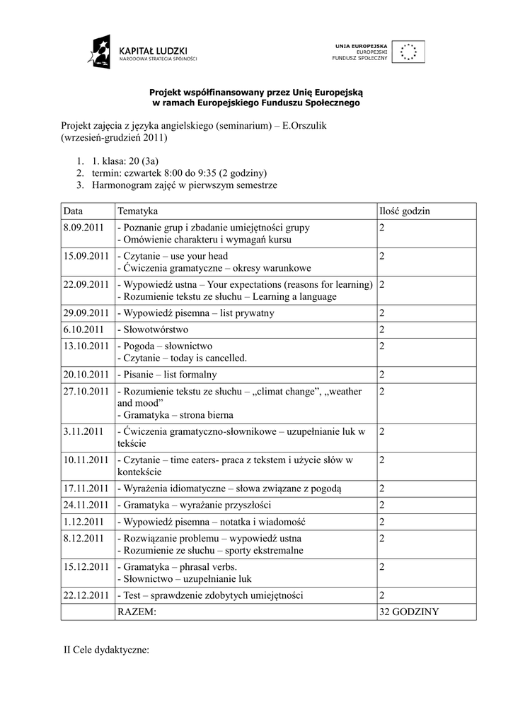 Projekt współfinansowany przez Unię Europejską w ramach Europejskiego Funduszu Społecznego Projekt zajęcia z języka angielskiego (seminarium) – E.Orszulik (wrzesień-grudzień 2011) 1. 1. klasa: 20 (3a) 2. termin: czwartek 8:00 do 9:35 (2 godziny) 3. Harmonogram zajęć w pierwszym semestrze Data Tematyka Ilość godzin 8.09.2011 - Poznanie grup i zbadanie umiejętności grupy - Omówienie charakteru i wymagań kursu 2 15.09.2011 - Czytanie – use your head - Ćwiczenia gramatyczne – okresy warunkowe 2 22.09.2011 - Wypowiedź ustna – Your expectations (reasons for learning) 2 - Rozumienie tekstu ze słuchu – Learning a language 29.09.2011 - Wypowiedź pisemna – list prywatny 2 - Słowotwórstwo 2 13.10.2011 - Pogoda – słownictwo - Czytanie – today is cancelled. 2 20.10.2011 - Pisanie – list formalny 2 27.10.2011 - Rozumienie tekstu ze słuchu – „climat change”, „weather and mood” - Gramatyka – strona bierna 2 6.10.2011 3.11.2011 - Ćwiczenia gramatyczno-słownikowe – uzupełnianie luk w tekście 2 10.11.2011 - Czytanie – time eaters- praca z tekstem i użycie słów w kontekście 2 17.11.2011 - Wyrażenia idiomatyczne – słowa związane z pogodą 2 24.11.2011 - Gramatyka – wyrażanie przyszłości 2 1.12.2011 - Wypowiedź pisemna – notatka i wiadomość 2 8.12.2011 - Rozwiązanie problemu – wypowiedź ustna - Rozumienie ze słuchu – sporty ekstremalne 2 15.12.2011 - Gramatyka – phrasal verbs. - Słownictwo – uzupełnianie luk 2 22.12.2011 - Test – sprawdzenie zdobytych umiejętności 2 RAZEM: II Cele dydaktyczne: 32 GODZINY 1. Usystematyzowanie i poszerzenie z zakresu gramatyki i leksyki języka ang. na poziomie zaawansowanym i przygotowanie uczniów do CAE. 2. Pomoc w rozwijaniu kompetencji językowych oraz szczególnych umiejętności językowych (mówienie, czytanie, słuchanie, pisanie). 3. Nabycie płynności w rozumieniu i stosowaniu struktur gramatycznych oraz umiejętności posługiwania się nimi w danym kontekście ze szczególnym uwzględnieniem rejestru językowego. 4. Poszerzanie słownictwa oraz pomoc w użyciu danych struktur w kontekście. 5. Budowanie spójnej wypowiedzi pisemnej i ustnej z uwzględnieniem odpowiednich struktur leksykalno- gramatycznych. 6. Pomoc w opracowaniu strategii rozwiązywania poszczególnych zadań testu sprawdzającego.