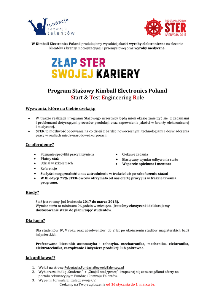 W Kimball Electronics Poland produkujemy wysokiej jakości wyroby elektroniczne na zlecenie klientów z branży motoryzacyjnej i przemysłowej oraz wyroby medyczne. Program Stażowy Kimball Electronics Poland Start & Test Engineering Role Wyzwania, które na Ciebie czekają: W trakcie realizacji Programu Stażowego uczestnicy będą mieli okazję zmierzyć się z zadaniami i problemami dotyczącymi procesów produkcji oraz zapewnienia jakości w branży elektronicznej i medycznej. STER to możliwość obcowania na co dzień z bardzo nowoczesnymi technologiami i doświadczenia pracy w realiach międzynarodowej korporacji. Co oferujemy? Poznanie specyfiki pracy inżyniera Ciekawe zadania Płatny staż Elastyczny wymiar odbywania stażu Udział w szkoleniach Wsparcie opiekuna i mentora Referencje Stażyści mogą znaleźć u nas zatrudnienie w trakcie lub po zakończeniu stażu! W III edycji 75% STER-owców otrzymało od nas ofertę pracy już w trakcie trwania programu. Kiedy? Staż jest roczny (od kwietnia 2017 do marca 2018). Wymiar stażu to minimum 96 godzin w miesiącu. Jesteśmy elastyczni i deklarujemy dostosowanie stażu do planu zajęć studentów. Dla kogo? Dla studentów IV, V roku oraz absolwentów do 2 lat po ukończeniu studiów magisterskich bądź inżynierskich. Preferowane kierunki: automatyka i robotyka, mechatronika, mechanika, elektronika, elektrotechnika, zarządzanie i inżyniera produkcji lub pokrewne. Jak aplikować? 1. 2. 3. Wejdź na stronę Rekrutacja.FundacjaRozwojuTalentow.pl Wybierz zakładkę „Studenci” -> „Znajdź staż/pracę” i zapoznaj się ze szczegółami oferty na portalu rekrutacyjnym Fundacji Rozwoju Talentów. Wypełnij formularz i załącz swoje CV. Czekamy na Twoje zgłoszenie od 16 stycznia do 1 marca br.