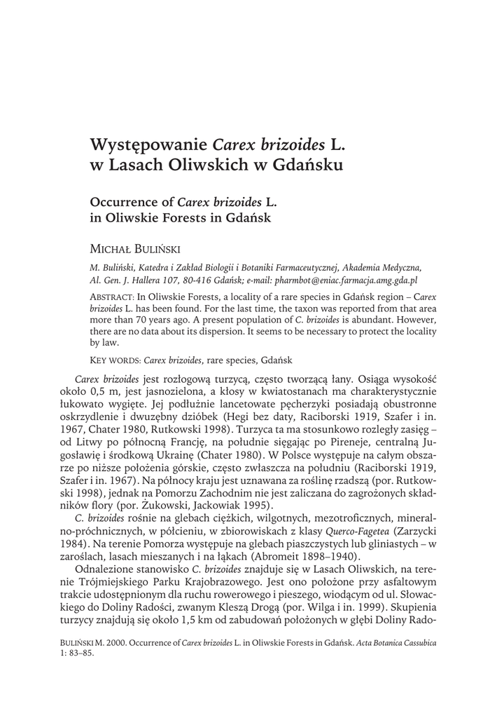 Występowanie Carex brizoides L. w Lasach Oliwskich w Gdańsku Occurrence of Carex brizoides L. in Oliwskie Forests in Gdańsk MICHAŁ BULIŃSKI M. Buliński, Katedra i Zakład Biologii i Botaniki Farmaceutycznej, Akademia Medyczna, Al. Gen. J. Hallera 107, 80-416 Gdańsk; e-mail: [email protected] ABSTRACT: In Oliwskie Forests, a locality of a rare species in Gdańsk region – Carex brizoides L. has been found. For the last time, the taxon was reported from that area more than 70 years ago. A present population of C. brizoides is abundant. However, there are no data about its dispersion. It seems to be necessary to protect the locality by law. KEY WORDS: Carex brizoides, rare species, Gdańsk Carex brizoides jest rozłogową turzycą, często tworzącą łany. Osiąga wysokość około 0,5 m, jest jasnozielona, a kłosy w kwiatostanach ma charakterystycznie łukowato wygięte. Jej podłużnie lancetowate pęcherzyki posiadają obustronne oskrzydlenie i dwuzębny dzióbek (Hegi bez daty, Raciborski 1919, Szafer i in. 1967, Chater 1980, Rutkowski 1998). Turzyca ta ma stosunkowo rozległy zasięg – od Litwy po północną Francję, na południe sięgając po Pireneje, centralną Jugosławię i środkową Ukrainę (Chater 1980). W Polsce występuje na całym obszarze po niższe położenia górskie, często zwłaszcza na południu (Raciborski 1919, Szafer i in. 1967). Na północy kraju jest uznawana za roślinę rzadszą (por. Rutkowski 1998), jednak na Pomorzu Zachodnim nie jest zaliczana do zagrożonych składników flory (por. Żukowski, Jackowiak 1995). C. brizoides rośnie na glebach ciężkich, wilgotnych, mezotroficznych, mineralno-próchnicznych, w półcieniu, w zbiorowiskach z klasy Querco-Fagetea (Zarzycki 1984). Na terenie Pomorza występuje na glebach piaszczystych lub gliniastych – w zaroślach, lasach mieszanych i na łąkach (Abromeit 1898–1940). Odnalezione stanowisko C. brizoides znajduje się w Lasach Oliwskich, na terenie Trójmiejskiego Parku Krajobrazowego. Jest ono położone przy asfaltowym trakcie udostępnionym dla ruchu rowerowego i pieszego, wiodącym od ul. Słowackiego do Doliny Radości, zwanym Kleszą Drogą (por. Wilga i in. 1999). Skupienia turzycy znajdują się około 1,5 km od zabudowań położonych w głębi Doliny RadoBULIŃSKI M. 2000. Occurrence of Carex brizoides L. in Oliwskie Forests in Gdańsk. Acta Botanica Cassubica 1: 83–85. 84 Michał Buliński ści. Obecne są zarówno przy samej drodze, jak i w oddaleniu – do około 100 m od niej. Płaty zajęte przez zwarty łan turzycy ciągną się przede wszystkim w wąskiej, krętej dolince okresowego cieku, długości około 200 m, biegnącej częściowo wzdłuż asfaltowej drogi, częściowo oddalającej się od niej w kierunku tzw. Szwedzkiej Grobli (por. Wilga i in. 1999). Kilka płatów z turzycą, średnicy do 50 m, jest również po drugiej stronie drogi. C. brizoides rośnie częściowo w prześwietleniach drzewostanu, częściowo pod okapem świerków oraz znajdujących się w niższej warstwie drzewostanu grabów. W łanach turzycy występują m. in.: Anemone nemorosa, Maianthemum bifolium, Oxalis acetosella i Trientalis europaea; częste są także siewki buka. Miejscami rosną również: Athyrium filix-femina, Calamagrostis arundinacea, Carex remota, Dryopteris carthusiana, Equisetum sylvaticum, Festuca altissima, Galeobdolon luteum, Hedera helix, Impatiens noli-tangere, I. parviflora, Milium effusum, Stellaria holostea i Urtica dioica. W wąskiej zabagnionej części dolinki C. brizoides rośnie także razem z Galium palustre, Glyceria cfr. nemoralis, Myosotis palustris i Ranunculus repens, a na poboczu drogi asfaltowej z wieloma innymi gatunkami. C. brizoides nie oddala się od wąskiego pasa dolinki, nie występuje również w miejscach zabagnień. Charakterystyczny jest brak okazów tego gatunku pod okapem buków oraz pod zwartym krzewiastym jego podrostem. Wprawdzie turzyca drżączkowata występuje tu generalnie na siedlisku żyznej buczyny niżowej Melico-Fagetum, to jednak buk, a przypuszczalnie ściółka z jego liści, działa wyraźnie hamująco na rozwój tej rośliny. Najbardziej bujne, zwarte łany C. brizoides zajmują w rzeczywistości pasy odmiennego niż buczynowe siedliska, nawiązującego do łęgowo-grądowego. C. brizoides jest w regionie gdańskim gatunkiem rzadkim, podawanym dotąd zaledwie z kilku miejsc (Abromeit 1898–1940). Z okolic Gdańska znane było jego stanowisko w Lasach Oliwskich wymieniane jako: „Las Kleszy koło Polanek przy Brętowie” (Kalkreuth 1913), „Las Oliwski” (Jager 1927) czy „droga przez szwedzką groblę do Kleszego Lasu” (Wangerin 1919 – wszystkie dane za Abromeitem 1898–1940). W późniejszych latach gatunku już nie podawano, nie odnaleziono go również w badaniach flory naczyniowej Lasów Oliwskich (Rydzewska-Szymczyk 1972). Być może lokalna populacja przechodziła regres związany z zacienieniem miejsc występowania turzycy pod zwartym okapem lasu. Obecnie w związku ze starzeniem się miejscowych drzewostanów i powstawaniem prześwietleń populacja ma możliwość rozrastania się. Odnalezione stanowisko C. brizoides znajduje się w tym samym rejonie Lasów Oliwskich, z którego podawano gatunek w przeszłości (por. Abromeit 1898–1940), i można uznać, że jest to wciąż ta sama populacja. Przypuszczalnie gatunek szerzej się tu nie rozprzestrzenia, gdyż brak danych o jego ewentualnym występowaniu w innych rejonach zarówno Lasów Oliwskich, jak i przylegających kompleksów leśnych. Wydaje się wskazane objęcie fragmentu lasu z C. brizoides ochroną prawną. Znajduje się on w granicach Trójmiejskiego Parku Krajobrazowego, co powinno ułatwić i przyspieszyć działania ochronne. Zebrany materiał zielnikowy złożono w zielniku GDMA. Występowanie Carex brizoides L. w Lasach Oliwskich w Gdańsku 85 Praca zrealizowana w ramach projektu badawczego finansowanego przez Komitet Badań Naukowych (g