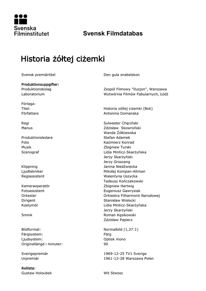 Svensk Filmdatabas Historia żółtej ciżemki Svensk premiärtitel Den gula snabelskon Produktionsuppgifter: Produktionsbolag Laboratorium Zespól Filmowy "Iluzjon", Warszawa Wytwórnia Filmów Fabularnych, Łódź Förlaga: Titel: Författare Historia zóltej cizemki (Bok) Antonina Domanska Regi Manus Produktionsledare Foto Musik Scenograf Klippning Ljudtekniker Regiassistent Kameraoperatör Fotoassistent Orkester Dirigent Kostymör Smink Sylwester Chęciński Zdzisław Skowroński Wanda Żółkiewska Stefan Adamek Kazimierz Konrad Zbigniew Turski Lidia Minticz-Skarżyńska Jerzy Skarżyński Jerzy Groszang Janina Niedźwiecka Mikołaj Kompan-Altman Walentyna Uszycka Tadeusz Kończakowski Zbigniew Hartwig Eugeniusz Gawrysiak Orkiestra Filharmonii Narodowej Stanisław Wisłocki Lidia Minticz-Skarżyńska Jerzy Skarżyński Roman Kęsikowski Zdzisław Papierz Bildformat: Färgsystem: Ljudsystem: Originallängd i minuter: Normalbild (1,37:1) Färg Optisk mono 90 Sverigepremiär Urpremiär 1969-12-25 TV1 Sverige 1961-12-28 Warszawa Polen Rollista: Gustaw Holoubek Wit Stwosz Svensk Filmdatabas Bogumił Kobiela Bronisław Pawlik Andrzej Szczepkowski Marek Kondrat Bogdan Baer Beata Barszczewska Tadeusz Białoszczyński Bogdan Niewinowski Mieczysław Czechowicz Aleksander Fogiel Maria Kieszkowa Michał Szewczyk Włodzimierz Kwaskowski Ignacy Machowski Zygmunt Malawski Zygmunt Zintel Antoni Żukowski Hanna Bedryńska Marian Wojtczak Joanna Jędryka Zbigniew Józefowicz Jerzy Kowalski Anna Kulawińska Adam Pawlikowski Henryk Staszewski Beata Tyszkiewicz Maria Wachowiak Edward Wichura Feliks Żukowski Froncek, vandrande jonglör Gregorius, vandrande jonglör "Czarny Rafał" (Svarte Rafael), bandit Wawrzek Ignac, Stwosz assistent Małgosia kungen Stanko Stwosz assistent vakt till porten till Kraków vaktchef vid slottet i Myślenice Wawrzeks hustru Kudraś, väktare i Myślenice väktare i Myślenice mästare Paweł vakt i Myślenice värdshusvärd värd man framför värdshuset mennen som tillkännager kungen härold vakt vid porten till Kraków Zofka piga man framför värdshuset vakt i Kraków Svensk filmografi Pojken Wawrzeks högsta önskan är att bli träsnidare. Till slut får han chansen att arbeta med den store mästaren Wit Stdosz. Det hela slutar med färdigställandet av Stdosz' mästerverk: altaret till St. Marys kyrka i Krakow.