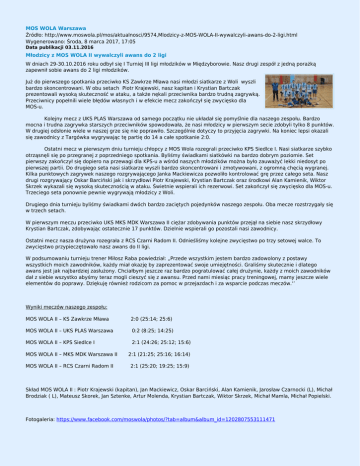 MOS WOLA Warszawa Źródło: http://www.moswola.pl/mos/aktualnosci/9574,Mlodzicy-z-MOS-WOLA-II-wywalczyli-awans-do-2-ligi.html Wygenerowano: Środa, 8 marca 2017, 17:05 Data publikacji 03.11.2016 Młodzicy z MOS WOLA II wywalczyli awans do 2 ligi W dniach 29-30.10.2016 roku odbył się I Turniej III ligi młodzików w Międzyborowie. Nasz drugi zespół z jedną porażką zapewnił sobie awans do 2 ligi młodzików. Już do pierwszego spotkania przeciwko KS Zawkrze Mława nasi młodzi siatkarze z Woli wyszli bardzo skoncentrowani. W obu setach Piotr Krajewski, nasz kapitan i Krystian Bartczak prezentowali wysoką skuteczność w ataku, a także nękali przeciwnika bardzo trudną zagrywką. Przeciwnicy popełnili wiele błędów własnych i w efekcie mecz zakończył się zwycięsko dla MOS-u. Kolejny mecz z UKS PLAS Warszawa od samego początku nie układał się pomyślnie dla naszego zespołu. Bardzo mocna i trudna zagrywka starszych przeciwników spowodowała, że nasi młodzicy w pierwszym secie zdobyli tylko 8 punktów. W drugiej odsłonie wiele w naszej grze się nie poprawiło. Szczególnie dotyczy to przyjęcia zagrywki. Na koniec lepsi okazali się zawodnicy z Targówka wygrywając tę partię do 14 a całe spotkanie 2:0. Ostatni mecz w pierwszym dniu turnieju chłopcy z MOS Wola rozegrali przeciwko KPS Siedlce I. Nasi siatkarze szybko otrząsnęli się po przegranej z poprzedniego spotkania. Byliśmy świadkami siatkówki na bardzo dobrym poziomie. Set pierwszy zakończył się dopiero na przewagi dla KPS-u a wśród naszych młodzików można było zauważyć lekki niedosyt po pierwszej partii. Do drugiego seta nasi siatkarze wyszli bardzo skoncentrowani i zmotywowani, z ogromną chęcią wygranej. Kilka punktowych zagrywek naszego rozgrywającego Janka Mackiewicza pozwoliło kontrolować grę przez całego seta. Nasz drugi rozgrywający Oskar Barciński jak i skrzydłowi Piotr Krajewski, Krystian Bartczak oraz środkowi Alan Kamienik, Wiktor Skrzek wykazali się wysoką skutecznością w ataku. Świetnie wspierali ich rezerwowi. Set zakończył się zwycięsko dla MOS-u. Trzeciego seta ponownie pewnie wygrywają młodzicy z Woli. Drugiego dnia turnieju byliśmy świadkami dwóch bardzo zaciętych pojedynków naszego zespołu. Oba mecze rozstrzygały się w trzech setach. W pierwszym meczu przeciwko UKS MKS MDK Warszawa II ciężar zdobywania punktów przejął na siebie nasz skrzydłowy Krystian Bartczak, zdobywając ostatecznie 17 punktów. Dzielnie wspierali go pozostali nasi zawodnicy. Ostatni mecz nasza drużyna rozegrała z RCS Czarni Radom II. Odnieśliśmy kolejne zwycięstwo po trzy setowej walce. To zwycięstwo przypieczętowało nasz awans do II ligi. W podsumowaniu turnieju trener Miłosz Raba powiedział: „Przede wszystkim jestem bardzo zadowolony z postawy wszystkich moich zawodników, każdy miał okazję by zaprezentować swoje umiejętności. Graliśmy skutecznie i dlatego awans jest jak najbardziej zasłużony. Chciałbym jeszcze raz bardzo pogratulować całej drużynie, każdy z moich zawodników dał z siebie wszystko abyśmy teraz mogli cieszyć się z awansu. Przed nami miesiąc pracy treningowej, mamy jeszcze wiele elementów do poprawy. Dziękuję również rodzicom za pomoc w przejazdach i za wsparcie podczas meczów.‘’ Wyniki meczów naszego zespołu: MOS WOLA II – KS Zawkrze Mława 2:0 (25:14; 25:6) MOS WOLA II – UKS PLAS Warszawa 0:2 (8:25; 14:25) MOS WOLA II – KPS Siedlce I 2:1 (24:26; 25:12; 15:6) MOS WOLA II – MKS MDK Warszawa II MOS WOLA II – RCS Czarni Radom II 2:1 (21:25; 25:16; 16:14) 2:1 (25:20; 19:25; 15:9) Skład MOS WOLA II : Piotr Krajewski (kapitan), Jan Mackiewicz, Oskar Barciński, Alan Kamienik, Jarosław Czarnocki (L), Michał Brodziak ( L), Mateusz Skorek, Jan Sztenke, Artur Molenda, Krystian Bartczak, Wiktor Skrzek, Michał Mamla, Michał Popielski. Fotogaleria: https://www.facebook.com/moswola/photos/?tab=album&album_id=1202807553111471 Komentarz (0) dodaj komentarz Brak komentarzy dodaj komentarz