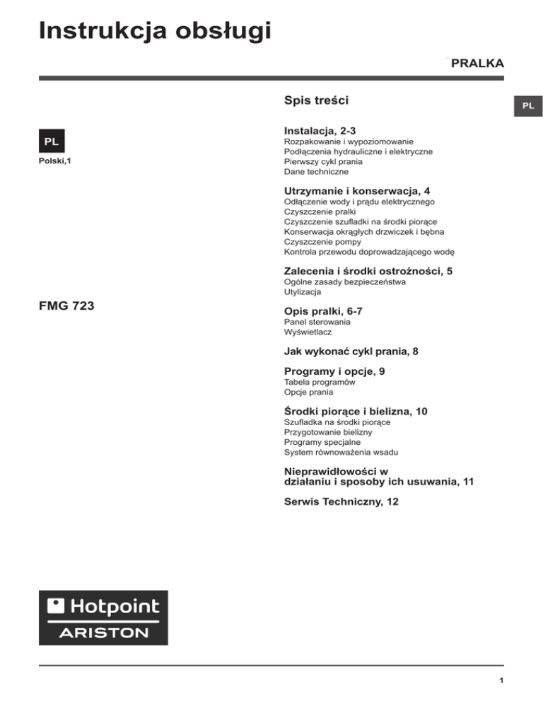 Instrukcja obsługi PRALKA Spis treści PL Polski,1 PL Instalacja, 2-3 Rozpakowanie i wypoziomowanie Podłączenia hydrauliczne i elektryczne Pierwszy cykl prania Dane techniczne Utrzymanie i konserwacja, 4 Odłączenie wody i prądu elektrycznego Czyszczenie pralki Czyszczenie szufladki na środki piorące Konserwacja okrągłych drzwiczek i bębna Czyszczenie pompy Kontrola przewodu doprowadzającego wodę Zalecenia i środki ostrożności, 5 Ogólne zasady bezpieczeństwa Utylizacja FMG 723 Opis pralki, 6-7 Panel sterowania Wyświetlacz Jak wykonać cykl prania, 8 Programy i opcje, 9 Tabela programów Opcje prania Środki piorące i bielizna, 10 Szufladka na środki piorące Przygotowanie bielizny Programy specjalne System równoważenia wsadu Nieprawidłowości w działaniu i sposoby ich usuwania, 11 Serwis Techniczny, 12 1 Instalacja PL ! Należy zachować niniejszą książeczkę, aby móc z niej skorzystać w każdej chwili. W przypadku sprzedaży, odstąpienia lub przeniesienia pralki w inne miejsce należy zadbać o przekazanie instrukcji wraz z nią, aby nowy właściciel mógł się zapoznać z działaniem urządzenia i z dotyczącymi go ostrzeżeniami. ! Należy uważnie przeczytać instrukcję obsługi: zawiera ona ważne informacje dotyczące instalacji oraz właściwego i bezpiecznego użytkowania pralki. Rozpakowanie i wypoziomowanie Rozpakowanie 1. Rozpakować pralkę. 2. Sprawdzić, czy nie doznała ona uszkodzeń w czasie transportu. W przypadku stwierdzenia uszkodzeń, nie podłączać pralki i skontaktować się ze sprzedawcą. 3. Odkręcić 4 śruby zabezpieczające urządzenie na czas transportu oraz zdjąć gumowy element z podkładką, znajdujący się w tylnej części pralki (patrz rysunek). 4. Zatkać otwory przy pomocy plastikowych zaślepek, znajdujących się w wyposażeniu urządzenia. 5. Zachować wszystkie części: w razie konieczności przewiezienia pralki w inne miejsce, powinny one zostać ponownie zamontowane. ! Części opakowania nie są zabawkami dla dzieci. Poziomowanie 1. Ustawić pralkę na płaskiej i twardej podłodze, nie opierając jej o ściany, meble itp. 2. Jeśli podłoga nie jest idealnie pozioma, należy skompensować 2 nierówności, odkręcając lub dokręcając przednie nóżki (patrz rysunek); kąt nachylenia, zmierzony na górnym blacie pralki, nie powinien przekraczać 2°. Staranne wypoziomowanie pralki zapewnia jej stabilność i zapobiega wibracjom, hałasowi oraz przesuwaniu się urządzenia w czasie pracy. W przypadku ustawienia na dywanie lub wykładzinie dywanowej, należy tak wyregulować nóżki, aby pod pralką pozostawała wolna przestrzeń niezbędna dla wentylacji. Podłączenia hydrauliczne i elektryczne Podłączenie przewodu doprowadzającego wodę 1. Podlacz przewód zasilajacy poprzez przykrecenie go do zaworu zimnej wody z koncówka gwintowana (patrz rysunek): Przed podłączeniem spuszczać wodę do momentu, aż stanie się ona całkowicie przezroczysta. 2. Podłączyć do urządzenia przewód doprowadzający wodę, przykręcając go do odpowiedniego przyłącza wody, znajdującego się w tylnej części pralki, z prawej strony u góry (patrz rysunek). 3. Zwrócić uwagę, aby przewód nie był pozaginany ani przygnieciony. ! Ciśnienie wody w kurku powinno mieścić się w przedziale podanym w tabeli Danych technicznych (patrz strona obok). ! Jeśli długość przewodu doprowadzającego wodę jest niewystarczająca, należy zwrócić się do specjalistycznego sklepu lub do autoryzowanego technika. ! Nigdy nie instalować przewodów, które były już używane. ! Stosować przewody znajdujące się w wyposażeniu urządzenia. Podłączenie przewodu odpływowego Podłączyć przewód odpływowy, nie zginając go, do rury ściekowej lub do otworu odpływowego 65 - 100 cm w ścianie, które powinny się znajdować na wysokości od 65 do 100 cm od podłogi; albo oprzeć go na brzegu zlewu lub wanny, przymocowując do kranu prowadnik, znajdujący się w wyposażeniu pralki (patrz rysunek). Wolny koniec przewodu odpływowego nie powinien być zanurzony w wodzie. ! Odradza się używanie rur przedłużających; jednak jeśli jest to konieczne, przedłużacz powinien mieć taki sam przekrój, jak oryginalna rura, a jego długość nie powinna przekraczać 150 cm. Podłączenie elektryczne Przed włożeniem wtyczki do gniazdka elektrycznego należy się upewnić, czy: • gniazdko posiada uziemienie i jest zgodne z obowiązującymi przepisami; • gniazdko jest w stanie wytrzymać maksymalne obciążenie mocy urządzenia, wskazane w tabeli Danych technicznych (patrz obok); • napięcie zasilania mieści się w wartościach wskazanych w tabeli Danych technicznych (patrz obok); • gniazdko pasuje do wtyczki pralki. W przeciwnym razie należy wymienić gniazdko lub wtyczkę. ! Nie należy instalować pralki na otwartym powietrzu, nawet w osłoniętym miejscu, gdyż wystawienie urządzenia na działanie deszczu i burz jest bardzo niebezpieczne. ! Po zainstalowaniu pralki gniazdko elektryczne powinno być łatwo dostępne. ! Nie używać przedłużaczy ani rozgałęźników. ! Kabel nie powinien być pozginany ani przygnieciony. ! Przewód zasilania elektrycznego może być wymieniany wyłącznie przez autoryzowanych techników. Uwaga! Producent nie ponosi żadnej odpowiedzialności, jeśli powyższe zasady nie będą przestrzegane. Pierwszy cykl prania Po zainstalowaniu pralki, przed przystąpieniem do jej użytkowania, należy wykonać jeden cykl prania ze środkiem piorącym, ale bez wsadu, nastawiając program opcja czyszczenia pralki (patrz “Czyszczenie pralki”). Dane techniczne Model FMG 723 Wymiary szerokość cm 59,5 wysokość cm 85 głębokość cm 54 Pojemność od 1 do 7 kg Dane prądu elektrycznego dane techniczne umieszczone są na tabliczce na maszynie Dane sieci wodociągowej Maksymalne ciśnienie 1 MPa (10 barów) ciśnienie minimalne 0,05 MPa (0,5 barów) pojemność bębna 52 litrów Szybkość wi