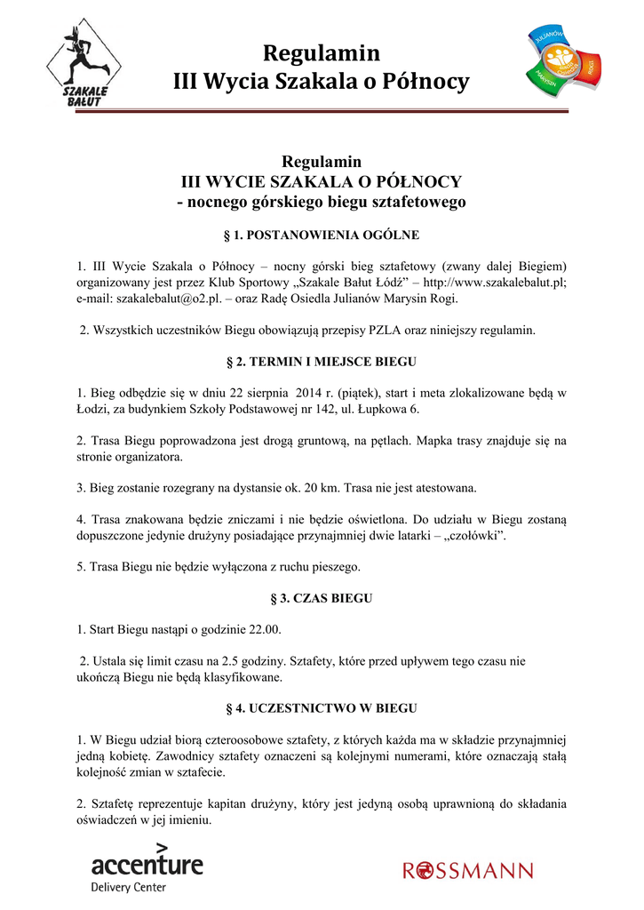 Regulamin III Wycia Szakala o Północy Regulamin III WYCIE SZAKALA O PÓŁNOCY - nocnego górskiego biegu sztafetowego § 1. POSTANOWIENIA OGÓLNE 1. III Wycie Szakala o Północy – nocny górski bieg sztafetowy (zwany dalej Biegiem) organizowany jest przez Klub Sportowy „Szakale Bałut Łódź” – http://www.szakalebalut.pl; e-mail: [email protected]. – oraz Radę Osiedla Julianów Marysin Rogi. 2. Wszystkich uczestników Biegu obowiązują przepisy PZLA oraz niniejszy regulamin. § 2. TERMIN I MIEJSCE BIEGU 1. Bieg odbędzie się w dniu 22 sierpnia 2014 r. (piątek), start i meta zlokalizowane będą w Łodzi, za budynkiem Szkoły Podstawowej nr 142, ul. Łupkowa 6. 2. Trasa Biegu poprowadzona jest drogą gruntową, na pętlach. Mapka trasy znajduje się na stronie organizatora. 3. Bieg zostanie rozegrany na dystansie ok. 20 km. Trasa nie jest atestowana. 4. Trasa znakowana będzie zniczami i nie będzie oświetlona. Do udziału w Biegu zostaną dopuszczone jedynie drużyny posiadające przynajmniej dwie latarki – „czołówki”. 5. Trasa Biegu nie będzie wyłączona z ruchu pieszego. § 3. CZAS BIEGU 1. Start Biegu nastąpi o godzinie 22.00. 2. Ustala się limit czasu na 2.5 godziny. Sztafety, które przed upływem tego czasu nie ukończą Biegu nie będą klasyfikowane. § 4. UCZESTNICTWO W BIEGU 1. W Biegu udział biorą czteroosobowe sztafety, z których każda ma w składzie przynajmniej jedną kobietę. Zawodnicy sztafety oznaczeni są kolejnymi numerami, które oznaczają stałą kolejność zmian w sztafecie. 2. Sztafetę reprezentuje kapitan drużyny, który jest jedyną osobą uprawnioną do składania oświadczeń w jej imieniu. Regulamin III Wycia Szakala o Północy 3. Zawodnicy sztafety startują w strojach jednego koloru, wskazanego w zgłoszeniu. 4. W Biegu startować mogą osoby, które najpóźniej w dniu zawodów ukończą 18 lat. 5. W dniu Biegu, sztafety i zawodnicy zostaną zweryfikowani w lotnym Biurze zawodów w godzinach 20:30-21:30. Biuro Zawodów mieścić się będzie na parkingu przy ul. Łupkowej. 6. Warunkiem dopuszczenia zawodnika do Biegu jest okazanie dokumentu tożsamości oraz złożenie podpisu pod oświadczeniem o zdolności do udziału w Biegu albo przedstawienie zaświadczenia lekarskiego o braku przeciwwskazań do udziału w biegu maratońskim. Warunkiem dopuszczenia sztafety jest dopuszczenie wszystkich jej zawodników. 7. Podczas Biegu zawodnik musi mieć numer startowy przymocowany do przedniej części koszulki. Zasłanianie numeru startowego lub jego modyfikacja jest zabronione i skutkuje dyskwalifikacją sztafety. § 5. ZASADY BIEGU 1. Bieg rozgrywany jest systemem 8 x 4 x 610 m., co oznacza, że zawodnicy sztafety pokonują kolejno pętlę liczącą około 610 m., a po jej ukończeniu przez każdego z zawodników sztafety pokonują ją ponownie w tej samej kolejności – i tak ośmiokrotnie. 2. Zawodnicy sztafety otrzymują numery startowe z oznaczeniem numeru drużyny oraz numerem zmiany, na której startuje dany zawodnik. 3. Zawodnicy sztafety startują w kolejności wynikającej z numerów startowych, jakiekolwiek odstępstwa od tej kolejności są niedopuszczalne i skutkują dyskwalifikacją drużyny. 4. Zmiany dokonywane są przez przekazanie pałeczki w oznaczonej strefie zmian. Nieprzekazanie pałeczki lub istotne przekroczenie granic strefy zmian skutkuje dyskwalifikacją sztafety. 5. Warunkiem odnotowania zmiany w sztafecie jest zgłoszenie się zawodnika, który przekazał pałeczkę do sędziego zawodów bezpośrednio po dokonaniu zmiany. 6. Drużyny liczące więcej niż jedną kobietę startują o 2 minuty wcześniej niż pozostałe drużyny, przy czym za każdą dodatkową kobietę udzielna jest kolejna dwuminutowa bonifikata czasowa. Regulamin III Wycia Szakala o Północy § 6. ZGŁOSZENIA 1. Zgłoszenia sztafet do udziału w biegu dokonywane są za pomocą formularza zgłoszeniowego dostępnego na stronie internetowej organizatora – przesłanego na adres mailowy organizatora najpóźniej do dnia 18 sierpnia 2014 r.; po tej dacie zgłoszenia sztafet nie będą przyjmowane. 2. Zgłoszenie sztafety powinno zawierać wskazanie jej nazwy i przynajmniej kapitana drużyny; nazwiska pozostałych zawodników mogą być podane w dniu startu (a podane wcześniej składy sztafet mogą być zmieniane) – najpóźniej na godzinę przed zawodami. 3. Za zgłoszenie do Biegu uważa się doręczenie wypełnionego formularza zgłoszenia i uiszczenie opłaty startowej. Zgłoszenia dokonane przez internet zostaną podpisane przez zawodników najpóźniej przy weryfikacji w biurze zawodów. 4. Ustala się limit ilości sztafet na 25. W przypadku przekroczenia limitu decydująca będzie data zaksięgowania opłaty startowej, a przypadki sporne będą rozstrzygane przez losowanie przeprowadzone przez Dyrektora Biegu. § 7. KLASYFIKACJE 1. Podczas Biegu prowadzona będzie jedynie klasyfikacja drużynowa sztafet. 2. Inne klasyfikacje drużynowe mogą być prowadzone, gdy organizator Biegu tak postanowi. 3. Organizator nie wyklucza przyznawania nagród rzeczowych, także w formie losowania wśród zawodników, którzy wezmą udział w Biegu. § 8. NAGRODY 1. Sztafety, które zdobędą miejsca od 1. do 6. zostaną nagrodzone pucharami. 2. Każda ze sztafet otrzyma pamiątkowy dyplom. § 9. OPŁATA STARTOWA 1. Warunkiem uczestnictwa w Biegu jest wniesienie opłaty startowej. 2. Wysokość opłaty startowej za udział całej sztafety wynosi: a) do 7 sierpnia 2014 r. – 100 zł; b) od 8 sierpnia 2013 r. – 140 zł. Regulamin III Wycia Szakala o Północy O wysokości wpisowego decyduje termin wpłaty, a nie data przesłania zgłoszenia udziału w Biegu 3. Opłatę należy wpłacać na konto bankowe organizatora: 46 1140 2017 0000 4102 1138 8156 Klub Sportowy Szakale Bałut Łódź (w tytule: wpisowe za Wycie Szakala od sztafety …..) 4. Dowodem wpłynięcia opłaty jest wydrukowane potwierdzenie zapłaty przelewu bankowego lub prz