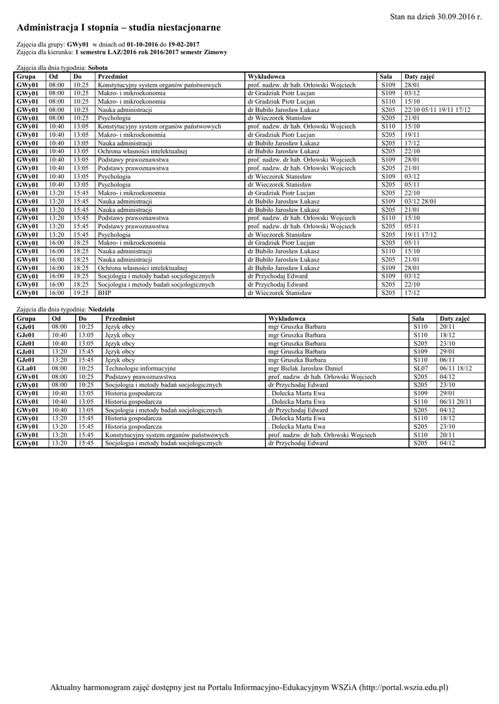 Stan na dzień 30.09.2016 r. Administracja I stopnia – studia niestacjonarne Zajęcia dla grupy: GWy01 w dniach od 01-10-2016 do 19-02-2017 Zajęcia dla kierunku: 1 semestru LAZ/2016 rok 2016/2017 semestr Zimowy Zajęcia dla dnia tygodnia: Sobota Grupa Od Do Przedmiot 08:00 10:25 Konstytucyjny system organów państwowych GWy01 08:00 10:25 Makro- i mikroekonomia GWy01 08:00 10:25 Makro- i mikroekonomia GWy01 08:00 10:25 Nauka administracji GWy01 08:00 10:25 Psychologia GWy01 10:40 13:05 Konstytucyjny system organów państwowych GWy01 10:40 13:05 Makro- i mikroekonomia GWy01 10:40 13:05 Nauka administracji GWy01 10:40 13:05 Ochrona własności intelektualnej GWy01 10:40 13:05 Podstawy prawoznawstwa GWy01 10:40 13:05 Podstawy prawoznawstwa GWy01 10:40 13:05 Psychologia GWy01 10:40 13:05 Psychologia GWy01 13:20 15:45 Makro- i mikroekonomia GWy01 13:20 15:45 Nauka administracji GWy01 13:20 15:45 Nauka administracji GWy01 13:20 15:45 Podstawy prawoznawstwa GWy01 13:20 15:45 Podstawy prawoznawstwa GWy01 13:20 15:45 Psychologia GWy01 16:00 18:25 Makro- i mikroekonomia GWy01 16:00 18:25 Nauka administracji GWy01 16:00 18:25 Nauka administracji GWy01 16:00 18:25 Ochrona własności intelektualnej GWy01 16:00 18:25 Socjologia i metody badań socjologicznych GWy01 16:00 18:25 Socjologia i metody badań socjologicznych GWy01 16:00 19:25 BHP GWy01 Zajęcia dla dnia tygodnia: Niedziela Grupa Od Do Przedmiot 08:00 10:25 Język obcy GJe01 10:40 13:05 Język obcy GJe01 10:40 13:05 Język obcy GJe01 13:20 15:45 Język obcy GJe01 13:20 15:45 Język obcy GJe01 08:00 10:25 Technologie informacyjne GLa01 08:00 10:25 Podstawy prawoznawstwa GWy01 08:00 10:25 Socjologia i metody badań socjologicznych GWy01 10:40 13:05 Historia gospodarcza GWy01 10:40 13:05 Historia gospodarcza GWy01 10:40 13:05 Socjologia i metody badań socjologicznych GWy01 13:20 15:45 Historia gospodarcza GWy01 13:20 15:45 Historia gospodarcza GWy01 13:20 15:45 Konstytucyjny system organów państwowych GWy01 13:20 15:45 Socjologia i metody badań socjologicznych GWy01 Wykładowca prof. nadzw. dr hab. Orłowski Wojciech dr Gradziuk Piotr Lucjan dr Gradziuk Piotr Lucjan dr Bubiło Jarosław Łukasz dr Wieczorek Stanisław prof. nadzw. dr hab. Orłowski Wojciech dr Gradziuk Piotr Lucjan dr Bubiło Jarosław Łukasz dr Bubiło Jarosław Łukasz prof. nadzw. dr hab. Orłowski Wojciech prof. nadzw. dr hab. Orłowski Wojciech dr Wieczorek Stanisław dr Wieczorek Stanisław dr Gradziuk Piotr Lucjan dr Bubiło Jarosław Łukasz dr Bubiło Jarosław Łukasz prof. nadzw. dr hab. Orłowski Wojciech prof. nadzw. dr hab. Orłowski Wojciech dr Wieczorek Stanisław dr Gradziuk Piotr Lucjan dr Bubiło Jarosław Łukasz dr Bubiło Jarosław Łukasz dr Bubiło Jarosław Łukasz dr Przychodaj Edward dr Przychodaj Edward dr Wieczorek Stanisław Wykładowca mgr Gruszka Barbara mgr Gruszka Barbara mgr Gruszka Barbara mgr Gruszka Barbara mgr Gruszka Barbara mgr Bielak Jarosław Daniel prof. nadzw. dr hab. Orłowski Wojciech dr Przychodaj Edward . Dolecka Marta Ewa . Dolecka Marta Ewa dr Przychodaj Edward . Dolecka Marta Ewa . Dolecka Marta Ewa prof. nadzw. dr hab. Orłowski Wojciech dr Przychodaj Edward Sala S109 S109 S110 S205 S205 S110 S205 S205 S205 S109 S205 S109 S205 S205 S109 S205 S110 S205 S205 S205 S110 S205 S109 S109 S205 S205 Daty zajęć 28/01 03/12 15/10 22/10 05/11 19/11 17/12 21/01 15/10 19/11 17/12 22/10 28/01 21/01 03/12 05/11 22/10 03/12 28/01 21/01 15/10 05/11 19/11 17/12 05/11 15/10 21/01 28/01 03/12 22/10 17/12 Sala S110 S110 S205 S109 S110 SL07 S205 S205 S109 S110 S205 S110 S205 S110 S205 Daty zajęć 20/11 18/12 23/10 29/01 06/11 06/11 18/12 04/12 23/10 29/01 06/11 20/11 04/12 18/12 23/10 20/11 04/12 Aktualny harmonogram zajęć dostępny jest na Portalu Informacyjno-Edukacyjnym WSZiA (http://portal.wszia.edu.pl)