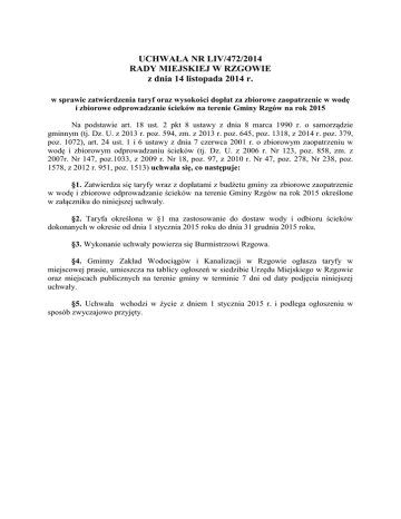 UCHWAŁA NR LIV/472/2014 RADY MIEJSKIEJ W RZGOWIE z dnia 14 listopada 2014 r. w sprawie zatwierdzenia taryf oraz wysokości dopłat za zbiorowe zaopatrzenie w wodę i zbiorowe odprowadzanie ścieków na terenie Gminy Rzgów na rok 2015 Na podstawie art. 18 ust. 2 pkt 8 ustawy z dnia 8 marca 1990 r. o samorządzie gminnym (tj. Dz. U. z 2013 r. poz. 594, zm. z 2013 r. poz. 645, poz. 1318, z 2014 r. poz. 379, poz. 1072), art. 24 ust. 1 i 6 ustawy z dnia 7 czerwca 2001 r. o zbiorowym zaopatrzeniu w wodę i zbiorowym odprowadzaniu ścieków (tj. Dz. U. z 2006 r. Nr 123, poz. 858, zm. z 2007r. Nr 147, poz.1033, z 2009 r. Nr 18, poz. 97, z 2010 r. Nr 47, poz. 278, Nr 238, poz. 1578, z 2012 r. 951, poz. 1513) uchwala się, co następuje: §1. Zatwierdza się taryfy wraz z dopłatami z budżetu gminy za zbiorowe zaopatrzenie w wodę i zbiorowe odprowadzanie ścieków na terenie Gminy Rzgów na rok 2015 określone w załączniku do niniejszej uchwały. §2. Taryfa określona w §1 ma zastosowanie do dostaw wody i odbioru ścieków dokonanych w okresie od dnia 1 stycznia 2015 roku do dnia 31 grudnia 2015 roku. §3. Wykonanie uchwały powierza się Burmistrzowi Rzgowa. §4. Gminny Zakład Wodociągów i Kanalizacji w Rzgowie ogłasza taryfy w miejscowej prasie, umieszcza na tablicy ogłoszeń w siedzibie Urzędu Miejskiego w Rzgowie oraz miejscach publicznych na terenie gminy w terminie 7 dni od daty podjęcia niniejszej uchwały. §5. Uchwała wchodzi w życie z dniem 1 stycznia 2015 r. i podlega ogłoszeniu w sposób zwyczajowo przyjęty. Załącznik do Uchwały Nr LIV/472/2014 Rady Miejskiej w Rzgowie z dnia 14 listopada 2014 r. Wysokość cen i opłat za dostarczaną wodę i odprowadzane ścieki z uwzględnieniem dopłat z budżetu Gminy Rzgów obowiązujących na 2015 rok Wysokość cen za dostarczaną wodę: I Grupa taryfowa -pobierający wodę na cele socjalno-bytowe (gospodarstwa domowe i jednostki: oświaty, kultury, sportu, ochrony zdrowia, opieki społecznej, administracji, gospodarstwa rolne i ogrodnicze) Cena za 1m³ wody Dopłata z budżetu Gminy do 1m³ wody Cena 1m³ wody 2,88 zł/m³ 0,15 zł/m³ 2,73 zł/m³ II Grupa taryfowa - pobierający wodę na cele pozostałe Cena za 1m³ wody 2,91 zł/m³ Wysokość cen za odprowadzone ścieki : I Grupa taryfowa - odbiorcy odprowadzający ścieki socjalno-bytowe (gospodarstwa domowe i jednostki: oświaty, kultury, sportu, ochrony zdrowia, opieki społecznej, administracji, gospodarstwa rolne i ogrodnicze) Cena za 1m³ ścieków Dopłata z budżetu Gminy do 1m³ ścieków Cena 1m³ ścieków 5,00 zł/m³ 0,70 zł/m³ 4,30 zł/m³ II Grupa taryfowa - odbiorcy odprowadzający ścieki przemysłowe Cena za 1m³ ścieków Do stawek należy doliczyć podatek VAT w wysokości 8%. 5,00 zł/m³