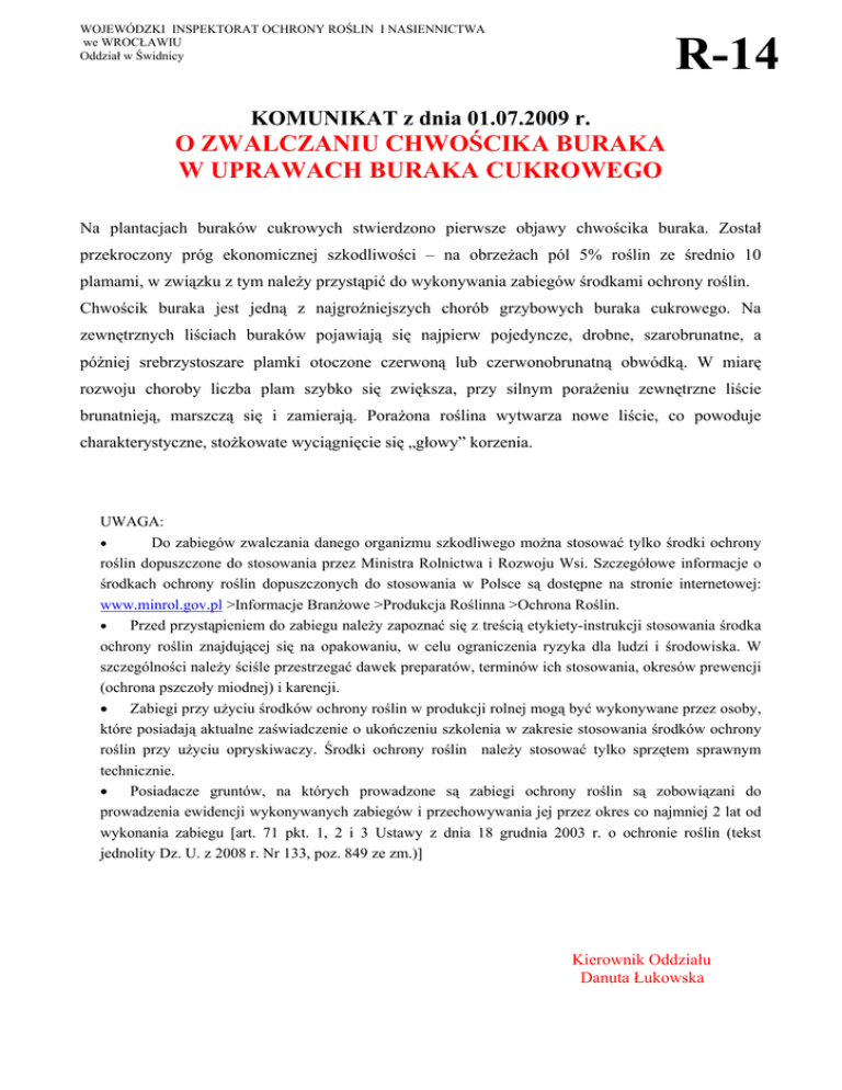 WOJEWÓDZKI INSPEKTORAT OCHRONY ROŚLIN I NASIENNICTWA we WROCŁAWIU Oddział w Świdnicy R-14 KOMUNIKAT z dnia 01.07.2009 r. O ZWALCZANIU CHWOŚCIKA BURAKA W UPRAWACH BURAKA CUKROWEGO Na plantacjach buraków cukrowych stwierdzono pierwsze objawy chwościka buraka. Został przekroczony próg ekonomicznej szkodliwości – na obrzeżach pól 5% roślin ze średnio 10 plamami, w związku z tym należy przystąpić do wykonywania zabiegów środkami ochrony roślin. Chwościk buraka jest jedną z najgroźniejszych chorób grzybowych buraka cukrowego. Na zewnętrznych liściach buraków pojawiają się najpierw pojedyncze, drobne, szarobrunatne, a później srebrzystoszare plamki otoczone czerwoną lub czerwonobrunatną obwódką. W miarę rozwoju choroby liczba plam szybko się zwiększa, przy silnym porażeniu zewnętrzne liście brunatnieją, marszczą się i zamierają. Porażona roślina wytwarza nowe liście, co powoduje charakterystyczne, stożkowate wyciągnięcie się „głowy” korzenia. UWAGA: • Do zabiegów zwalczania danego organizmu szkodliwego można stosować tylko środki ochrony roślin dopuszczone do stosowania przez Ministra Rolnictwa i Rozwoju Wsi. Szczegółowe informacje o środkach ochrony roślin dopuszczonych do stosowania w Polsce są dostępne na stronie internetowej: www.minrol.gov.pl >Informacje Branżowe >Produkcja Roślinna >Ochrona Roślin. • Przed przystąpieniem do zabiegu należy zapoznać się z treścią etykiety-instrukcji stosowania środka ochrony roślin znajdującej się na opakowaniu, w celu ograniczenia ryzyka dla ludzi i środowiska. W szczególności należy ściśle przestrzegać dawek preparatów, terminów ich stosowania, okresów prewencji (ochrona pszczoły miodnej) i karencji. • Zabiegi przy użyciu środków ochrony roślin w produkcji rolnej mogą być wykonywane przez osoby, które posiadają aktualne zaświadczenie o ukończeniu szkolenia w zakresie stosowania środków ochrony roślin przy użyciu opryskiwaczy. Środki ochrony roślin należy stosować tylko sprzętem sprawnym technicznie. • Posiadacze gruntów, na których prowadzone są zabiegi ochrony roślin są zobowiązani do prowadzenia ewidencji wykonywanych zabiegów i przechowywania jej przez okres co najmniej 2 lat od wykonania zabiegu [art. 71 pkt. 1, 2 i 3 Ustawy z dnia 18 grudnia 2003 r. o ochronie roślin (tekst jednolity Dz. U. z 2008 r. Nr 133, poz. 849 ze zm.)] Kierownik Oddziału Danuta Łukowska