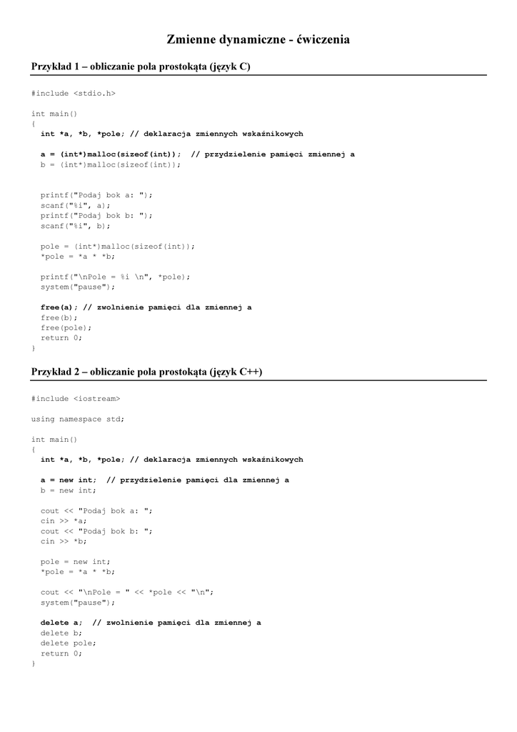 Przykład 1 – obliczanie pola prostokąta (język C)