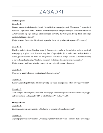 ZAGADKI Matematyczne Zagadka 1. Dawno temu mieszkało tutaj 4 dzieci. Urodzili się w następujące dni: 23 czerwca, 7 stycznia, 8 stycznia i 8 grudnia. Anna i Monika urodziły się w tym samym miesiącu. Natomiast Monika i Artur urodzili się tego samego dnia miesiąca. Czwarty był Grzegorz. Podaj dzień i miesiąc urodzin każdego z dzieci.” [Odp.: Anna – 7 stycznia; Monika - 8 stycznia; Artur – 8 grudnia, Grzegorz – 23 czerwca] Zagadka 2. Każde z dzieci: Anna, Monika, Artur i Grzegorz trzymało w domu jedno zwierzę spośród następujących: pies, orzeł, kanarek, wąż boa. Odgadnijcie, jakie zwierzątko hoduje każde z dzieci, jeśli wiadomo, że: Anna nie lubi ptaków. Monika nie hoduje kanarka. Artur ma zwierzę o największej liczbie nóg. Wiadomo również, że każde z dzieci ma inne zwierzątko.” [Odp.: Anna – wąż boa; Monika – orzeł; Artur – pies; Grzegorz – kanarek] Zagadka 3. Co waży więcej: kilogram gwoździ czy kilogram puchu? Zagadka 4. Kasia wypełniła pół butelki 2-litrowej wodą. Ile wody musi jeszcze wlać, żeby ją wypełnić? Zagadka 5. Tata Małgosi lubił zagadki, więc PIN do swojego telefonu zapisał w swoim notesie używając cyfr rzymskich. Odkryj cyfry PIN-u taty Małgosi: V, II, IV, VII, IX Ortograficzne Zagadka 1. Zapisz poprawnie rozwiązanie: „Kto brzmi w trzcinie w Szczebrzeszynie?” Zagadka 2. Zapisz poprawnie rozwiązanie: „Wszyscy pięknie w nim śpiewają i szeroko buzie otwierają”. Zagadka 3. Zapisz poprawnie rozwiązanie: „Jest takie zwierzę, co rusza się wolno i nosi silne pancerze, choć nie jest rycerzem”. Zagadka 4. Zapisz poprawnie rozwiązanie: „On tam pracuje, gdzie leki kupujesz”. Zagadka 5. Zapisz poprawnie rozwiązanie: „W szufladzie ze sztućcami, najlepsza do kawy albo do herbaty”.