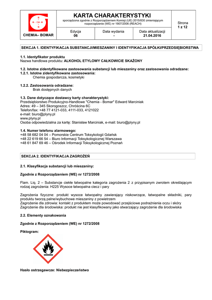 KARTA CHARAKTERYSTYKI sporządzona zgodnie z Rozporządzeniem Komisji (UE) 2015/830 zmieniającym rozporządzenie (WE) nr 1907/2006 (REACH) CHEMIA– BOMAR Edycja 06 Data wydania - Strona 1 z 12 Data aktualizacji 21.04.2016 SEKCJA 1. IDENTYFIKACJA SUBSTANCJI/MIESZANINY I IDENTYFIKACJA SPÓŁKI/PRZEDSIĘBIORSTWA 1.1. Identyfikator produktu Nazwa handlowa produktu: ALKOHOL ETYLOWY CAŁKOWICIE SKAŻONY 1.2. Istotne zidentyfikowane zastosowania substancji lub mieszaniny oraz zastosowania odradzane: 1.2.1. Istotne zidentyfikowane zastosowania: Chemia gospodarcza, kosmetyki 1.2.2. Zastosowania odradzane: Brak dostępnych danych 1.3. Dane dotyczące dostawcy karty charakterystyki: Przedsiębiorstwo Produkcyjno-Handlowe "Chemia - Bomar" Edward Marciniak Adres: 49 – 345 Skorogoszcz, Chróścina 6C Telefon/fax: +48 77 4121-033, 4111-033, 4121022 e-mail: [email protected] www.plyny.pl Osoba odpowiedzialna za kartę: Stanisław Marciniak, e-mail: [email protected] 1.4. Numer telefonu alarmowego: +48 58 682 04 04 – Pomorskie Centrum Toksykologii Gdańsk +48 22 619 66 54 – Biuro Informacji Toksykologicznej Warszawa +48 61 847 69 46 – Ośrodek Informacji Toksykologicznej Poznań SEKCJA 2. IDENTYFIKACJA ZAGROŻEŃ 2.1. Klasyfikacja substancji lub mieszaniny: Zgodnie z Rozporządzeniem (WE) nr 1272/2008 Flam. Liq. 2 – Substancje ciekłe łatwopalne kategoria zagrożenia 2 z przypisanym zwrotem określającym rodzaj zagrożenia: H225 Wysoce łatwopalna ciecz i pary Zagrożenia fizyczne: produkt wysoce łatwopalny zawierający niskowrzące, łatwopalne składniki, pary produktu tworzą palne/wybuchowe mieszaniny z powietrzem Zagrożenie dla zdrowia: kontakt z produktem może powodować przejściowe podrażnienia oczu i skóry Zagrożenie dla środowiska: produkt nie jest klasyfikowany jako stwarzający zagrożenie dla środowiska 2.2. Elementy oznakowania Zgodnie z Rozporządzeniem (WE) nr 1272/2008 Piktogram: Hasło ostrzegawcze: Niebezpieczeństwo KARTA CHARAKTERYSTYKI sporządzona zgodnie z Rozporządzeniem Komisji (UE) 2015/830 zmieniającym rozporządzenie (WE) nr 1907/2006 (REACH) CHEMIA– BOMAR Edycja 06 Data wydania - Strona 2 z 12 Data aktualizacji 21.04.2016 Zwroty H określające rodzaj zagrożenia H225 Wysoce łatwopalna ciecz i pary Zwroty P określające środki ostrożności Ogólne: P102 Chronić przed dziećmi Zapobieganie: P210 Przechowywać z dala od źródeł ciepła, gorących powierzchni, źródeł iskrzenia, otwartego ognia i innych źródeł zapłonu. Nie palić. Reagowanie: P303 + P361 + P353 W PRZYPADKU KONTAKTU ZE SKÓRĄ (lub z włosami): Natychmiast zdjąć całą zanieczyszczoną odzież. Spłukać skórę pod strumieniem wody/prysznicem. P370 + P378 W przypadku pożaru: Użyć pian gaśniczych odpornych na alkohol, CO 2, suchych proszków lub mgły wodnej do gaszenia Przechowywanie: P403 + P235 Przechowywać w dobrze wentylowanym miejscu. Przechowywać w chłodnym miejscu P233 Przechowywać pojemnik szczelnie zamknięty. Usuwanie: P501 Zawartość/pojemnik usuwać do firm posiadających odpowiednie uprawnienia, zgodnie z krajowymi/międzynarodowymi przepisami 2.3. Inne zagrożenia: Produkt nie spełnia kryteriów PBT lub vPvB zgodnie z załącznikiem XIII rozporządzenia REACH. SEKCJA 3. SKŁAD/INFORMACJA O SKŁADNIKACH 3.1. Substancje Nie dotyczy 3.2. Mieszaniny Produkt jest mieszaniną. Skład: etanol, substancje pomocnicze, mieszanina środków skażających: keton metylowo-izopropylowy nr CAS 563-80-4 keton etylowo-sec-amylowy nr CAS 541-85-5 keton etylowo-metylowy nr CAS 78-93-3 denatonium benzoate nr CAS 3734-33-6 Klasyfikację substancji stwarzających zagrożenie zawartych w produkcie podano zgodnie z tabelą 3.1 załącznika VI do Rozporządzenia Parlamentu Europejskiego i Rady (WE) nr 1272/2008 z uwzględnieniem jego aktualizacji, danych REACH, danych dostarczonych przez producenta oraz danych literaturowych. Nr CAS Nr WE Nr indeksowy REACH numer rejestracyjny Nazwa chemiczna 64-17-5 200-578-6 603-002-00-5 01-211945761043-xxxx etanol* Zawartość Kategorie zagrożenia > 90 % wag. Flam. Liq. 2 Zwroty H H225 * - substancja, dla której określono wspólnotowe najwyższe dopuszczalne stężenia w środowisku pracy Znaczenie kategorii zagrożenia oraz zwrotów H patrz sekcja 16. KARTA CHARAKTERYSTYKI sporządzona zgodnie z Rozporządzeniem Komisji (UE) 2015/830 zmieniającym rozporządzenie (WE) nr 1907/2006 (REACH) CHEMIA– BOMAR Edycja 06 Data wydania - Strona 3 z 12 Data aktualizacji 21.04.2016 SEKCJA 4. ŚRODKI PIERWSZEJ POMOCY 4.1. Opis środków pierwszej pomocy Zalecenia ogólne: W przypadku kontaktu z produktem wywołującym niedyspozycję natychmiast wezwać zawodową służbę zdrowia. Pokazać lekarzowi oznakowanie z karty charakterystyki produktu. Poinformować lekarza o udzielonej pierwszej pomocy poszkodowanemu. Nie podawać niczego doustnie osobie nieprzytomnej. Ochrona osób udzielających pierwszej pomocy: Nie należy podejmować żadnych działań, które stwarzałyby ryzyko dla kogokolwiek chyba, że jest się odpowiednio przeszkolonym. Odzież zanieczyszczoną produktem należy niezwłocznie usunąć. Skażenie skóry: Zdjąć zanieczyszczoną odzież. Skażoną skórę umyć dokładnie wodą. Skażenie oczu: Przemywać odpowiednim płynem do przemywania oczu lub czystą wodą, utrzymując powieki otwarte, przez co najmniej 10 minut. Usunąć soczewki kontaktowe, jeżeli poszkodowany je nosi. Jeżeli podrażnienie się utrzymuje skontaktować się z lekarzem. Narażenie inhalacyjne: Usunąć poszkodowanego z miejsca narażenia na świeże powietrze, co w większości przypadków powinno być wystarczające. W przypadku złego samopoczucia zapewnić pomoc lekarską. Spożycie: Natychmiast po połknięciu, osobie przytomnej, podać do wypicia dużą ilości wody. Wymioty prowokować jedynie w obecności wykwalifikowanego personelu medycznego. Zapewnić pomoc lekarską. 4.2. Najważniejsze ostre i opóźnione objawy oraz skutki narażenia Os