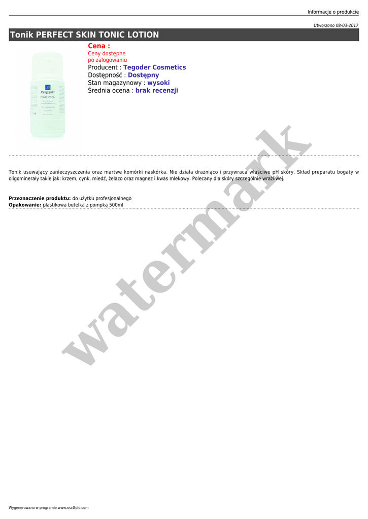 Informacje o produkcie Utworzono 08-03-2017 Tonik PERFECT SKIN TONIC LOTION Cena : Ceny dostępne po zalogowaniu er m ar k Producent : Tegoder Cosmetics Dostępność : Dostępny Stan magazynowy : wysoki Średnia ocena : brak recenzji Tonik usuwający zanieczyszczenia oraz martwe komórki naskórka. Nie działa drażniąco i przywraca właściwe pH skóry. Skład preparatu bogaty w oligominerały takie jak: krzem, cynk, miedź, żelazo oraz magnez i kwas mlekowy. Polecany dla skóry szczególnie wrażliwej. w at Przeznaczenie produktu: do użytku profesjonalnego Opakowanie: plastikowa butelka z pompką 500ml Wygenerowano w programie www.oscGold.com