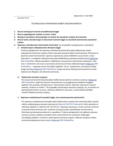 …………………………………….. Załącznik nr 4 do SIWZ (pieczątka firmy) TECHNOLOGIA WYKONANIA ROBÓT BUDOWLANNYCH 1. 2. 3. 4. Skucie istniejących warstw posadzkowych loggii Skucie odpadających tynków ze ścian i sufitu Wycięcie styropianu elewacyjnego na ścianie do wysokości wejścia do mieszkań Skucie tynku zewnętrznego na bocznych ścianach loggii na wysokość planowanej wysokości cokołu. 5. Naprawa uszkodzonych elementów konstrukcji (w przypadku występowania uszkodzeń) a) Antykorozyjne zabezpieczenie zbrojenia loggii Przed przystąpieniem do naprawy uszkodzonej konstrukcji płyty balkonowej należy zabezpieczyć elementy stalowe, które stanowią zbrojenie płyty konstrukcyjnej. Elementy te powinny przed naniesieniem zaprawy naprawczej zostać dokładnie oczyszczone z rdzy i zabrudzeń, a następnie zabezpieczone jednoskładnikową zaprawą antykorozyjną Disbocret 502 ProtectPlus. Należy pamiętać o dokładnym oczyszczeniu elementów stalowych z rdzy oraz o naniesieniu zaraz po oczyszczeniu pierwszej warstwy zabezpieczającej Disbocret 502 ProtectPlus. – zaprawę nanosi się obficie pędzlem. Po ok. 4 godzinach, nanoszona zostaje druga warstwa Disbocret 502 ProtectPlus. Druga warstwa zabezpieczenia powinna zostać nałożona do 48 godz. od nałożenia pierwszej. b) Wykonanie warstwy sczepnej Na oczyszczonej konstrukcyjnej płycie balkonowej wykonać warstwę sczepną z Disbocret 502 ProtectPlus. Materiał nanosić równomiernie na przygotowane podłoże okrągłym pędzlem lub szczotką. Zamykać pory i intensywnie wcierać. Zaprawy naprawcze nanosić metodą „mokrym w mokre”. W przypadku wyschnięcia warstwy sczepnej, np. na skutek nie planowanych przerw w pracy, należy ją całkowicie wysuszyć, a przed dalszą obróbką nanieść kolejną warstwę sczepną. c) Naprawa uszkodzonych krawędzi loggii, oraz wyrównywanie powierzchni Do naprawy uszkodzonych krawędzi płyty balkonowej i powierzchni poziomej płyty używać należy szybkowiążącą zaprawę naprawczą Disbocret 545 PCC Feinmortel, która pozwala na naprawę ubytków w zakresie od 4 do 40 mm. Zaprawę naprawczą można nanosić zarówno na powierzchnie pionowe, jak i poziome stosując ją jako szpachlówkę wyrównawczą. Warstwę wyrównawczą wykonać ze spadkiem. Przed przystąpieniem do aplikacji zaprawy musimy usunąć z podłoża wszystkie luźne części betonu do uzyskania stabilnego i szorstkiego podłoża, na którym wykonujemy warstwę sczepną. Odkryte zbrojenie należy wcześniej zabezpieczyć przy użyciu Disbocret 502 ProtectPlus. 6. Wykonanie warstwy spadkowej Ułożenie warstwy spadkowej z gotowej zaprawy (np: BORNIT E) o wytrzymałości min C 20/25 – minimalny spadek 1,5% (uwaga: konieczność dostosowania wszystkich wymaganych warstw do wejścia do pomieszczeń) 7. Wykonanie obróbek blacharskich wzdłuż czoła loggii z blachy tytanowo – cynkowej o grubości min 0,5 na zakład (połączenie blach podklejone i uszczelnione) z wywinięciem na ściany loggii. Mocowanie mechaniczne blachy do powierzchni balkonu. 8. Wykonanie warstwy hydroizolacji mineralnej Warstwę hydroizolacji wykonać za pomocą mineralnej zaprawy dwuskładnikowej (np. BORNIT ES) nakładanej w dwóch etapach technologicznych. Łączna grubość warstw 3 mm. Izolacja wykonywana na płycie wraz z wywinięciem na ściany loggii na wskazaną wysokość (min 30 cm). Na styku ściany z płytą balkonowa i połączeniu z obróbką blacharską wtopić taśmy uszczelniające (np. BORNIT FB+ lub BORNIT FBB). Pierwsza warstwa hydroizolacji powinna być możliwie najcieńsza i wtarta na ostro (gładką stalową pacą) w odpowiednio przygotowane wcześniej podłoże tak, aby masa dokładnie wypełniła wszystkie pory znajdujące się na jego powierzchni. 9. Montaż okładziny ceramicznej i spoinowanie Płytka powinna być wypełniona zaprawą w 100%. Nie dopuszcza się klejenia na tzw. „PLACKI”. Klej elastyczny i odporny na warunki atmosferyczne (np. BORNIT EK) klasy C2. Spoiny o szerokości 5 mm wykonane z elastycznej zaprawy do spoinowania (np. Kerakol, Mapei). 10. Naprawa uszkodzonej balustrady balkonowej (w przypadku występowania uszkodzeń).