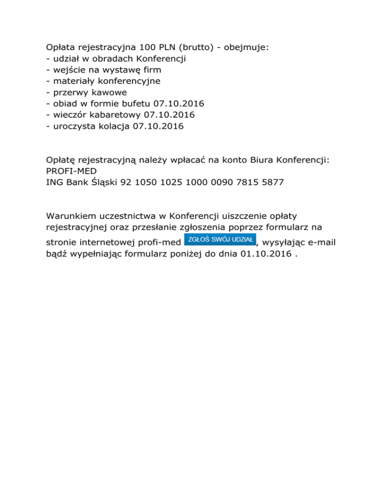 Opłata rejestracyjna 100 PLN (brutto) - obejmuje: - udział w obradach Konferencji - wejście na wystawę firm - materiały konferencyjne - przerwy kawowe - obiad w formie bufetu 07.10.2016 - wieczór kabaretowy 07.10.2016 - uroczysta kolacja 07.10.2016 Opłatę rejestracyjną należy wpłacać na konto Biura Konferencji: PROFI-MED ING Bank Śląski 92 1050 1025 1000 0090 7815 5877 Warunkiem uczestnictwa w Konferencji uiszczenie opłaty rejestracyjnej oraz przesłanie zgłoszenia poprzez formularz na stronie internetowej profi-med , wysyłając e-mail bądź wypełniając formularz poniżej do dnia 01.10.2016 .