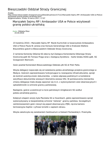 Bieszczadzki Oddział Straży Granicznej Źródło: http://www.bieszczadzki.strazgraniczna.pl/bie/aktualnosci/17112,Marszalek-Sejmu-RP-i-Ambasador-USA-w-Polscewizytowali-granie-polsko-ukrainska.html Wygenerowano: Środa, 8 marca 2017, 17:07 Marszałek Sejmu RP i Ambasador USA w Polsce wizytowali granię polsko-ukraińską Autor: Elżbieta Pikor 24.04.2016 23 kwietnia 2016 r. Marszałek Sejmu RP Marek Kuchciński w towarzystwie Ambasadora USA w Polsce Paula W. Jonesa oraz Konsula Generalnego USA w Krakowie Waltera Braunohlera gościli w Bieszczadzkim Oddziale Straży Granicznej. Z ramienia Komendy Głównej SG obecny był Zastępca Komendanta Głównego Straży Granicznej ppłk SG Tomasz Praga wraz z Zastępcą Dyrektora – Szefa Sztabu KGSG ppłk. SG Grzegorzem Niemcem. Gości powitał Komendant Bieszczadzkiego Oddziału płk SG dr Piotr Patla. Wizyta delegacji rozpoczęła się od zwiedzania polsko-ukraińskiego przejścia granicznego w Medyce. Gościom zaprezentowano funkcjonujące tu rozwiązania infrastrukturalne, sprzęt do kontroli autentyczności dokumentów, a także odprawę podróżnych w kontekście weryfikacji dokumentów wizowych (biometria wizowa VIS). W pomieszczeniu kierownika zmiany delegacja miała okazję zapoznać się m.in. z wykorzystaniem wież obserwacyjnych i optoelektroniki w ochronie granicy państwowej. Następnie, goście uczestniczyli w locie patrolowym śmigłowcem SG wzdłuż polsko-ukraińskiej granicy . Kolejnym etapem wizyty była Placówka SG w Huwnikach, gdzie zaprezentowano sprzęt wykorzystywany w bezpośredniej ochronie "zielonej" granicy państwa. Szczególnym zainteresowaniem gości cieszył się pojazd obserwacyjny (PJN), ręczna kamera termowizyjna Sophie i cyfrowe lornetki z zapisem obrazu. Wizyta zakończyła się zwiedzaniem Sanktuarium w Kalwarii Pacławskiej k. Przemyśla.