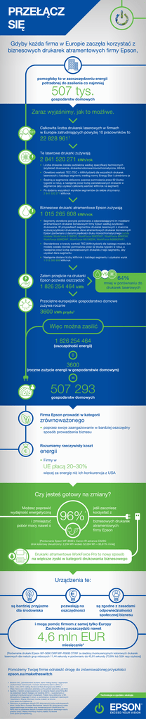 PRZEŁĄCZ SIĘ Gdyby każda firma w Europie zaczęła korzystać z biznesowych drukarek atramentowych firmy Epson, pomogłoby to w zaoszczędzeniu energii potrzebnej do zasilenia co najmniej 507 tys. gospodarstw domowych Zaraz wyjaśnimy, jak to możliwe. 10+ Całkowita liczba drukarek laserowych w firmach w Europie zatrudniających powyżej 10 pracowników to 22 828 9611 Te laserowe drukarki zużywają 2 841 520 271 kWh/rok • Liczba drukarek została podzielona według specyfikacji technicznych (szybkość drukowania, drukarka kolorowa/monochromatyczna, A3/A4) • Określono wartość TEC (TEC = kWh/tydzień) dla wszystkich drukarek laserowych z każdego segmentu według normy Energy Star i uśredniono je • Średnią w segmencie obliczono poprzez pomnożenie przez 52 (liczba tygodni w roku), a następnie przez liczbę zainstalowanych drukarek w segmencie (aby uzyskać całkowitą wartość kWh/rok na segment) • Po dodaniu wszystkich wyników segmentów do siebie otrzymamy: 2 841 520 271 kWh/rok Biznesowe drukarki atramentowe Epson zużywają 1 015 265 808 kWh/rok • Segmenty określone powyżej porównano z odpowiadającymi im modelami atramentowych drukarek biznesowych firmy Epson według szybkości drukowania. W przypadkach segmentów drukarek laserowych o znacznie wyższej szybkości drukowania, dane atramentowych drukarek biznesowych Epson porównano z danymi prędkości druku monochromatycznego (użyte modele: WorkForce 5190DW, WorkForce 5690DWF, WorkForce 8090DW, WorkForce 8590DWF, WorkForce M5190DW, WorkForce M5690DWF) • Standardowa w branży wartość TEC (kWh/tydzień) dla każdego modelu (lub modeli) została również pomnożona przez 52 (liczba tygodni w roku), a następnie przez liczbę zainstalowanych drukarek z tego segmentu, aby uzyskać dane segmentu • Następnie dodano liczby kWh/rok z każdego segmentu i uzyskano wynik 1 015 265 808 kWh/rok vs Zatem przejście na drukarki Epson pozwala oszczędzić 64% mniej w porównaniu do drukarek laserowych 1 826 254 464 kWh Przeciętne europejskie gospodarstwo domowe zużywa rocznie 3600 kWh prądu 2 Więc można zasilić 1 826 254 464 (oszczędność energii) ÷ 3600 (roczne zużycie energii w gospodarstwie domowym) = 507 293 gospodarstw domowych Firma Epson prowadzi w kategorii zrównoważonego • poprzez swoje zaangażowanie w bardziej oszczędny sposób prowadzenia biznesu Rozumiemy rzeczywisty koszt energii • Firmy w UE płacą 20–30% więcej za energię niż ich konkurencja z USA Czy jesteś gotowy na zmiany? Możesz poprawić wydajność energetyczną i zmniejszyć pobór mocy nawet o 96% 3 jeśli zaczniesz korzystać z biznesowych drukarek atramentowych firmy Epson [Porównanie Epson WF-8590 z Canon IR advance C5235i druk kolorowy dwustronny: 2,284 Wh wobec 52,004 Wh = 95,61% mniej] Drukarki atramentowe WorkForce Pro to nowy sposób na większe zyski w kategorii drukowania biznesowego Urządzenia te: są bardziej przyjazne dla środowiska pozwalają na oszczędności są zgodne z zasadami odpowiedzialności społecznej biznesu i mogą pomóc firmom z samej tylko Europy Zachodniej zaoszczędzić nawet 4,6 mln EUR miesięcznie4 [Porównanie drukarki Epson WF-5690 DWF/WF-R5690 DTWF ze średnią z konkurencyjnych kolorowych drukarek laserowych dla małych grup roboczych 11,44 sekundy w porównaniu do 43,91 sekundy (73,9% lub 3,84 razy szybsze)] Pomożemy Twojej firmie odnaleźć drogę do zrównoważonej przyszłości epson.eu/maketheswitch 1 Badanie IDC „Zainstalowane drukarki: dane według branży i segmentów użytkowników końcowych w Europie Zachodniej (dane z 2015 r.)” 2 Dane z roku 2014 według Światowej Rady Energetycznej (WEC) — https://www.wec-indicators.enerdata.eu/household-electricity-use.html) 3 Zgodnie z testami przeprowadzonymi na zlecenie Epson przez firmę BLI na przestrzeni dwóch miesięcy od kwietnia 2015 r., w porównaniu z wybranymi konkurencyjnymi drukarkami. Pobór mocy obliczony w Wh dla wydruku trwającego 5 minut, w porównaniu z drukarkami laserowymi i kopiarkami. Więcej informacji można znaleźć na stronie www.epson.eu/inkjetsaving 4 Obliczono na podstawie danych IDC dotyczących liczby wydrukowanych stron i liczby firm w Europie Wschodniej, danych BLI dotyczących czasu zaoszczędzonego na modelu prac konserwacyjnych WorkForce Pro RIPS oraz na podstawie danych Eurostat dotyczących średniego kosztu godziny pracy. Więcej informacji można znaleźć na stronie www.epson.pl/inkjetsaving Technologia w zgodzie z ekologią