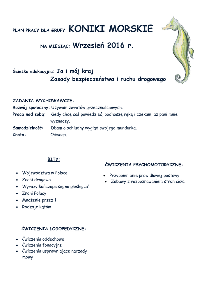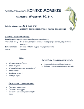 PLAN PRACY DLA GRUPY: KONIKI MORSKIE NA MIESIĄC: Wrzesień 2016 r. Ja i mój kraj Zasady bezpieczeństwa i ruchu drogowego Ścieżka edukacyjna: ZADANIA WYCHOWAWCZE: Rozwój społeczny: Używam zwrotów grzecznościowych. Praca nad sobą: Kiedy chcę coś powiedzieć, podnoszę rękę i czekam, aż pani mnie wyznaczy. Samodzielność: Dbam o schludny wygląd swojego mundurka. Cnota: Odwaga. BITY: Województwa w Polsce Znaki drogowe Wyrazy kończące się na głoskę „a” Znani Polacy Mnożenie przez 1 Rodzaje kątów ĆWICZENIA LOGOPEDYCZNE: Ćwiczenia oddechowe Ćwiczenia fonacyjne Ćwiczenia usprawniające narządy mowy ĆWICZENIA PSYCHOMOTORYCZNE: Przypomnienie prawidłowej postawy Zabawy z rozpoznawaniem stron ciała Wiersz logopedyczny Głoska a E. M. Skorek Ma mnie Ania, Ada, Ala słychać mnie, gdy mówisz lala. Jestem, kiedy powiesz tata, ma mnie także akrobata. Każda mama mnie też ma, bo ja jestem głoska …… a! Wiersz: „Grzeczne słowa” G. Jędryka Są słowa niemiłe i miłe, wśród miłych te bardzo serdeczne: poproszę, dziękuję, przepraszam. Wyrazy do życia konieczne. Mów często z uśmiechem: dziękuję i dzień dobry na powitanie. Przepraszaj też innych bez wstydu, a świat nasz piękniejszy się stanie. „Pan Sygnalizator” Maszerują buty po chodniku Prawą strona, grzecznie w równym szyku I pytają sygnalizatora, Czy przez jezdnię już przechodzić pora? Ref. Jestem z tego dobrze znany Że wciąż migam światełkami Kiedy światło mam zielone Możesz przejść na drugą stronę I spokojnie idź po pasach Bo na pasach się nie hasa A gdy błysnę na czerwono Stój, nie przechodź, zabroniono! Pan sygnalizator mruga okiem: Czy są jezdnie wąskie czy szerokie Stoję dla was co dzień jak na warcie Więc zasady moje pamiętajcie. „Mazurek Dąbrowskiego” Jeszcze Polska nie zginęła, Kiedy my żyjemy. Co nam obca przemoc wzięła, Szablą odbierzemy. Marsz, marsz Dąbrowski, Z ziemi włoskiej do Polski. Za twoim przewodem Złączym się z narodem. Przejdziem Wisłę, przejdziem Wartę, Będziem Polakami. Dał nam przykład Bonaparte, Jak zwyciężać mamy. Marsz, marsz... Jak Czarniecki do Poznania Po szwedzkim zaborze, Dla ojczyzny ratowania Wrócim się przez morze. Marsz, marsz... Już tam ojciec do swej Basi Mówi zapłakany Słuchaj jeno, pono nasi Biją w tarabany. Marsz, marsz... Zagadki wakacyjne Wybrane zagadki Smoka Obiboka AUDYCJE MUZYCZNE: Piotr Czajkowski – Walc kwiatów z baletu „Dziadek do orzechów” Jan Sebastian Bach – Msza h-moll Agnus Dei JĘZYK ANGIELSKI: Revision - powtórzenie słownictwa o tematyce wakacyjnej np. shell, sand, sea Słownictwo: hot, cold, warm, freezing pory roku - spring, summer, autumn, winter. Struktury: Is it freezing in winter? Yes, it is/ No, it isn't. It's warm in spring and cold in autumn. Zabawy utrwalające poznane słownictwo np: "Hot - cold"