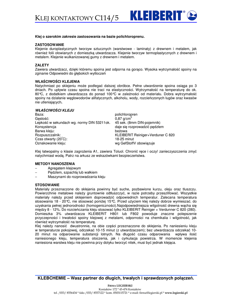 KLEJ KONTAKTOWY C114/5 Klej o szerokim zakresie zastosowania na bazie polichloroprenu. ZASTOSOWANIE Klejenie duroplastycznych tworzyw sztucznych (warstwowe - laminaty) z drewnem i metalem, jak również folii ołowianych z domieszką utwardzacza. Klejenie tworzyw termoplastycznych z drewnem i metalem. Klejenie wulkanizowanej gumy z drewnem i metalem. ZALETY Zawiera utwardzacz, dzięki któremu spoina jest odporna na gorąco. Wysoka wytrzymałość spoiny na zginanie Odpowiedni do głębokich wytłoczeń WŁAŚCIWOŚCI KLEJENIA Natychmiast po sklejeniu może podlegać dalszej obróbce. Pełne utwardzenie spoina osiąga po 3 dniach. Po upływie czasu spoina nie traci na elastyczności. Wytrzymałość na temperaturę do ok. 80°C, z dodatkiem utwardzacza do ponad 100°C w zależności od materiału. Dobra wytrzymałość spoiny na działanie węglowodorów alifatycznych, alkoholu, wody, rozcieńczonych ługów oraz kwasów nie utleniających. WŁAŚCIWOŚCI KLEJU Baza: Gęstość: Lepkość w sekundach wg. normy DIN 53211ok. Konsystencja Barwa kleju: Rozpuszczalnik: Czas otwarty (20ºC): Oznakowanie kleju: polichloropren 0,87 g/cm3 45 sek. (8mm DIN-pojemnik) daje się rozprowadzić pędzlem beżowa KLEIBERIT Reiniger+Verduner C 820 18-25 minut wg GefStoffV obowiązuje Klej łatwopalny o klasie zagrożenia A1, zawiera Toluol. Chronić ręce i oczy! zanieczyszczenia zmyć natychmiast wodą. Patrz na arkusz ze wskazówkami bezpieczeństwa. METODY NANOSZENIA − Agregatem klejowym − Pędzlem, szpachlą lub wałkiem − Maszynami do rozprowadzania kleju STOSOWANIE Materiały przeznaczone do sklejenia powinny być suche, pozbawione kurzu, oleju oraz tłuszczu. Powierzchnie metalowe należy gruntownie odtłuszczyć, w razie potrzeby przeszlifować. Wszystkie materiały należy przed sklejeniem doprowadzić odpowiednich temperatur. Zalecana temperatura stosowania 18 - 20°C, nie stosować poniżej 15°C. Przed użyciem klej należy dobrze wymieszać. do uzyskania pełnej jednorodności (homogeniczności).Najodpowiedniejsza wilgotność drewna wącha się między 8 - 12%. Do rozcieńczania kleju stosować tylko KLEIBERIT Reiniger + Verdunner C 820 (280). Domieszka 3% utwardzacza KLEIBERIT H801 lub F802 powoduje znaczne polepszenie przyczepności i trwałości spoiny klejowej z metalami, odporności na chemikalia i wilgotność, jak również wytrzymałość na temperaturę. Klej należy nanosić dwustronnie, na obie części przeznaczone do sklejenia. Po naniesieniu kleju w temperaturze pokojowej, odczekać 10-15 minut (z utwardzaczem); bez utwardzacza odczekać 1020 minut na odparowanie substancji lotnych. Na długość czasu odparowania wpływa ilość naniesionego kleju, temperatura otoczenia, jak i cyrkulacja powietrza. W momencie klejenia naniesiona warstwa kleju nie powinna przy dotyku tworzyć nitek, musi być jednak klejąca. KLEBCHEMIE – Wasz partner do długich, trwałych i sprawdzonych połączeń. FIRMA LEGIERSKI Koniaków 172 * 43-474 Koniaków tel. /033/ 8556434 * faks /033/ 8557122 * kom. 0503115721 * e-mail: [email protected] * www.legierski.pl KLEJ KONTAKTOWY C114/5 ZUŻYCIE Ok. 125 - 150g/m2 na je dna stronę. Naniesioną warstwę kleju możemy uznać za wystarczającą, jeśli po czasie odparowania (schnięcia) utworzy się jednolita warstwa na materiale klejonym. Przeznaczone do sklejenia części należy dokładnie spasować. Po złączeniu korekta ułożenia jest już niemożliwa. Sklejenie przeprowadzać pod dużym naciskiem: - materiały elastyczne, co najmniej 0,3 N/mm2 2 - materiały sztywne, co najmniej 0,5 N/mm Do sprasowania wystarcza czas kilku sekund. IM SILNIEJSZY DOCISK TYM WYŻSZA WYTRZYMAŁOŚĆ SKLEJENIA! Materiały sklejone można poddać natychmiast dalszej obróbce. Pełna wytrzymałość spoiny(sklejenia) z domieszką utwardzacza zostaje osiągnięta po upływie 3 dni. CZYSZCZENIE Maszyny i urządzenia nanoszące klej mogą być czyszczone KLEIBERIT Reiniger+Verdunner C820(280). UTYLIZACJA ODPADÓW KLEJU I OPAKOWAŃ Odpady płynne kleju: CPB = działanie fizyczno-chemiczne wg klucza 55402 SAV = spalanie odpadów specjalnych Odpady płynne utwardzacza 801 CPB = działanie fizyczno-chemiczne wg klucza 55401 SAV = spalanie odpadów specjalnych wg klucza 55370 Odpady płynne rozcieńczalnika: SAV = spalanie odpadów specjalnych Stwardniałe odpady kleju z utwardzaczem: HMD = spalanie odpadów gosp.dom. wg klucza 55906 HMD = spalanie odpadów gosp.dom. Nasze opakowania wykonane są z materiałów recyrkulacyjnych (międzynarodowy znak Recyc.). Dobrze opróżnione i oczyszczone opakowania można użyć ponownie. WIELKOŚCI OPAKOWAŃ KLEIBERIT Kontaktkleber C114/5: KLEIBERIT R+V 820(280): KLEIBERIT UTWARDZACZ H801 i F 802: Karton 10 x 0,7 kg, Kanister blaszany 4,5 kg.netto, wiadro blaszane 25 kg.netto; Karton 12 x 900 ml, Kanister blaszany 4,5 kg. netto, Kana blaszana 26kg. netto; Butelka 250g.,1 kg. netto. PRZECHOWYWANIE Klej KLEIBERIT Kontaktkleber C114/5 w fabrycznie zamkniętych opakowaniach, przy temperaturze 20°C zachowuje swą przydatność do użycia przez ok. 1 rok. Klej jest odporny na zimno. Przed użyciem doprowadzić do temperatury pokojowej i dobrze zamieszać. SERWIS Do Państwa dyspozycji są o każdej porze nasze służby techniczno-doradcze, które mogą Państwu służyć radą w zakresie stosowania naszych produktów. Podane przez nas dane bazują na naszych dotychczasowych doświadczeniach i nie stanowią zapewnień dotyczących właściwości w rozumieniu Federalnej Ustawy Handlowej. Prosimy samemu zbadać czy produkt nasz nadaje się do Państwa celów. Nie ma możliwości rozciągnięcia odpowiedzialności poza wartość naszego produktu na podstawie niniejszych informacji, co dotyczy także skorzystania z naszej nieodpłatnej i niewiążąco pracującej służby doradczej. KLEBCHEMIE – Wasz partner do długich, trwałych i sprawdzonych połączeń. FIRMA LEGIERSKI Koniaków 172 * 43-474 Koniaków tel. /033/ 8556434 * faks /033/ 855712