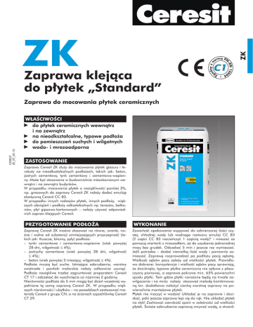 ZK ZK Zaprawa klejąca do płytek „Standard” CERESIT ZK_KT_09.10 Zaprawa do mocowania płytek ceramicznych WŁAŚCIWOŚCI do płytek ceramicznych wewnątrz i na zewnątrz na nieodkształcalne, typowe podłoża do pomieszczeń suchych i wilgotnych wodo- i mrozoodporna ZASTOSOWANIE Zaprawa Ceresit ZK służy do mocowania płytek glazury i terakoty na nieodkształcalnych podłożach, takich jak: beton, jastrych cementowy, tynk cementowy i cementowo-wapienny. Może być stosowana w budownictwie mieszkaniowym wewnątrz i na zewnątrz budynków. W przypadku mocowania płytek o nasiąkliwości poniżej 3%, np. gresowych do zaprawy Ceresit ZK należy dodać emulsję elastyczną Ceresit CC 83. W przypadku innych rodzajów płytek, innych podłoży, większych obciążeń i podłoży odkształcalnych np. tarasów, balkonów, płyt gipsowo-kartonowych – należy używać odpowiednich zapraw klejących Ceresit. PRZYGOTOWANIE PODŁOŻA Zaprawę Ceresit ZK można stosować na równe, zwarte, nośne i wolne od substancji zmniejszających przyczepność (takich jak: tłuszcze, bitumy, pyły) podłoża: – tynki cementowe i cementowo-wapienne (wiek powyżej 28 dni, wilgotność £ 4%); – jastrychy cementowe (wiek powyżej 28 dni, wilgotność £ 4%); – beton (wiek powyżej 3 miesięcy, wilgotność £ 4%). Podłoża muszą być suche. Istniejące zabrudzenia, warstwy zwietrzałe i powłoki malarskie należy całkowicie usunąć. Podłoża nasiąkliwe trzeba zagruntować preparatem Ceresit CT 17 i odczekać do wyschnięcia co najmniej 2 godziny. Nierówności podłoża do 5 mm mogą być dzień wcześniej wypełnione tą samą zaprawą Ceresit ZK. W przypadku większych nierówności i ubytków – na posadzkach zastosować materiały Ceresit z grupy CN, a na ścianach szpachlówkę Ceresit CT 29. WYKONANIE Zawartość opakowania wsypywać do odmierzonej ilości czystej, chłodnej wody lub wodnego roztworu emulsji CC 83 (2 części CC 83 rozcieńczyć 1 częścią wody)* i mieszać za pomocą wiertarki z mieszadłem, aż do uzyskania jednorodnej masy bez grudek. Odczekać 5 min i jeszcze raz wymieszać. Jeśli potrzeba – dodać niewielką ilość wody i ponownie zamieszać. Zaprawę rozprowadzać po podłożu pacą zębatą. Wielkość zębów pacy zależy od wielkości płytek. Prawidłowo dobrane: konsystencja i wielkość zębów pacy sprawiają, że dociśnięta, typowa płytka ceramiczna nie spływa z płaszczyzny pionowej, a zaprawa pokrywa min. 65% powierzchni spodu płytki. Tam gdzie płytki narażone będą na trwałe zawilgocenie i na mróz należy stosować metodę kombinowaną tzn. dodatkowo nałożyć cienką warstwę zaprawy na powierzchnie montażowe płytek. Płytek nie moczyć w wodzie! Układać je na zaprawie i dociskać, póki jeszcze zaprawa lepi się do rąk. Nie układać płytek na styk! Zachować szerokość spoin w zależności od wielkości płytek. Świeże zabrudzenia zaprawą zmywać wodą, a stward- UWAGA Prace należy wykonywać w suchych warunkach, przy temperaturze powietrza i podłoża od +5°C do +25°C. Wszelkie dane odnoszą się do temperatury +23°C i wilgotności względnej powietrza 50%. W innych warunkach należy uwzględnić szybsze lub wolniejsze twardnienie materiału. Zaprawa Ceresit ZK ma właściwości drażniące, a zawartość cementu powoduje, że po wymieszaniu z wodą wyrób ma odczyn alkaliczny. W związku z tym należy chronić naskórek i oczy. W przypadku kontaktu materiału z oczami, płukać je obficie wodą i zasięgnąć porady lekarza. Wyrób przechowywać w miejscu niedostępnym dla dzieci. Zawartość chromu VI – poniżej 2 ppm w okresie ważności wyrobu. ZALECENIA Niniejsza karta techniczna określa zakres stosowania materiału i zalecany sposób prowadzenia robót, ale nie może zastąpić zawodowego przygotowania wykonawcy. Oprócz podanych zaleceń prace należy wykonywać zgodnie ze sztuką budowlaną i zasadami BHP. Producent gwarantuje jakość wyrobu, natomiast nie ma wpływu na warunki i sposób jego użycia. W przypadku wątpliwości należy wykonać własne próby stosowania. Producent zaleca stosowanie odpowiednich produktów wchodzących w skład systemowych rozwiązań. – Do fugowania należy użyć fugę Ceresit CE 40 Aquastatic a na podłożach narażonych na zwiększoną agresję chemiczną i mechaniczną (tarasy, balkony, ciągi komunikacyjne) stosować fugę Ceresit CE 43 Grand’Elit. – W celu dodatkowego zabezpieczenia spoin i okładzin ceramicznych przed zabrudzeniami poprzez hydrofobizację powierzchni, należy stosować silikonowy impregnat Ceresit CT 10. Wraz z ukazaniem się tej karty technicznej tracą ważność karty wcześniejsze. SKŁADOWANIE Do 12 miesięcy od daty produkcji, przy składowaniu na paletach, w suchych warunkach i w oryginalnych, nieuszkodzonych opakowaniach. DANE TECHNICZNE Baza: mieszanka spoiw, wypełniaczy mineralnych i modyfikatorów Gęstość nasypowa: ok. 1,5 kg/dm3 Proporcje mieszania: 4,8-5,5l wody (2 część emulsji CC 83 i 1 części wody)* na 25 kg Temperatura stosowania: od +5°C do +25°C Czas wstępnego dojrzewania: ok. 5 min Czas zużycia: do 2 godz. Czas otwarty (wg normy PN-EN 12004): przyczepność ³ 0,5 MPa Spływ (wg normy PN-EN 12004): £ 0,5 mm Spoinowanie: po 48 godz. Przyczepność (wg normy PN-EN 12004): - początkowa: - po zanurzeniu w wodzie: - po starzeniu termicznym: - po cyklach zamrażania i rozmrażania: ³ 0,5 MPa ³ 0,5 MPa ³ 0,5 MPa Reakcja na ogień: ³ 0,5 MPa A1/A1fl Orientacyjne zużycie (dotyczy równego podłoża, w zależności od równości podłoża i rodzaju płytek zużycie może ulec zmianie): płytki o boku do 10 cm wymiar zębów pacy 4 mm ilość ZK [kg/m2] 2,0 ilość CC 83* [l/m2] 0,35 do 15 cm do 25 cm do 30 cm 6 mm 8 mm 10 mm 2,7 3,4 4,2 0,45 0,56 0,67 * Gdy stosowany jest dodatek CC 83 Wyrób zgodny z normą PN-EN 12004:2008. OPAKOWANIA Worki 25 kg. Henkel Polska Sp. z o.o. ul. Domaniewska 41, 02-672 Warszawa Centralny