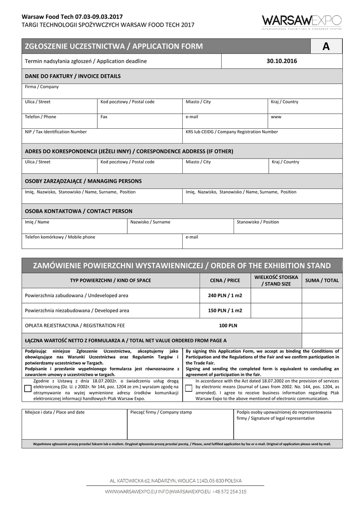 Warsaw Food Tech 07.03-09.03.2017 TARGI TECHNOLOGII SPOŻYWCZYCH WARSAW FOOD TECH 2017 A ZGŁOSZENIE UCZESTNICTWA / APPLICATION FORM 30.10.2016 Termin nadsyłania zgłoszeo / Application deadline DANE DO FAKTURY / INVOICE DETAILS Firma / Company Ulica / Street Kod pocztowy / Postal code Miasto / City Kraj / Country Telefon / Phone Fax e-mail www NIP / Tax Identification Number KRS lub CEIDG / Company Registration Number ADRES DO KORESPONDENCJI (JEŻELI INNY) / CORESPONDENCE ADDRESS (IF OTHER) Ulica / Street Kod pocztowy / Postal code Miasto / City Kraj / Country OSOBY ZARZĄDZAJĄCE / MANAGING PERSONS Imię, Nazwisko, Stanowisko / Name, Surname, Position Imię, Nazwisko, Stanowisko / Name, Surname, Position OSOBA KONTAKTOWA / CONTACT PERSON Imię / Name Nazwisko / Surname Telefon komórkowy / Mobile phone Stanowisko / Position e-mail ZAMÓWIENIE POWIERZCHNI WYSTAWIENNICZEJ / ORDER OF THE EXHIBITION STAND TYP POWIERZCHNI / KIND OF SPACE CENA / PRICE Powierzchnia zabudowana / Undeveloped area 240 PLN / 1 m2 Powierzchnia niezabudowana / Developed area 150 PLN / 1 m2 OPŁATA REJESTRACYJNA / REGISTRATION FEE WIELKOŚD STOISKA / STAND SIZE SUMA / TOTAL 100 PLN ŁĄCZNA WARTOŚD NETTO Z FORMULARZA A / TOTAL NET VALUE ORDERED FROM PAGE A Podpisując niniejsze Zgłoszenie Uczestnictwa, akceptujemy jako obowiązujące nas Warunki Uczestnictwa oraz Regulamin Targów i potwierdzamy uczestnictwo w Targach. Podpisanie i przesłanie wypełnionego formularza jest równoznaczne z zawarciem umowy o uczestnictwo w targach. Zgodnie z Ustawą z dnia 18.07.2002r. o świadczeniu usług drogą elektroniczną (Dz. U. z 2002r. Nr 144, poz. 1204 ze zm.) wyrażam zgodę na otrzymywanie na wyżej wymienione adresy środków komunikacji elektronicznej informacji handlowych Ptak Warsaw Expo. Miejsce i data / Place and date By signing this Application Form, we accept as binding the Conditions of Participation and the Regulations of the Fair and we confirm participation in the Trade Fair. Signing and sending the completed form is equivalent to concluding an agreement of participation in the fair. In accordance with the Act dated 18.07.2002 on the provision of services by electronic means (Journal of Laws from 2002. No. 144, pos. 1204, as amended). I agree to receive business information regarding Ptak Warsaw Expo to the above mentioned of electronic communication. Pieczęd firmy / Company stamp Podpis osoby upoważnionej do reprezentowania firmy / Signature of legal representative Wypełnione zgłoszenie proszę przesład faksem lub e-mailem. Oryginał zgłoszenia proszę przesład pocztą. / Please, send fulfilled application by fax or e-mail. Original of application please send by mail.