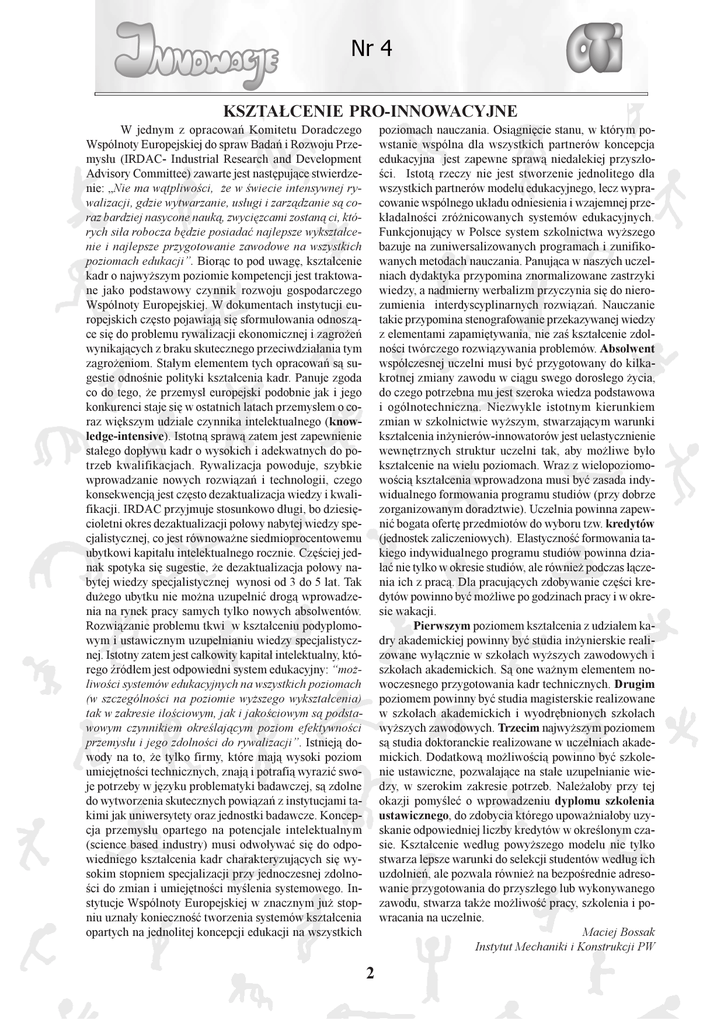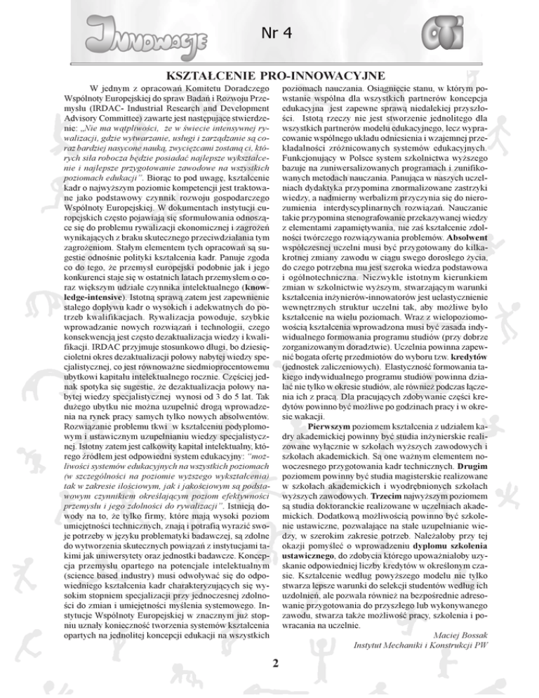 KSZTA£CENIE PRO-INNOWACYJNE W jednym z opracowañ Komitetu Doradczego Wspólnoty Europejskiej do spraw Badañ i Rozwoju Przemys³u (IRDAC- Industrial Research and Development Advisory Committee) zawarte jest nastêpuj¹ce stwierdzenie: Nie ma w¹tpliwoci, ¿e w wiecie intensywnej rywalizacji, gdzie wytwarzanie, us³ugi i zarz¹dzanie s¹ coraz bardziej nasycone nauk¹, zwyciêzcami zostan¹ ci, których si³a robocza bêdzie posiadaæ najlepsze wykszta³cenie i najlepsze przygotowanie zawodowe na wszystkich poziomach edukacji. Bior¹c to pod uwagê, kszta³cenie kadr o najwy¿szym poziomie kompetencji jest traktowane jako podstawowy czynnik rozwoju gospodarczego Wspólnoty Europejskiej. W dokumentach instytucji europejskich czêsto pojawiaj¹ siê sformu³owania odnosz¹ce siê do problemu rywalizacji ekonomicznej i zagro¿eñ wynikaj¹cych z braku skutecznego przeciwdzia³ania tym zagro¿eniom. Sta³ym elementem tych opracowañ s¹ sugestie odnonie polityki kszta³cenia kadr. Panuje zgoda co do tego, ¿e przemys³ europejski podobnie jak i jego konkurenci staje siê w ostatnich latach przemys³em o coraz wiêkszym udziale czynnika intelektualnego (knowledge-intensive). Istotn¹ spraw¹ zatem jest zapewnienie sta³ego dop³ywu kadr o wysokich i adekwatnych do potrzeb kwalifikacjach. Rywalizacja powoduje, szybkie wprowadzanie nowych rozwi¹zañ i technologii, czego konsekwencj¹ jest czêsto dezaktualizacja wiedzy i kwalifikacji. IRDAC przyjmuje stosunkowo d³ugi, bo dziesiêcioletni okres dezaktualizacji po³owy nabytej wiedzy specjalistycznej, co jest równowa¿ne siedmioprocentowemu ubytkowi kapita³u intelektualnego rocznie. Czêciej jednak spotyka siê sugestie, ¿e dezaktualizacja po³owy nabytej wiedzy specjalistycznej wynosi od 3 do 5 lat. Tak du¿ego ubytku nie mo¿na uzupe³niæ drog¹ wprowadzenia na rynek pracy samych tylko nowych absolwentów. Rozwi¹zanie problemu tkwi w kszta³ceniu podyplomowym i ustawicznym uzupe³nianiu wiedzy specjalistycznej. Istotny zatem jest ca³kowity kapita³ intelektualny, którego ród³em jest odpowiedni system edukacyjny: mo¿liwoci systemów edukacyjnych na wszystkich poziomach (w szczególnoci na poziomie wy¿szego wykszta³cenia) tak w zakresie ilociowym, jak i jakociowym s¹ podstawowym czynnikiem okrelaj¹cym poziom efektywnoci przemys³u i jego zdolnoci do rywalizacji. Istniej¹ dowody na to, ¿e tylko firmy, które maj¹ wysoki poziom umiejêtnoci technicznych, znaj¹ i potrafi¹ wyraziæ swoje potrzeby w jêzyku problematyki badawczej, s¹ zdolne do wytworzenia skutecznych powi¹zañ z instytucjami takimi jak uniwersytety oraz jednostki badawcze. Koncepcja przemys³u opartego na potencjale intelektualnym (science based industry) musi odwo³ywaæ siê do odpowiedniego kszta³cenia kadr charakteryzuj¹cych siê wysokim stopniem specjalizacji przy jednoczesnej zdolnoci do zmian i umiejêtnoci mylenia systemowego. Instytucje Wspólnoty Europejskiej w znacznym ju¿ stopniu uzna³y koniecznoæ tworzenia systemów kszta³cenia opartych na jednolitej koncepcji edukacji na wszystkich poziomach nauczania. Osi¹gniêcie stanu, w którym powstanie wspólna dla wszystkich partnerów koncepcja edukacyjna jest zapewne spraw¹ niedalekiej przysz³oci. Istot¹ rzeczy nie jest stworzenie jednolitego dla wszystkich partnerów modelu edukacyjnego, lecz wypracowanie wspólnego uk³adu odniesienia i wzajemnej przek³adalnoci zró¿nicowanych systemów edukacyjnych. Funkcjonuj¹cy w Polsce system szkolnictwa wy¿szego bazuje na zuniwersalizowanych programach i zunifikowanych metodach nauczania. Panuj¹ca w naszych uczelniach dydaktyka przypomina znormalizowane zastrzyki wiedzy, a nadmierny werbalizm przyczynia siê do nierozumienia interdyscyplinarnych rozwi¹zañ. Nauczanie takie przypomina stenografowanie przekazywanej wiedzy z elementami zapamiêtywania, nie za kszta³cenie zdolnoci twórczego rozwi¹zywania problemów. Absolwent wspó³czesnej uczelni musi byæ przygotowany do kilkakrotnej zmiany zawodu w ci¹gu swego doros³ego ¿ycia, do czego potrzebna mu jest szeroka wiedza podstawowa i ogólnotechniczna. Niezwykle istotnym kierunkiem zmian w szkolnictwie wy¿szym, stwarzaj¹cym warunki kszta³cenia in¿ynierów-innowatorów jest uelastycznienie wewnêtrznych struktur uczelni tak, aby mo¿liwe by³o kszta³cenie na wielu poziomach. Wraz z wielopoziomowoci¹ kszta³cenia wprowadzona musi byæ zasada indywidualnego formowania programu studiów (przy dobrze zorganizowanym doradztwie). Uczelnia powinna zapewniæ bogata ofertê przedmiotów do wyboru tzw. kredytów (jednostek zaliczeniowych). Elastycznoæ formowania takiego indywidualnego programu studiów powinna dzia³aæ nie tylko w okresie studiów, ale równie¿ podczas ³¹czenia ich z prac¹. Dla pracuj¹cych zdobywanie czêci kredytów powinno byæ mo¿liwe po godzinach pracy i w okresie wakacji. Pierwszym poziomem kszta³cenia z udzia³em kadry akademickiej powinny byæ studia in¿ynierskie realizowane wy³¹cznie w szko³ach wy¿szych zawodowych i szko³ach akademickich. S¹ one wa¿nym elementem nowoczesnego przygotowania kadr technicznych. Drugim poziomem powinny byæ studia magisterskie realizowane w szko³ach akademickich i wyodrêbnionych szko³ach wy¿szych zawodowych. Trzecim najwy¿szym poziomem s¹ studia doktoranckie realizowane w uczelniach akademickich. Dodatkow¹ mo¿liwoci¹ powinno byæ szkolenie ustawiczne, pozwalaj¹ce na sta³e uzupe³nianie wiedzy, w szerokim zakresie potrzeb. Nale¿a³oby przy tej okazji pomyleæ o wprowadzeniu dyplomu szkolenia ustawicznego, do zdobycia którego upowa¿nia³oby uzyskanie odpowiedniej liczby kredytów w okrelonym czasie. Kszta³cenie wed³ug powy¿szego modelu nie tylko stwarza lepsze warunki do selekcji studentów wed³ug ich uzdolnieñ, ale pozwala równie¿ na bezporednie adresowanie przygotowania do przysz³ego lub wykonywanego zawodu, stwarza tak¿e mo¿liwoæ pracy, szkolenia i powracania na uczelnie. Maciej Bossak Instytut Mechaniki i