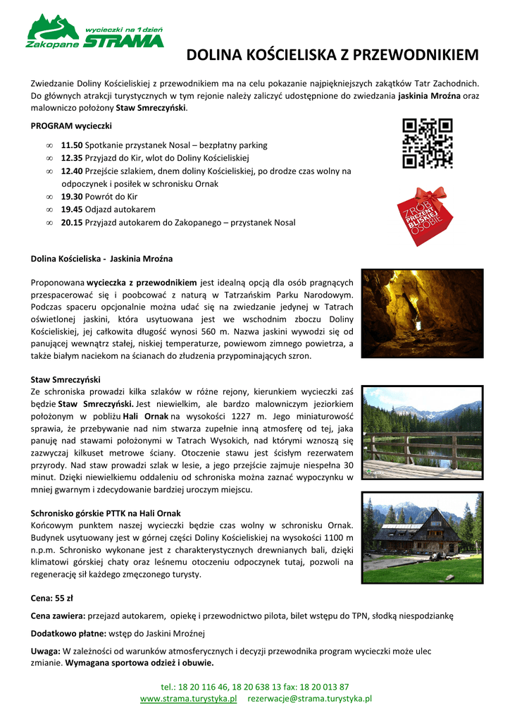 DOLINA KOŚCIELISKA Z PRZEWODNIKIEM Zwiedzanie Doliny Kościeliskiej z przewodnikiem ma na celu pokazanie najpiękniejszych zakątków Tatr Zachodnich. Do głównych atrakcji turystycznych w tym rejonie należy zaliczyć udostępnione do zwiedzania jaskinia Mroźna oraz malowniczo położony Staw Smreczyński. PROGRAM wycieczki • • • • • • 11.50 Spotkanie przystanek Nosal – bezpłatny parking 12.35 Przyjazd do Kir, wlot do Doliny Kościeliskiej 12.40 Przejście szlakiem, dnem doliny Kościeliskiej, po drodze czas wolny na odpoczynek i posiłek w schronisku Ornak 19.30 Powrót do Kir 19.45 Odjazd autokarem 20.15 Przyjazd autokarem do Zakopanego – przystanek Nosal Dolina Kościeliska - Jaskinia Mroźna Proponowana wycieczka z przewodnikiem jest idealną opcją dla osób pragnących przespacerować się i poobcować z naturą w Tatrzańskim Parku Narodowym. Podczas spaceru opcjonalnie można udać się na zwiedzanie jedynej w Tatrach oświetlonej jaskini, która usytuowana jest we wschodnim zboczu Doliny Kościeliskiej, jej całkowita długość wynosi 560 m. Nazwa jaskini wywodzi się od panującej wewnątrz stałej, niskiej temperaturze, powiewom zimnego powietrza, a także białym naciekom na ścianach do złudzenia przypominających szron. Staw Smreczyński Ze schroniska prowadzi kilka szlaków w różne rejony, kierunkiem wycieczki zaś będzie Staw Smreczyński. Jest niewielkim, ale bardzo malowniczym jeziorkiem położonym w pobliżu Hali Ornak na wysokości 1227 m. Jego miniaturowość sprawia, że przebywanie nad nim stwarza zupełnie inną atmosferę od tej, jaka panuję nad stawami położonymi w Tatrach Wysokich, nad którymi wznoszą się zazwyczaj kilkuset metrowe ściany. Otoczenie stawu jest ścisłym rezerwatem przyrody. Nad staw prowadzi szlak w lesie, a jego przejście zajmuje niespełna 30 minut. Dzięki niewielkiemu oddaleniu od schroniska można zaznać wypoczynku w mniej gwarnym i zdecydowanie bardziej uroczym miejscu. Schronisko górskie PTTK na Hali Ornak Końcowym punktem naszej wycieczki będzie czas wolny w schronisku Ornak. Budynek usytuowany jest w górnej części Doliny Kościeliskiej na wysokości 1100 m n.p.m. Schronisko wykonane jest z charakterystycznych drewnianych bali, dzięki klimatowi górskiej chaty oraz leśnemu otoczeniu odpoczynek tutaj, pozwoli na regenerację sił każdego zmęczonego turysty. Cena: 55 zł Cena zawiera: przejazd autokarem, opiekę i przewodnictwo pilota, bilet wstępu do TPN, słodką niespodziankę Dodatkowo płatne: wstęp do Jaskini Mroźnej Uwaga: W zależności od warunków atmosferycznych i decyzji przewodnika program wycieczki może ulec zmianie. Wymagana sportowa odzież i obuwie. tel.: 18 20 116 46, 18 20 638 13 fax: 18 20 013 87 www.strama.turystyka.pl [email protected]