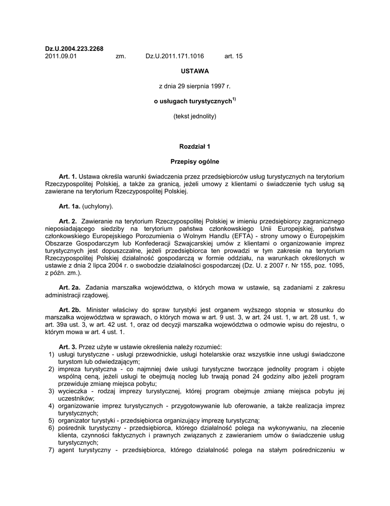 Dz.U.2004.223.2268 2011.09.01 zm. Dz.U.2011.171.1016 art. 15 USTAWA z dnia 29 sierpnia 1997 r. o usługach turystycznych 1) (tekst jednolity) Rozdział 1 Przepisy ogólne Art. 1. Ustawa określa warunki świadczenia przez przedsiębiorców usług turystycznych na terytorium Rzeczypospolitej Polskiej, a także za granicą, jeżeli umowy z klientami o świadczenie tych usług są zawierane na terytorium Rzeczypospolitej Polskiej. Art. 1a. (uchylony). Art. 2. Zawieranie na terytorium Rzeczypospolitej Polskiej w imieniu przedsiębiorcy zagranicznego nieposiadającego siedziby na terytorium państwa członkowskiego Unii Europejskiej, państwa członkowskiego Europejskiego Porozumienia o Wolnym Handlu (EFTA) - strony umowy o Europejskim Obszarze Gospodarczym lub Konfederacji Szwajcarskiej umów z klientami o organizowanie imprez turystycznych jest dopuszczalne, jeżeli przedsiębiorca ten prowadzi w tym zakresie na terytorium Rzeczypospolitej Polskiej działalność gospodarczą w formie oddziału, na warunkach określonych w ustawie z dnia 2 lipca 2004 r. o swobodzie działalności gospodarczej (Dz. U. z 2007 r. Nr 155, poz. 1095, z późn. zm.). Art. 2a. Zadania marszałka województwa, o których mowa w ustawie, są zadaniami z zakresu administracji rządowej. Art. 2b. Minister właściwy do spraw turystyki jest organem wyższego stopnia w stosunku do marszałka województwa w sprawach, o których mowa w art. 9 ust. 3, w art. 24 ust. 1, w art. 28 ust. 1, w art. 39a ust. 3, w art. 42 ust. 1, oraz od decyzji marszałka województwa o odmowie wpisu do rejestru, o którym mowa w art. 4 ust. 1. Art. 3. Przez użyte w ustawie określenia należy rozumieć: 1) usługi turystyczne - usługi przewodnickie, usługi hotelarskie oraz wszystkie inne usługi świadczone turystom lub odwiedzającym; 2) impreza turystyczna - co najmniej dwie usługi turystyczne tworzące jednolity program i objęte wspólną ceną, jeżeli usługi te obejmują nocleg lub trwają ponad 24 godziny albo jeżeli program przewiduje zmianę miejsca pobytu; 3) wycieczka - rodzaj imprezy turystycznej, której program obejmuje zmianę miejsca pobytu jej uczestników; 4) organizowanie imprez turystycznych - przygotowywanie lub oferowanie, a także realizacja imprez turystycznych; 5) organizator turystyki - przedsiębiorca organizujący imprezę turystyczną; 6) pośrednik turystyczny - przedsiębiorca, którego działalność polega na wykonywaniu, na zlecenie klienta, czynności faktycznych i prawnych związanych z zawieraniem umów o świadczenie usług turystycznych; 7) agent turystyczny - przedsiębiorca, którego działalność polega na stałym pośredniczeniu w 7a) 7b) 8) 9) 10) 11) 12) 13) 14) 15) zawieraniu umów o świadczenie usług turystycznych na rzecz organizatorów turystyki posiadających zezwolenia w kraju lub na rzecz innych usługodawców posiadających siedzibę w kraju; przewodnik turystyczny - osobę zawodowo oprowadzającą turystów lub odwiedzających po wybranych obszarach, miejscowościach i obiektach, udzielającą o nich fachowej informacji oraz sprawującą nad turystami lub odwiedzającymi opiekę w zakresie wynikającym z umowy; pilot wycieczek - osobę towarzyszącą, w imieniu organizatora turystyki, uczestnikom imprezy turystycznej, sprawującą opiekę nad nimi i czuwającą nad sposobem wykonania na ich rzecz usług oraz przekazującą podstawowe informacje, dotyczące odwiedzanego kraju i miejsca; usługi hotelarskie - krótkotrwałe, ogólnie dostępne wynajmowanie domów, mieszkań, pokoi, miejsc noclegowych, a także miejsc na ustawienie namiotów lub przyczep samochodowych oraz świadczenie, w obrębie obiektu, usług z tym związanych; turysta - osobę, która podróżuje do innej miejscowości poza swoim stałym miejscem pobytu na okres nieprzekraczający 12 miesięcy, dla której celem podróży nie jest podjęcie stałej pracy w odwiedzanej miejscowości i która korzysta z noclegu przynajmniej przez jedną noc; odwiedzający - osobę, która podróżuje do innej miejscowości poza swoim stałym miejscem pobytu, dla której celem podróży nie jest podjęcie stałej pracy w odwiedzanej miejscowości oraz niekorzystającą z noclegu; klient - osobę, która zamierza zawrzeć lub zawarła umowę o świadczenie usług turystycznych na swoją rzecz lub na rzecz innej osoby, a zawarcie tej umowy nie stanowi przedmiotu jej działalności gospodarczej, jak i osobę, na rzecz której umowa została zawarta, a także osobę, której przekazano prawo do korzystania z usług turystycznych objętych uprzednio zawartą umową; (uchylony); (uchylony); przedsiębiorca - przedsiębiorcę i przedsiębiorcę zagranicznego w rozumieniu ustawy z dnia 2 lipca 2004 r. o swobodzie działalności gospodarczej (Dz. U. Nr 173, poz. 1807); UIAGM - Międzynarodową Federację Stowarzyszeń Przewodników Górskich UIAGM/IVBV/IFMGA, skupiającą i weryfikującą narodowe stowarzyszenia przewodników wysokogórskich całego świata. Rozdział 2 Organizatorzy turystyki, pośrednicy i agenci turystyczni Art. 4. 1. Działalność gospodarcza w zakresie organizowania imprez turystycznych oraz pośredniczenia na zlecenie klientów w zawieraniu umów o świadczenie usług turystycznych jest działalnością regulowaną w rozumieniu przepisów ustawy z dnia 2 lipca 2004 r. o swobodzie działalności gospodarczej i wymaga uzyskania wpisu w rejestrze organizatorów turystyki i pośredników turystycznych, zwanego dalej "rejestrem". 2. Działalnością regulowaną, o której mowa w ust. 1, nie jest działalność gospodarcza agentów turystycznych, polegająca na stałym pośredniczeniu w zawieraniu umów o świadczenie usług turystycznych na rzecz organizatorów turystyki posiadających wpis do rejestru, lub na rzecz innych usługodawców posiadających siedzibę w kraju. Art. 5. 1. Przedsiębiorca wykonujący działalność gospodarczą w zakresie organizowania imprez turystycznych oraz pośredniczenia na zlecenie klientów