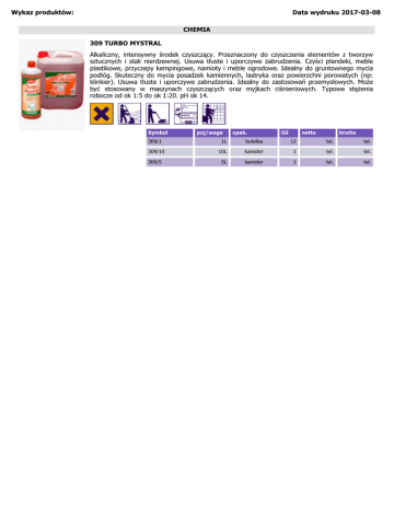 Wykaz produktów: Data wydruku 2017-03-08 CHEMIA 309 TURBO MYSTRAL Alkaliczny, intensywny środek czyszczący. Przeznaczony do czyszczenia elementów z tworzyw sztucznych i stali nierdzewnej. Usuwa tłuste i uporczywe zabrudzenia. Czyści plandeki, meble plastikowe, przyczepy kempingowe, namioty i meble ogrodowe. Idealny do gruntownego mycia podłóg. Skuteczny do mycia posadzek kamiennych, lastryka oraz powierzchni porowatych (np: klinkier). Usuwa tłuste i uporczywe zabrudzenia. Idealny do zastosowań przemysłowych. Może być stosowany w maszynach czyszczących oraz myjkach ciśnieniowych. Typowe stężenia robocze od ok 1:5 do ok 1:20. pH ok 14. Symbol poj/waga opak. OZ netto brutto 309/1 1L butelka 12 tel. tel. 309/10 10L kanister 1 tel. tel. 309/5 5L kanister 1 tel. tel.