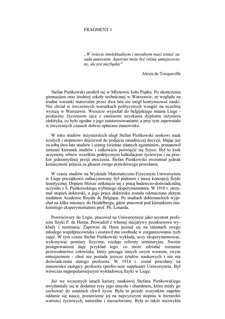 FRAGMENT 1 „W świecie intelektualnym i moralnym musi istnieć zasada autorytetu. Autorytet może być różnie umiejscowiony, ale jest niezbędny" Alexis de Tocqueville Stefan Pieńkowski urodził się w Młynowie koło Piątku. Po ukończeniu gimnazjum oraz średniej szkoły technicznej w Warszawie, ze względu na trudne warunki materialne przez dwa lata nie mógł kontynuować nauki. Nie chciał w ówczesnych warunkach politycznych wstąpić na uczelnię wyższą w Warszawie. Wreszcie wyjechał do belgijskiego miasta Liege posłuszny życzeniom ojca z zamiarem uzyskania dyplomu inżyniera elektryka, co było zgodne z jego zainteresowaniami, a przy tym zapewniało w ówczesnych czasach dobrze opłacane stanowisko. W toku studiów inżynierskich uległ Stefan Pieńkowski urokowi nauk ścisłych i stopniowo dojrzewał do podjęcia zasadniczej decyzji. Mając już za sobą dwa lata studiów i szereg świetnie zdanych egzaminów, postanowił zmienić kierunek studiów i całkowicie poświęcić się fizyce. Był to krok uczyniony wbrew wszelkim praktycznym kalkulacjom życiowym i na przekór jednomyślnej presji otoczenia. Stefan Pieńkowski zrozumiał jednak konieczność pójścia za głosem swego prawdziwego powołania. W czasie studiów na Wydziale Matematyczno-Fizycznym Uniwersytetu w Liege początkowo zafascynowany był pięknem i mocą koncepcji fizyki teoretycznej. Dopiero bliższe zetknięcie się z pracą badawczo-doświadczalną uczyniło z S. Pieńkowskiego wybitnego eksperymentatora. W 1910 r. otrzymał stopień doktorski, a jego praca doktorska została odznaczona złotym medalem Academie Royale de Belgiąue. Po studiach doktoranckich wyjechał na kilka miesięcy do Heidelbergu, gdzie pracował pod kierunkiem znakomitego eksperymentatora prof. Ph. Lenarda. Powróciwszy do Legie, pracował na Uniwersytecie jako asystent profesora fizyki P. de Heena. Prowadził z własnej inicjatywy pozakursowe wykłady i seminaria. Zapewne de Heen poznał się na talentach swego młodego współpracownika i zostawił mu swobodę w zorganizowaniu tych zajęć. W tym czasie Stefan Pieńkowski wykłada, uczy eksperymentować, wykonywać pomiary fizyczne, rozdaje referaty seminaryjne. Swoim postępowaniem daje przykład tego, co może zdziałać rozumne przewodnictwo człowieka, który pociąga innych swym wzorem, swym entuzjazmem - choć nie posiada jeszcze tytułów naukowych i nie ma doświadczenia starego profesora. W 1914 r. został powołany na stanowisko zastępcy profesora (profes-seur suppleant) Uniwersytetu. Był wówczas najpopularniejszym wykładowcą fizyki w Liege. Już we wczesnych latach kariery naukowej Stefana Pieńkowskiego uwydatniały się te dodatnie rysy jego umysłu i charakteru, które miały go cechować do ostatnich chwil życia. Było to przede wszystkim zupełne oddanie się nauce, postawienie jej na najwyższym stopniu w hierarchii wartości życiowych, naturalne i niezachwiane. Była to także niezwykła wytrwałość w pracy, czy to w laboratorium, czy nad lekturą, systematyczne studiowanie ulubionych klasyków, ale i bieżącej literatury, co pozwalało mu na osiąganie rozległych horyzontów naukowych. Interesowały go wówczas specjalnie spektroskopia, luminescencja, a także promienie X. Tematom tym Stefan Pieńkowski pozostał wierny także po powrocie do kraju. W 1919 r. Pieńkowski powrócił do Warszawy na wezwanie rządu odrodzonej Polski w celu objęcia Katedry Fizyki Doświadczalnej na Uniwersytecie Warszawskim. Powrócił z Belgii do ojczyzny, odrzucając atrakcyjną propozycję objęcia katedry fizyki w wyższej szkole w Mons. Obejmował ją w chwili trudnej i ważnej. Po stu kilkudziesięciu latach Polska odzyskała wreszcie samodzielny byt państwowy. Przed nauką polską otwierały się nowe, szerokie horyzonty. Odrodzony wówczas Uniwersytet Warszawski był dopiero w stadium rozbudowy, a Zakład Fizyki Doświadczalnej trzeba było tworzyć i organizować od podstaw. Przez pierwsze lata wykłady i ćwiczenia musiały się odbywać w wypożyczonych lokalach na Politechnice Warszawskiej. Pierwszą troską prof. Pieńkowskiego było urządzenie siedziby Zakładu. Gmach przy ulicy Hożej w Warszawie postawiony w 1914 r. pozostawał do tego czasu nie wykończony. Wtedy po raz pierwszy zabłysnął talent organizatorski Stefana Pieńkowskiego i objawiła się jego pasja budowania, co później uczyniło pamiętnymi w dziejach Uniwersytetu Warszawskiego jego kadencje rektorskie. Wbrew niezliczonym trudnościom doprowadził gmach do stanu użyteczności … FRAGMENT 2 Zdając sobie sprawę ze znaczenia fizyki jądrowej, prof. Pieńkowski kierował w latach 30. XX w. swych uczniów do zagranicznych ośrodków tego rodzaju badań. Plonem tych wyjazdów był skonstruowany polskimi siłami kaskadowy akcelerator wysokonapięciowy. Z jego pomocą dokonywano tuż przed wojną pierwszych w Polsce badań nad reakcjami jądrowymi. Projektowano też budowę własnego cyklotronu. Do najwybitniejszych uczniów Stefana Pieńkowskiego zalicza się Andrzej Sołtan specjalista w dziedzinie fizyki jądrowej, prof. UW, członek PAN, organizator Instytutu Badań Jądrowych w Warszawie oraz współorganizator Zjednoczonego Instytutu Badań Jądrowych w Dubnej pod Moskwą. Wśród nich są Jerzy Pniewski, prof. UW, członek PAN, twórca działu fizyki jądrowej - spektroskopii hiperjądrowej; Aleksander Jabłoński, członek PAN, autor prac z optyki atomowej i molekulowej czy też Leonard Sosnowski, prof. UW, członek PAN, specjalista w zakresie fizyki półprzewodników. W 1946 r. delegowano prof. Pieńkowskiego wraz z prof. A. Sołtanem w charakterze obserwatorów na atol Bikini na Pacyfiku, na którym utworzono amerykański poligon prób z bronią jądrową, gdzie byli świadkami pierwszych publicznych eksperymentalnych wybuchów bomb atomowych. Prof. Pieńkowski był zdecydowanym i konsekwentnym zwolennikiem idei obrony pokoju. Należał do Polskiego Komitetu Obrońców P