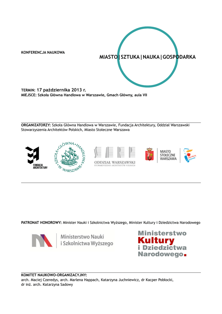KONFERENCJA NAUKOWA MIASTO|SZTUKA|NAUKA|GOSPODARKA TERMIN: 17 października 2013 r. MIEJSCE: Szkoła Główna Handlowa w Warszawie, Gmach Główny, aula VII ORGANIZATORZY: Szkoła Główna Handlowa w Warszawie, Fundacja Architektury, Oddział Warszawski Stowarzyszenia Architektów Polskich, Miasto Stołeczne Warszawa PATRONAT HONOROWY: Minister Nauki i Szkolnictwa Wyższego, Minister Kultury i Dziedzictwa Narodowego KOMITET NAUKOWO-ORGANIZACYJNY: arch. Maciej Czeredys, arch. Marlena Happach, Katarzyna Juchniewicz, dr Kacper Pobłocki, dr inż. arch. Katarzyna Sadowy Konferencja naukowa „Miasto – sztuka – nauka – gospodarka” stanowić będzie płaszczyznę wymiany doświadczeń oraz refleksji na temat relacji między światem nauki i kultury a umacnianiem się ośrodków miejskich i rozwojem społeczno – gospodarczym. Proponowany profil dyskusji jest żywy we współczesnej polityce europejskiej, skupionej na rozwoju miast jako złożonych jednostkach postępu gospodarczego i miejsc zamieszkania o wysokiej jakości życia. Konferencja adresowana jest do osób, dla których fenomen miasta i miejskości stanowi centrum refleksji oraz działalności i które zauważają konieczność interdyscyplinarnej, międzyśrodowiskowej dyskusji, tj. specjalistów w zakresie gospodarki przestrzennej i polityki miejskiej, naukowców z dziedziny nauk społecznych, przedstawicieli jednostek samorządu terytorialnego, w tym władz miast, urbanistów i architektów, przedstawicieli środowisk artystycznych oraz instytucji kultury. REJESTRACJA 9.30-10.00 I SESJA: MIASTA REALNE: 10.15-12.15 Moderacja: arch. Marlena Happach (OW SARP) •dr Rafał Kasprzak (SGH w Warszawie): Znaczenie instytucji i wydarzeń kulturalnych dla rozwoju miast • arch. Maciej Czeredys (Nowy Teatr w Warszawie): Doświadczenie działań instytucji artystycznej pozbawionej siedziby, prowadzenie działań kulturalnych w przestrzeni miasta •dr inż. arch. Katarzyna Sadowy (OW SARP): rola architektury w kształtowaniu społecznego obrazu nauki i kultury •Jakub Michałowski (PwC Polska): Praktyczne możliwości i doświadczenia w integracji idealnego z realnym w przestrzeni miejskiej PRZERWA KAWOWA 12.15-12.45 II SESJA: MIASTA IDEALNE 12.45-14.45 Moderacja: dr Kacper Pobłocki (UAM w Poznaniu) •prof. dr hab. Ewa Rewers (UAM w Poznaniu): Utopia czy eksperyment? •arch. Piotr Bujas: Krytyczna alternatywa. O ponownym odczytaniu projektu utopijego •prof. dr hab. Teresa Słaby (SGH w Warszawie): Nauka i kultura jako czynniki rozwoju miast- problem jego oceny PRZERWA LUNCHOWA 14.45 – 15.30 III SESJA: MIASTA ZSIECIOWANE 15.30-17.30 Moderacja: Edwin Bendyk •prof. dr hab. Bohdan Jałowiecki (UW): Sieciowa natura metropolii •Michał Olszewski (zastępca Prezydenta m. st. Warszawy): Rola samorządu w tworzeniu relacji pomiędzy różnymi czynnikami rozwoju miast •dr Alek Tarkowski (UW, Rada Informatyzacji): Sieć w Mieście - Miasto w Sieci •Agata Gruszecka-Tieśluk (Forum Odpowiedzialnego Biznesu): Społeczna odpowiedzialność biznesu – idea łącząca różne światy