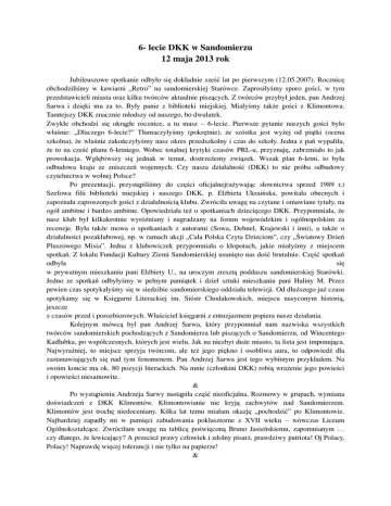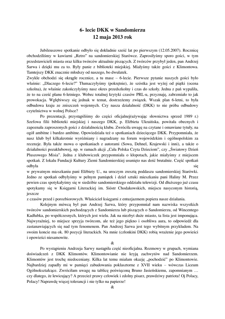 6- lecie DKK w Sandomierzu 12 maja 2013 rok Jubileuszowe spotkanie odbyło się dokładnie sześć lat po pierwszym (12.05.2007). Rocznicę obchodziliśmy w kawiarni „Retro” na sandomierskiej Starówce. Zaprosiłyśmy sporo gości, w tym przedstawicieli miasta oraz kilku twórców aktualnie piszących. Z twórców przybył jeden, pan Andrzej Sarwa i dzięki mu za to. Były panie z biblioteki miejskiej. Miałyśmy takŜe gości z Klimontowa. Tamtejszy DKK znacznie młodszy od naszego, bo dwulatek. Zwykle obchodzi się okrągłe rocznice, a tu masz – 6-lecie. Pierwsze pytanie naszych gości było właśnie: „Dlaczego 6-lecie?” Tłumaczyłyśmy (pokrętnie), Ŝe szóstka jest wyŜej od piątki (ocena szkolna), Ŝe właśnie zakończyłyśmy nasz okres przedszkolny i czas do szkoły. Jedna z pań wypaliła, Ŝe to na cześć planu 6-letniego. Wobec totalnej krytyki czasów PRL-u, przyznaję, zabrzmiało to jak prowokacja. Wgłębiwszy się jednak w temat, dostrzeŜemy związek. Wszak plan 6-letni, to była odbudowa kraju ze zniszczeń wojennych. Czy nasza działalność (DKK) to nie próba odbudowy czytelnictwa w wolnej Polsce? Po prezentacji, przystąpiliśmy do części oficjalnej(uŜywając słownictwa sprzed 1989 r.) Szefowa filii biblioteki miejskiej i naszego DKK, p. ElŜbieta Ukraińska, powitała obecnych i zapoznała zaproszonych gości z działalnością klubu. Zwróciła uwagę na czytane i omawiane tytuły, na ogół ambitne i bardzo ambitne. Opowiedziała teŜ o spotkaniach dziecięcego DKK. Przypomniała, Ŝe nasz klub był kilkakrotnie wyróŜniany i nagradzany na forum wojewódzkim i ogólnopolskim za recenzje. Była takŜe mowa o spotkaniach z autorami (Sowa, Dehnel, Krajewski i inni), a takŜe o działalności pozaklubowej, np. w ramach akcji „Cała Polska Czyta Dzieciom”, czy „Światowy Dzień Pluszowego Misia”. Jedna z klubowiczek przypomniała o kłopotach, jakie miałyśmy z miejscem spotkań. Z lokalu Fundacji Kultury Ziemi Sandomierskiej usunięto nas dość brutalnie. Część spotkań odbyła się w prywatnym mieszkaniu pani ElŜbiety U., na uroczym zresztą poddaszu sandomierskiej Starówki. Jedno ze spotkań odbyłyśmy w pełnym pamiątek i dzieł sztuki mieszkaniu pani Haliny M. Przez pewien czas spotykałyśmy się w siedzibie sandomierskiego oddziału telewizji. Od dłuŜszego juŜ czasu spotykamy się w Księgarni Literackiej im. Sióstr Chodakowskich, miejscu nasyconym historią, jeszcze z czasów przed i porozbiorowych. Właściciel księgarni z entuzjazmem popiera nasze działania. Kolejnym mówcą był pan Andrzej Sarwa, który przypomniał nam nazwiska wszystkich twórców sandomierskich pochodzących z Sandomierza lub piszących o Sandomierzu, od Wincentego Kadłubka, po współczesnych, których jest wielu. Jak na niezbyt duŜe miasto, ta lista jest imponująca. Najwyraźniej, to miejsce sprzyja twórcom, ale teŜ jego piękno i osobliwa aura, to odpowiedź dla zastanawiających się nad tym fenomenem. Pan Andrzej Sarwa jest tego wybitnym przykładem. Na swoim koncie ma ok. 80 pozycji literackich. Na mnie (członkini DKK) robią wraŜenie jego powieści i opowieści niesamowite. & Po wystąpieniu Andrzeja Sarwy nastąpiła część nieoficjalna. Rozmowy w grupach, wymiana doświadczeń z DKK Klimontów. Klimontowianie nie kryją zachwytów nad Sandomierzem. Klimontów jest trochę niedoceniany. Kilka lat temu miałam okazję „pochodzić” po Klimontowie. Najbardziej zapadły mi w pamięci zabudowania poklasztorne z XVII wieku – wówczas Liceum Ogólnokształcące. Zwróciłam uwagę na tablicę poświęconą Bruno Jasieńskiemu, zapomnianym … czy dlatego, Ŝe lewicujący? A przecieŜ prawy człowiek i zdolny pisarz, prawdziwy patriota! Oj Polacy, Polacy! Naprawdę więcej tolerancji i nie tylko na papierze! & Na zakończenie pan Andrzej Sarwa rzucił wyzwanie: „A gdyby stworzyć baedeker, zebrać dane o wszystkich twórcach związanych z Sandomierzem?” Trzeba poszperać w archiwum, zrobić wywiady ze współczesnymi. Zaczynamy się przymierzać do działań a co z tego wyniknie? – Zobaczymy. & I wreszcie – to co zawsze: poŜegnania, serdeczności, komplementy i chęć kontynuowania współpracy. Pozwolę sobie powtórzyć toast, który wznieśliśmy na początku spotkania: „Za ksiąŜki, za ich twórców i za czytelników.” Maria Zarańska DKK Sandomierz