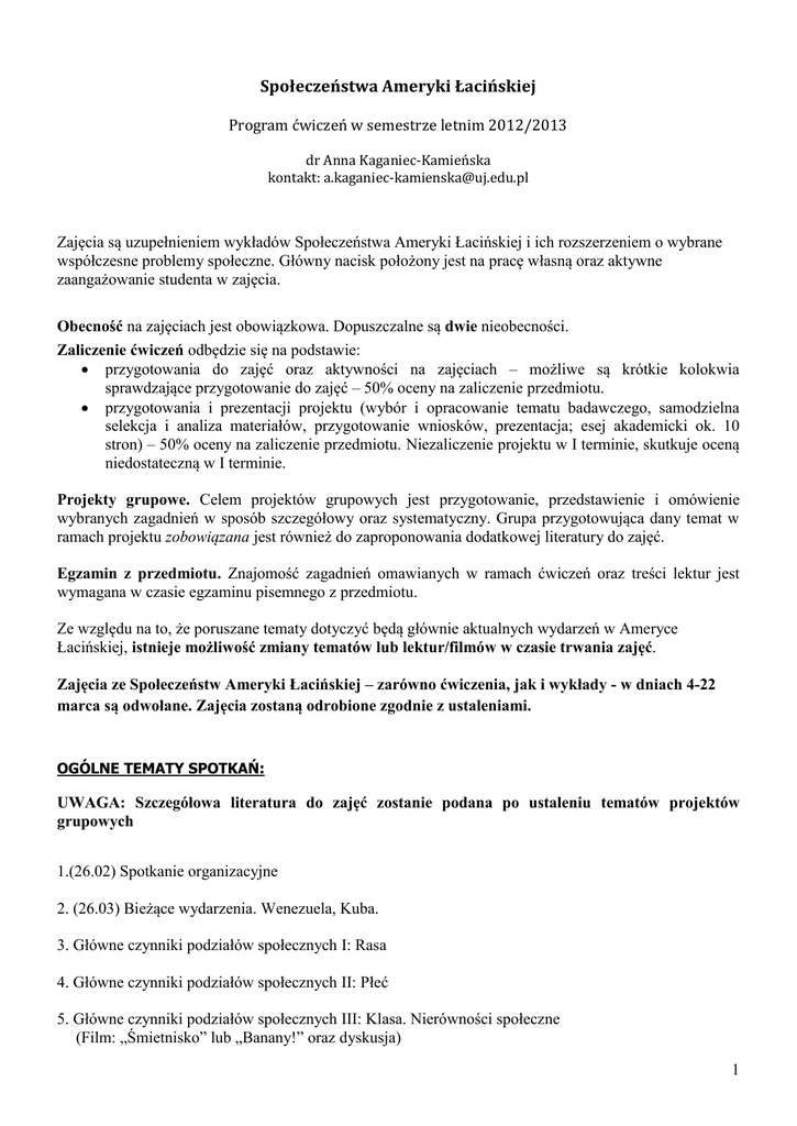 Społeczeństwa Ameryki Łacińskiej Program ćwiczeń w semestrze letnim 2012/2013 dr Anna Kaganiec-Kamieńska kontakt: [email protected] Zajęcia są uzupełnieniem wykładów Społeczeństwa Ameryki Łacińskiej i ich rozszerzeniem o wybrane współczesne problemy społeczne. Główny nacisk położony jest na pracę własną oraz aktywne zaangażowanie studenta w zajęcia. Obecność na zajęciach jest obowiązkowa. Dopuszczalne są dwie nieobecności. Zaliczenie ćwiczeń odbędzie się na podstawie: przygotowania do zajęć oraz aktywności na zajęciach – możliwe są krótkie kolokwia sprawdzające przygotowanie do zajęć – 50% oceny na zaliczenie przedmiotu. przygotowania i prezentacji projektu (wybór i opracowanie tematu badawczego, samodzielna selekcja i analiza materiałów, przygotowanie wniosków, prezentacja; esej akademicki ok. 10 stron) – 50% oceny na zaliczenie przedmiotu. Niezaliczenie projektu w I terminie, skutkuje oceną niedostateczną w I terminie. Projekty grupowe. Celem projektów grupowych jest przygotowanie, przedstawienie i omówienie wybranych zagadnień w sposób szczegółowy oraz systematyczny. Grupa przygotowująca dany temat w ramach projektu zobowiązana jest również do zaproponowania dodatkowej literatury do zajęć. Egzamin z przedmiotu. Znajomość zagadnień omawianych w ramach ćwiczeń oraz treści lektur jest wymagana w czasie egzaminu pisemnego z przedmiotu. Ze względu na to, że poruszane tematy dotyczyć będą głównie aktualnych wydarzeń w Ameryce Łacińskiej, istnieje możliwość zmiany tematów lub lektur/filmów w czasie trwania zajęć. Zajęcia ze Społeczeństw Ameryki Łacińskiej – zarówno ćwiczenia, jak i wykłady - w dniach 4-22 marca są odwołane. Zajęcia zostaną odrobione zgodnie z ustaleniami. OGÓLNE TEMATY SPOTKAŃ: UWAGA: Szczegółowa literatura do zajęć zostanie podana po ustaleniu tematów projektów grupowych 1.(26.02) Spotkanie organizacyjne 2. (26.03) Bieżące wydarzenia. Wenezuela, Kuba. 3. Główne czynniki podziałów społecznych I: Rasa 4. Główne czynniki podziałów społecznych II: Płeć 5. Główne czynniki podziałów społecznych III: Klasa. Nierówności społeczne (Film: „Śmietnisko” lub „Banany!” oraz dyskusja) 1 6. Migracje ludności 7. Problemy miast Polecany film (dodatkowy): „Miasto Słońca” lub „Wojownik światła” (Biblioteka latynoamerykańska) 8. Dziecko. Zagrożenia i szanse Polecany film: „El sistema” – szanse edukacyjne 9. Ruchy rewolucyjne i ich konsekwencje społeczne (Film: „Państwo strachu” oraz dyskusja) 10. Przemoc państwowa – proces rozliczeń 11. Społeczeństwo obywatelskie 12. Ruchy społeczne 13. Ekologia 14. Przestępczość zorganizowana I. Wojna narkotykowa i problem narkotyków 15. Przestępczość zorganizowana II. Handel ludźmi. 2