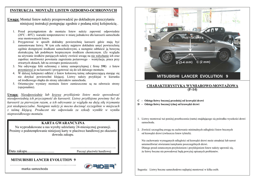 INSTRUKCJA MONTAŻU LISTEW OZDOBNO-OCHRONNYCH Uwaga: Montaż listew należy przeprowadzić po dokładnym przeczytaniu niniejszej instrukcji postępując zgodnie z podaną niżej kolejnością . 1. Przed przystąpieniem do montażu listew należy zapewnić odpowiednie (20oC - 40oC) warunki temperaturowe w miarę jednakowe dla karoserii samochodu oraz montowanych listew. 2. Przygotować w sposób dokładny powierzchnię karoserii gdzie mają być zamontowane listwy. W tym celu należy najpierw dokładnie umyć powierzchnię ogólnie dostępnymi środkami samochodowymi, a następnie odtłuścić ją benzyną ekstrakcyjną lub podobnym bezpiecznym środkiem chemicznym. (Ze względu na używanie środków parujących należy zwrócić uwagę na nie wdychanie ich oraz zapobiec możliwości powstania zagrożenia pożarowego – wentylacja, praca przy otwartych oknach, lub na zewnątrz pomieszczeń). 3. Nie odrywając folii ochronnej z taśmy samoprzylepnej ( firmy 3M) z listew przymierzyć je na karoserii i przygotować się do ich dalszego montażu. 4. W dalszej kolejności odkleić z listew kolorową taśmę zabezpieczającą starając się nie dotykać powierzchni klejącej. Listwy należy przyklejać w kierunku od środkowego słupka do strony zderzaków samochodu. 5. Orientacyjne wymiary montażu listew zamieszczone są na odwrocie strony (opcjonalnie). Uwaga: Nieodpowiednie lub krzywe przyklejenie listew może spowodować nieodpowiednią ich przyczepność do karoserii. Listwy przyklejone powinny być do karoserii za pierwszym razem, a ich odrywanie ze względu na dużą siłę trzymania jest niedopuszczalne. Następnie należy je mocno docisnąć szczególnie w miejscach z taśmą klejącą. Producent nie odpowiada za szkody wynikłe w wyniku nieprawidłowego montażu. KARTA GWARANCYJNA Na wyprodukowane u nas wyroby udzielamy 24-miesięcznej gwarancji. Prosimy o podstemplowanie niniejszej karty w placówce handlowej po okazaniu dowodu zakupu. ……………………………….. Data zakupu....................…...... MITSUBISHI LANCER EVOLUTION 9 ………………………………………..……... marka samochodu Pieczęć placówki handlowej CHARAKTERYSTYKA WYMIAROWO-MONTAŻOWA (F-14) C - Odstęp listwy bocznej przedniej od krawędzi drzwi D - Odstęp listwy bocznej tylnej od krawędzi drzwi 1. Listwy montować tuż poniżej przetłoczenia (rantu) znajdującego się pośrodku wysokości drzwi samochodu. 2. Zwrócić szczególną uwagę na zachowanie minimalnych odległości listew bocznych od krawędzi drzwi (zwłaszcza listew tylnich). Nie zachowanie wymaganych odległości od krawędzi drzwi może utrudniać lub nawet uniemożliwiać otwieranie/zamykanie poszczególnych drzwi. Dlatego przed ostatecznym przyłożeniem i przyklejeniem listew należy upewnić się, że listwy boczne nie powodować będą powyżej opisanych problemów. Sugestia: Listwy boczne samochodowe najlepiej montować w kilka osób.