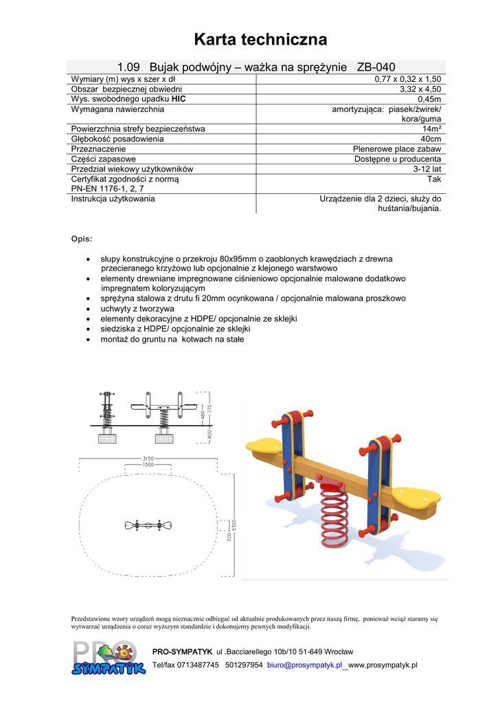 Karta techniczna 1.09 Bujak podwójny – ważka na sprężynie ZB-040 Wymiary (m) wys x szer x dł Obszar bezpiecznej obwiedni Wys. swobodnego upadku HIC Wymagana nawierzchnia Powierzchnia strefy bezpieczeństwa Głębokość posadowienia Przeznaczenie Części zapasowe Przedział wiekowy użytkowników Certyfikat zgodności z normą PN-EN 1176-1, 2, 7 Instrukcja użytkowania 0,77 x 0,32 x 1,50 3,32 x 4,50 0,45m amortyzująca: piasek/żwirek/ kora/guma 14m² 40cm Plenerowe place zabaw Dostępne u producenta 3-12 lat Tak Urządzenie dla 2 dzieci, służy do huśtania/bujania. Opis: słupy konstrukcyjne o przekroju 80x95mm o zaoblonych krawędziach z drewna przecieranego krzyżowo lub opcjonalnie z klejonego warstwowo elementy drewniane impregnowane ciśnieniowo opcjonalnie malowane dodatkowo impregnatem koloryzującym sprężyna stalowa z drutu fi 20mm ocynkowana / opcjonalnie malowana proszkowo uchwyty z tworzywa elementy dekoracyjne z HDPE/ opcjonalnie ze sklejki siedziska z HDPE/ opcjonalnie ze sklejki montaż do gruntu na kotwach na stałe Przedstawione wzory urządzeń mogą nieznacznie odbiegać od aktualnie produkowanych przez naszą firmę, ponieważ wciąż staramy się wytwarzać urządzenia o coraz wyższym standardzie i dokonujemy pewnych modyfikacji. PRO-SYMPATYK ul .Bacciarellego 10b/10 51-649 Wrocław Tel/fax 0713487745 501297954 [email protected] www.prosympatyk.pl
