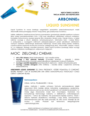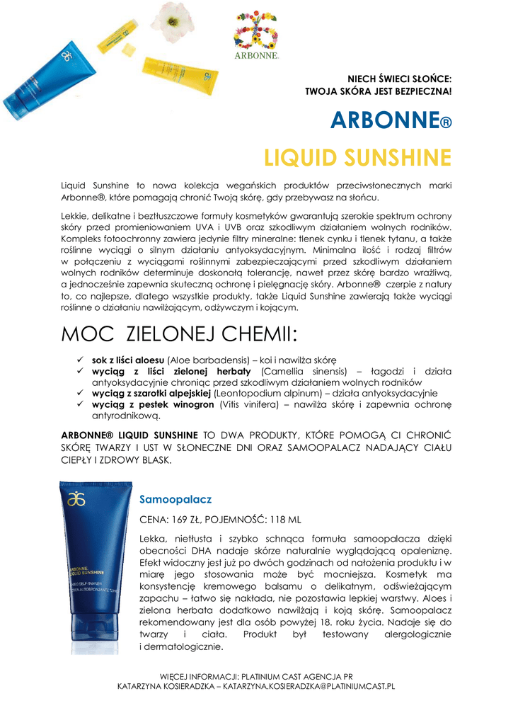 NIECH ŚWIECI SŁOŃCE: TWOJA SKÓRA JEST BEZPIECZNA! ARBONNE® LIQUID SUNSHINE Liquid Sunshine to nowa kolekcja wegańskich produktów przeciwsłonecznych marki Arbonne®, które pomagają chronić Twoją skórę, gdy przebywasz na słońcu. Lekkie, delikatne i beztłuszczowe formuły kosmetyków gwarantują szerokie spektrum ochrony skóry przed promieniowaniem UVA i UVB oraz szkodliwym działaniem wolnych rodników. Kompleks fotoochronny zawiera jedynie filtry mineralne: tlenek cynku i tlenek tytanu, a także roślinne wyciągi o silnym działaniu antyoksydacyjnym. Minimalna ilość i rodzaj filtrów w połączeniu z wyciągami roślinnymi zabezpieczającymi przed szkodliwym działaniem wolnych rodników determinuje doskonałą tolerancję, nawet przez skórę bardzo wrażliwą, a jednocześnie zapewnia skuteczną ochronę i pielęgnację skóry. Arbonne® czerpie z natury to, co najlepsze, dlatego wszystkie produkty, także Liquid Sunshine zawierają także wyciągi roślinne o działaniu nawilżającym, odżywczym i kojącym. MOC ZIELONEJ CHEMII: sok z liści aloesu (Aloe barbadensis) – koi i nawilża skórę wyciąg z liści zielonej herbaty (Camellia sinensis) – łagodzi i działa antyoksydacyjnie chroniąc przed szkodliwym działaniem wolnych rodników wyciąg z szarotki alpejskiej (Leontopodium alpinum) – działa antyoksydacyjnie wyciąg z pestek winogron (Vitis vinifera) – nawilża skórę i zapewnia ochronę antyrodnikową. ARBONNE® LIQUID SUNSHINE TO DWA PRODUKTY, KTÓRE POMOGĄ CI CHRONIĆ SKÓRĘ TWARZY I UST W SŁONECZNE DNI ORAZ SAMOOPALACZ NADAJĄCY CIAŁU CIEPŁY I ZDROWY BLASK. Samoopalacz CENA: 169 ZŁ, POJEMNOŚĆ: 118 ML Lekka, nietłusta i szybko schnąca formuła samoopalacza dzięki obecności DHA nadaje skórze naturalnie wyglądającą opaleniznę. Efekt widoczny jest już po dwóch godzinach od nałożenia produktu i w miarę jego stosowania może być mocniejsza. Kosmetyk ma konsystencję kremowego balsamu o delikatnym, odświeżającym zapachu – łatwo się nakłada, nie pozostawia lepkiej warstwy. Aloes i zielona herbata dodatkowo nawilżają i koją skórę. Samoopalacz rekomendowany jest dla osób powyżej 18. roku życia. Nadaje się do twarzy i ciała. Produkt był testowany alergologicznie i dermatologicznie. WIĘCEJ INFORMACJI: PLATINIUM CAST AGENCJA PR KATARZYNA KOSIERADZKA – [email protected] Sposób użycia: Nałóż produkt równomiernie na oczyszczoną i nawilżoną skórę. Po zastosowaniu produktu umyj ręce. Ponieważ Samoopalacz nie zawiera filtru przeciwsłonecznego, stosuj Emulsję z mineralnym filtrem przeciwsłonecznym SPF Do twarzy i Do ciała, aby chronić skórę przed działaniem słońca. Czy wiesz, że…? Aby w pełni pokryć te części ciała dorosłego człowieka, które są najbardziej narażone na działanie promieni słonecznych, potrzeba sześciu pełnych łyżeczek (ok. 30 ml) kremu z filtrem przeciwsłonecznym. Jest to mniej więcej ilość kremu, która zmieści się na dłoni. Wetrzyj równą warstwę kremu w skórę, mając na uwadze, że filtr przeciwsłoneczny utrzymuje się na powierzchni skóry, pomagając fizycznie odbijać promienie słoneczne. Na skórze powinna być widoczna biała warstwa, co w przeciwieństwie do chemicznych filtrów ochronnych jest cechą charakterystyczną filtrów mineralnych zawierających tlenek cynku. WIĘCEJ INFORMACJI: PLATINIUM CAST AGENCJA PR KATARZYNA KOSIERADZKA – [email protected]