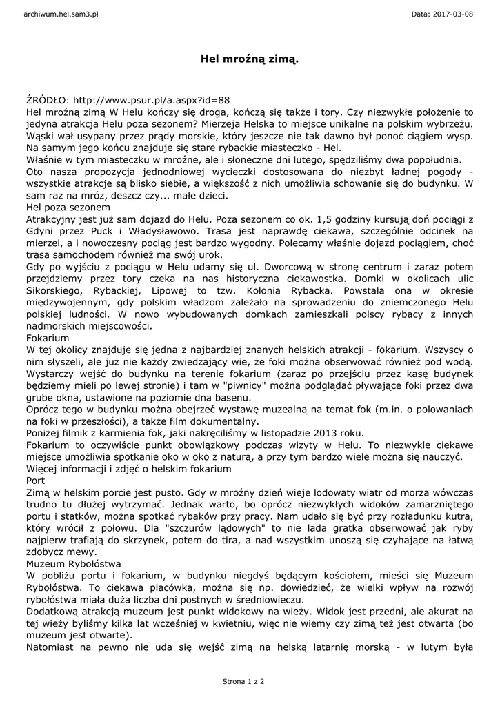 archiwum.hel.sam3.pl Data: 2017-03-08 Hel mroźną zimą. ŹRÓDŁO: http://www.psur.pl/a.aspx?id=88 Hel mroźną zimą W Helu kończy się droga, kończą się także i tory. Czy niezwykłe położenie to jedyna atrakcja Helu poza sezonem? Mierzeja Helska to miejsce unikalne na polskim wybrzeżu. Wąski wał usypany przez prądy morskie, który jeszcze nie tak dawno był ponoć ciągiem wysp. Na samym jego końcu znajduje się stare rybackie miasteczko - Hel. Właśnie w tym miasteczku w mroźne, ale i słoneczne dni lutego, spędziliśmy dwa popołudnia. Oto nasza propozycja jednodniowej wycieczki dostosowana do niezbyt ładnej pogody wszystkie atrakcje są blisko siebie, a większość z nich umożliwia schowanie się do budynku. W sam raz na mróz, deszcz czy... małe dzieci. Hel poza sezonem Atrakcyjny jest już sam dojazd do Helu. Poza sezonem co ok. 1,5 godziny kursują doń pociągi z Gdyni przez Puck i Władysławowo. Trasa jest naprawdę ciekawa, szczególnie odcinek na mierzei, a i nowoczesny pociąg jest bardzo wygodny. Polecamy właśnie dojazd pociągiem, choć trasa samochodem również ma swój urok. Gdy po wyjściu z pociągu w Helu udamy się ul. Dworcową w stronę centrum i zaraz potem przejdziemy przez tory czeka na nas historyczna ciekawostka. Domki w okolicach ulic Sikorskiego, Rybackiej, Lipowej to tzw. Kolonia Rybacka. Powstała ona w okresie międzywojennym, gdy polskim władzom zależało na sprowadzeniu do zniemczonego Helu polskiej ludności. W nowo wybudowanych domkach zamieszkali polscy rybacy z innych nadmorskich miejscowości. Fokarium W tej okolicy znajduje się jedna z najbardziej znanych helskich atrakcji - fokarium. Wszyscy o nim słyszeli, ale już nie każdy zwiedzający wie, że foki można obserwować również pod wodą. Wystarczy wejść do budynku na terenie fokarium (zaraz po przejściu przez kasę budynek będziemy mieli po lewej stronie) i tam w "piwnicy" można podglądać pływające foki przez dwa grube okna, ustawione na poziomie dna basenu. Oprócz tego w budynku można obejrzeć wystawę muzealną na temat fok (m.in. o polowaniach na foki w przeszłości), a także film dokumentalny. Poniżej filmik z karmienia fok, jaki nakręciliśmy w listopadzie 2013 roku. Fokarium to oczywiście punkt obowiązkowy podczas wizyty w Helu. To niezwykle ciekawe miejsce umożliwia spotkanie oko w oko z naturą, a przy tym bardzo wiele można się nauczyć. Więcej informacji i zdjęć o helskim fokarium Port Zimą w helskim porcie jest pusto. Gdy w mroźny dzień wieje lodowaty wiatr od morza wówczas trudno tu dłużej wytrzymać. Jednak warto, bo oprócz niezwykłych widoków zamarzniętego portu i statków, można spotkać rybaków przy pracy. Nam udało się być przy rozładunku kutra, który wrócił z połowu. Dla "szczurów lądowych" to nie lada gratka obserwować jak ryby najpierw trafiają do skrzynek, potem do tira, a nad wszystkim unoszą się czyhające na łatwą zdobycz mewy. Muzeum Rybołóstwa W pobliżu portu i fokarium, w budynku niegdyś będącym kościołem, mieści się Muzeum Rybołóstwa. To ciekawa placówka, można się np. dowiedzieć, że wielki wpływ na rozwój rybołóstwa miała duża liczba dni postnych w średniowieczu. Dodatkową atrakcją muzeum jest punkt widokowy na wieży. Widok jest przedni, ale akurat na tej wieży byliśmy kilka lat wcześniej w kwietniu, więc nie wiemy czy zimą też jest otwarta (bo muzeum jest otwarte). Natomiast na pewno nie uda się wejść zimą na helską latarnię morską - w lutym była Strona 1 z 2 archiwum.hel.sam3.pl Data: 2017-03-08 Hel mroźną zimą. zamknięta na cztery spusty. Chwila odpoczynku W pobliżu portu znajduje się klimatyczna, pełna starych, rybackich domków ulica Wiejska. Nawet poza sezonem można tam znaleźć jakiś otwarty bar, a z naszych doświadczeń wynika, że tamtejsze gastronomie oferują smaczne posiłki. Stamtąd można już dojść do stacji PKP, mijając po drodze m.in. pomnik Obrońców Helu w 1939 roku oraz pomnik Stefana Żeromskiego (w kształcie żagla). Z dziećmi Wycieczkę odbyliśmy z wózkiem dziecięcym, więc - da się. Śniegu leżało dużo, ale chodniki były w miarę dobrze odśnieżone. Pociąg kursujący do Helu jest przystosowany do wózków. Fokarium na pewno zainteresuje dzieci, a sala, w której można oglądać foki przez podwodne okno, jest bardzo wygodna dla najmłodszych. Przestrzenna, okna zaczynają się niemal przy podłodze, więc najmniejsze nawet dzieci dobrze wszystko widzą. Jednocześnie w tej sali jest cały czas wyświetlany film dokumentalny, są też krzesełka by usiąść i go obejrzeć. Z wózkiem można wjechać na ogrodzony teren fokarium, ale już nie do budynku. Wózek musi zostać na zewnątrz, gdyż w niewielkim budynku nie ma odpowiednich warunków. W porcie jeden z falochronów ma barierki po obu jego stronach, co czyni go niesamowicie wygodnym dla spacerów z dziećmi. Niestety, rybacy wyładowują ryby z kutrów po drugiej stronie portu. Tam oczywiście barierek nie ma, ale praca rybaków jest zwykle dla dzieci tak ciekawa, że raczej nigdzie ich nie będzie niosło. W Muzeum Rybołówstwa byliśmy kilka lat temu bez dzieci, więc trudno nam się wypowiedzieć na temat warunków zwiedzania. Raczej było tam dość ciasno, a wejście na wieżę strome. /Piotr Surowiecki/ 27 - 01 - 2014 El¿bieta Wiekiera Urz±d Miasta Helu Strona 2 z 2