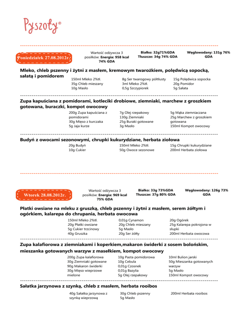 -----------------------------------------------------------------------------------------------------PO Białko: 32g71%GDA Węglowodany: 131g 76% Wartość odżywcza 3 Tłuszcze: 34g 74% GDA GDA posiłków: Energia: 958 kcal Poniedziałek 27.08.2012r. 74% GDA Mleko, chleb pszenny i żytni z masłem, kremowym twarożkiem, polędwicą sopocką, sałatą i pomidorem 150ml Mleko 2%tł. 35g Chleb mieszany 10g Masło 8g Ser twarogowy półtłusty 3ml Mleko 2%tł. 0,5g Szczypiorek 15g Polędwica sopocka 20g Pomidor 5g Sałata ------------------------------------------------------------------------------------------------------Zupa kapuściana z pomidorami, kotleciki drobiowe, ziemniaki, marchew z groszkiem gotowana, buraczki, kompot owocowy 200g Zupa kapuściana z pomidorami 30g Mięso z kurczaka 5g Jaja kurze 7g Olej rzepakowy 130g Ziemniaki 25g Buraki gotowane 3g Masło 5g Mąka ziemniaczana 25g Marchew z groszkiem gotowana 150ml Kompot owocowy ------------------------------------------------------------------------------------------------------Budyń z owocami sezonowymi, chrupki kukurydziane, herbata ziołowa na miodem,bawarka 20g Budyń 10g Cukier 150ml Mleko 2%tł. 50g Owoce sezonowe 15g Chrupki kukurydziane 200ml Herbata ziołowa ------------------------------------------------------------------------------------------------------ Wtorek 28.08.2012r. Wartość odżywcza 3 posiłków: Energia: 969 kcal 75% GDA Białko: 33g 73%GDA Tłuszcze: 37g 80% GDA Węglowodany: 126g 73% GDA Płatki owsiane na mleku z gruszką, chleb pszenny i żytni z masłem, serem żółtym i ogórkiem, kalarepa do chrupania, herbata owocowa 150ml Mleko 2%tł. 20g Płatki owsiane 5g Cukier trzcinowy 40g Gruszka 0,01g Cynamon 20g Chleb mieszany 5g Masło 20g Ser żółty 20g Ogórek 25g Kalarepa pokrojona w słupki 200ml Herbata owocowa ------------------------------------------------------------------------------------------------------Zupa kalafiorowa z ziemniakami i koperkiem,makaron świderki z sosem bolońskim, mieszanka gotowanych warzyw z masełkiem, kompot owocowy 200g Zupa kalafiorowa 30g Ziemniaki gotowane 90g Makaron świderki 30g Mięso wieprzowe mielone 10g Pasta pomidorowa 10g Cebula 0,01g Czosnek 0,01g Bazylia 5g Olej rzepakowy 10ml Bulion jarski 50g Mieszanka gotowanych warzyw 5g Masło 150ml Kompot owocowy ------------------------------------------------------------------------------------------------------Sałatka jarzynowa z szynką, chleb z masłem, herbata rooibos 40g Sałatka jarzynowa z szynką wieprzową 30g Chleb pszenny 5g Masło 200ml Herbata rooibos ----------------------------------------------------------------------------------------------------------Wartość odżywcza 3 posiłków: Energia: 969 kcal 75% GDA Środa 29.08.2012r. Białko:30g 67%GDA Tłuszcze: 36g 78% GDA Węglowodany: 131g 76% GDA Kakao, chleb pszenny i żytni z masłem, twarożkiem z koperkiem, szynką z indyka i rzodkiewką 150ml Mleko 2%tł. 10g Masło 0,5g Koperek 10g Kakao 35g Chleb mieszany 10g Ser twarogowy półtłusty 3ml Mleko 2%tł. 15g Szynka z indyka 10g Rzodkiewka ------------------------------------------------------------------------------------------------------Zupa pomidorowa z makaronem, gulasz wieprzowy z warzywami, ziemniaki, brokuł gotowany, kompot owocowy 200ml Zupa pomidorowa 5ml Śmietana roślinna 20g Makaron gotowany 35g Mięso wieprzowe 7g Olej rzepakowy 10ml Bulion jarski 5g Pasta pomidorowa 10g Cebula 5g Mąka ziemniaczana 30g Brokuł gotowany 30g Mieszanka gotowanych warzyw 130g Ziemniaki 150ml Kompot owocowy ------------------------------------------------------------------------------------------------------Kaszka manna na mleku z morelami, woda mineralna 50g Kasza manna 80ml Mleko 2% tł. 0,01g Wanilia 3g Masło 5g Cukier trzcinowy 50g Morele 200ml Woda mineralna ------------------------------------------------------------------------------------------------------ Czwartek 30.08.2012r. Wartość odżywcza 3 posiłków: Energia: 945 kcal 73% GDA Białko: 32g 71%GDA Tłuszcze: 33g 72% GDA Węglowodany: 130g 75% GDA Mleko, chleb pszenny i żytni z masłem, pastą jajeczną, szynką drobiową i ogórkiem 150ml Mleko 2%tł. 25g Jajko gotowane 15g Szynka z indyka małosolnym 35g Chleb mieszany 10g Masło 2g Majonez 2g Jogurt naturalny 20g Ogórek małosolny ------------------------------------------------------------------------------------------------------Krem warzywny z grzankami, pulpeciki z indyka w sosie koperkowym, ziemniaki puree, buraczki, woda mineralna 200g Krem warzywny 15g Chleb pszenny, grzanki 35g Mięso z indyka 5g Cebula 10g Mąką ziemniaczana 3g Olej rzepakowy 10ml Śmietana roślinna 130g Ziemniaki 5g Margaryna 50g Buraki 200ml Woda mineralna ------------------------------------------------------------------------------------------------------Kisiel owocowy z brzoskwinią, chrupki kukurydziane, herbata rooibos 120g Kisiel owocowy z brzoskwinią 20g Chrupki kukurydziane 200ml Herbata rooibos -----------------------------------------------------------------------------------------------------PO Białko: 31g 69%GDA Węglowodany: 131g 76% Wartość odżywcza 3 Piątek 31.08.2012r. Tłuszcze: 35g 76% GDA GDA posiłków: Energia: 963 kcal 75% GDA Kakao, bułka pszenna z masłem, ser żółty, pastą rybną i pomidorem 150ml Mleko 2%tł. 10g Kakao 35g Bułka pszenna 10g Masło 15g Ser żółty 10g Tuńczyk 2g Jogurt naturalny 1g Majonez domowy 20g Pomidor 1g Szczypiorek ------------------------------------------------------------------------------------------------------Barszcz czerwony, pulpeciki rybne z zieloną pietruszką w sosie szpinakowym, ryż, fasolka szparagowa, kompot owocowy 200g Barszcz czerwony 5ml Śmietana roślinna 30g Dorsz, filet 10g Jaja kurze 5g Mąka ziemniaczana 15g Szpinak 10ml Bulion jarski 5g Olej rzepakowy 2g Pietruszka, natka 5ml Śmietana roślinna 80g Ryż gotowany 50g Fasolka szparagowa 5g Masło 150ml Kompot owocowy -------------------------------