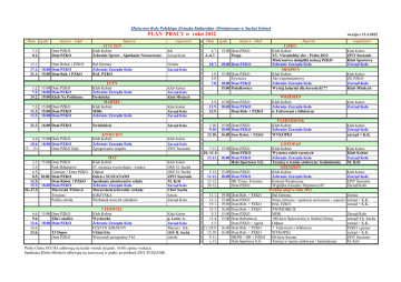 Miejscowe Koło Polskiego Związku Kulturalno -Oświatowego w Suchej Górnej PLAN PRACY w roku 2012 Data 3.1. 8.1. godz. miejsce - lokal Dom PZKO Dom PZKO 13.1. Dom Robot. i PZKO 17.1. 18.00 Dom PZKO 21.1. 19.00 Dom Rob. i PZKO Impreza STYCZEŃ Klub Kobiet Zebranie Spraw. , Spotkanie Noworoczne Bal Gminny Zebranie Zarządu Koła BAL PZKO organizator KK Zarząd Koła Gmina 7.3. 15.00 Dom PZKO 11.3. 15.00 Dom PZKO 13.3. 18.00 Dom PZKO 31.3. 16.00 Dom PZKO Świniobicie Zarząd Koła 4.4. 15.00 Dom PZKO 10.4. 18.00 Dom PZKO 13. - 15.4. Dom PZKO Guty KWIECIEŃ Klub Kobiet Zebranie Zarządu Koła Zgrupowanie zespołu Klub Kobiet Zarząd Koła 2.5. 15.00 Dom PZKO 3.5. Park Bohaterów 6.5. Centrum + Dom PZKO 8.5. 10.00 Dom PZKO 12.5. Dom Robot. i PZKO 15.5. 18.00 Dom PZKO 26.-27.5. Moravská Třebová Trzyniec Polska szkoła MAJ Klub Kobiet 67. rocznica wyzwolenia - wieńce Odpust Dzień z SUSZANAMI Spotkanie absolwentów szkoly Zebranie Zarządu Koła Morawskotrzebowskie Arkady IGRZYSKA Werbunek nowych członków 6.6. 15.00 Dom PZKO 9.6. Zlin i okolice 12.6. 18.00 Dom PZKO 16.6. 23.6. TJ Depos Dom PZKO CZERWIEC Klub Kobiet Wycieczka Zebranie Zarządu Koła FESTYN SZKOLNY Vítání léta Wieczorek pożegnalny 9 kl. Próby Chóru SUCHA odbywają się każdy wtorek od godz. 16:00, oprócz wakacji. Spotkania Klubu Młodych odbywają się zazwyczaj w piątki, po próbach ZPiT SUSZANIE. Data godz. miejsce - lokal 4.7. 4.-6.7. 15.00 Dom PZKO Praga 10.7. 18.00 Dom PZKO 1.8. 5.8. 7.8. 15.00 Dom PZKO Žywocice 18.00 Dom PZKO 15.00 Podołkowice Impreza LIPIEC Klub Kobiet XV. Všesokolský slet - Praha 2012 Mistrzostwa minipiłki nożnej PZKO Zebranie Zarządu Koła SIERPIEŃ Klub Kobiet Akt wspomnieniowy Zebranie Zarządu Koła Wyścig kolarski dla dorosłych??? 5.9. 11.9. 22.9. 15.00 Dom PZKO 18.00 Dom PZKO Dom Rob. + PZKO WRZESIEŃ Klub Kobiet Zebranie Zarządu Koła 6. Fedrowani z folklorym 3.10. 9.10. 13.10. 15.00 Dom PZKO 18.00 Dom PZKO 16.00 Dom Robot. + PZKO PAŹDZIERNIK Klub Kobiet Zebranie Zarządu Koła WYKOPKI Zarząd Koła LUTY Klub Kobiet Zebranie Zarządu Koła Dyskoteka MARZEC Klub Kobiet MDK Zebranie Zarządu Koła 1.2. 15.00 Dom PZKO 7.2. 18.00 Dom PZKO 24.2. 19.00 Klub Na Poddaszu wersja z 13.3.2012 Klub Kobiet Zarząd Koła Klub Młodych Klub Kobiet Zarząd Koła Zarząd Koła ZPiT Suszanie Klub Kobiet ObÚ H. Suchá ObÚ H. Suchá ZPiT Suszanie M. Kriš Zarząd Koła 7.11. 15.00 Dom PZKO 10.-11.11. Dom PZKO 13.11. 18.00 Dom PZKO Hala Sportowa S.G. 5.12. 11.12. 15.12. 28.12. 15.00 Dom PZKO 18.00 Dom PZKO DK Trisia, Trzyniec Dom PZKO Chór Sucha Szkoła Zarząd Koła Klub Kobiet p. Lotter A. Zarząd Koła Macierz Szk. ObÚ H. Suchá szkoła 11.1. 13.1. 19.1. 23.3. 9.3. 13.4. 5.5. 21./28.9. 12.10. 9.11. x.11. 19.00 15.00 19.00 16.00 15.00 15.00 Dom Rob. + PZKO Dom PZKO Dom Rob. + PZKO Dom Rob. + PZKO Dom PZKO Dom Robotniczy Dom PZKO + ogród 16.00 Dom Rob. + PZKO 16.00 Dom Rob. + PZKO DKPB + DR + PZKO Hala Sportowa S.G. LISTOPAD Klub Kobiet Wystawa robót ręcznych Zebranie Zarządu Koła Turniej w tenisie stołowym / badmintonie GRUDZIEŃ Klub Kobiet Zebranie Zarządu Koła Koncert Świąteczny Wigilijka Zarządu i Rejonowych? Terminy akcji w roku 2013 Bal Gminny organizator Klub Kobiet ZPiT Suszanie Klub Sportowy Zarząd Koła Klub Kobiet ZG PZKO Zarząd Koła Klub Mlodych Klub Kobiet Zarząd Koła Klub Kobiet Zarząd Koła zarząd + K.K. Klub Kobiet Klub Kobiet Zarząd Koła M. Kriš Klub Kobiet Zarząd Koła ZPiT Suszanie Zarząd Koła Gmina Walne Zebranie + spotkanie noworoczne - zaprosić Kadłubiec, zarząd + K.K. Wierzgóń BAL PZKO ŚWINIOBICIE MDK 100-lecie Śpiewactwa w Suchej Górnej Odpust 7. Fedrowani z folklorym WYKOPKI 60-lecie Suszan Turniej w tenisie stołowym / badmintonie zarząd + K.K. Zarząd Koła zarząd+Ch. Sucha zarząd + K.K. PZKO i gmina zarząd + K.K. ZPiT Suszanie M. Kriš
