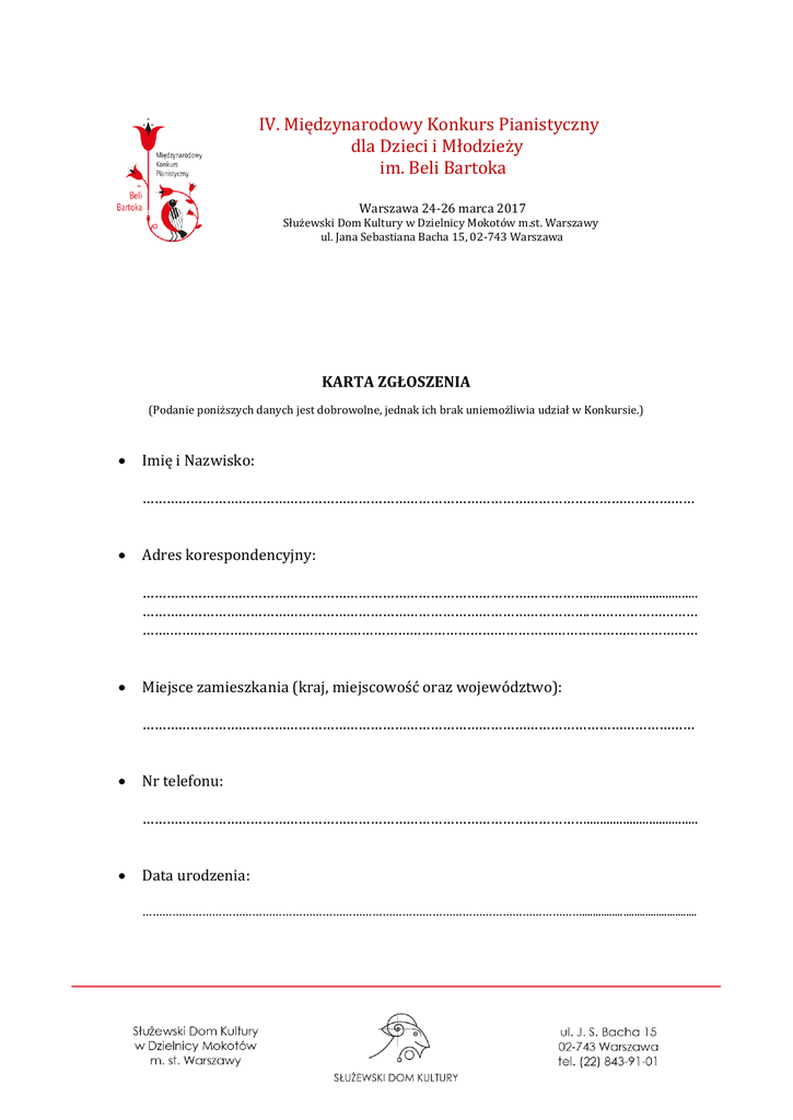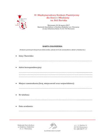 IV. Międzynarodowy Konkurs Pianistyczny dla Dzieci i Młodzieży im. Beli Bartoka Warszawa 24-26 marca 2017 Służewski Dom Kultury w Dzielnicy Mokotów m.st. Warszawy ul. Jana Sebastiana Bacha 15, 02-743 Warszawa KARTA ZGŁOSZENIA (Podanie poniższych danych jest dobrowolne, jednak ich brak uniemożliwia udział w Konkursie.) Imię i Nazwisko: ………………………………………………………………………………………………………………………… Adres korespondencyjny: ………………………………………………………………………………………………….................................. ………………………………………………………………………………………………….……………………… …….…………………………………………………………………………………………………………………… Miejsce zamieszkania (kraj, miejscowość oraz województwo): ………………………………………………………………………………………………………………………… Nr telefonu: ………………………………………………………………………………………………….................................. Data urodzenia: …………………………………………………………………………………………………………………….......................................... Informacja o edukacji artystycznej: Uczęszcza do: a) szkoły muzycznej posiadającej uprawnienia szkoły publicznej * b) placówki nie objętej systemem szkolnictwo artystycznego* (ognisko muzyczne, dom kultury, szkoła prywatna, nauka indywidualna) Lata nauki: ……………………………………………………………………………………………………….. *niepotrzebne skreślić OŚWIADCZENIE OPIEKUNA PRAWNEGO UCZESTNIKA KONKURSU Wyrażam zgodę na przetwarzanie danych osobowych zawartych w niniejszej Karcie wyłącznie w celach związanych z przeprowadzeniem Konkursu, zgodnie z ustawą z dnia 29 sierpnia 1997 r. o ochronie danych osobowych (tj. Dz. U. 2002 nr 101 poz. 926 ze zm.). Oświadczam, że zostałam/em poinformowany o dobrowolności podania danych osobowych, oraz o sposobie ich przetwarzania. ……………………………………………………………… (miejscowość i data) ………………………….......................... (podpis)