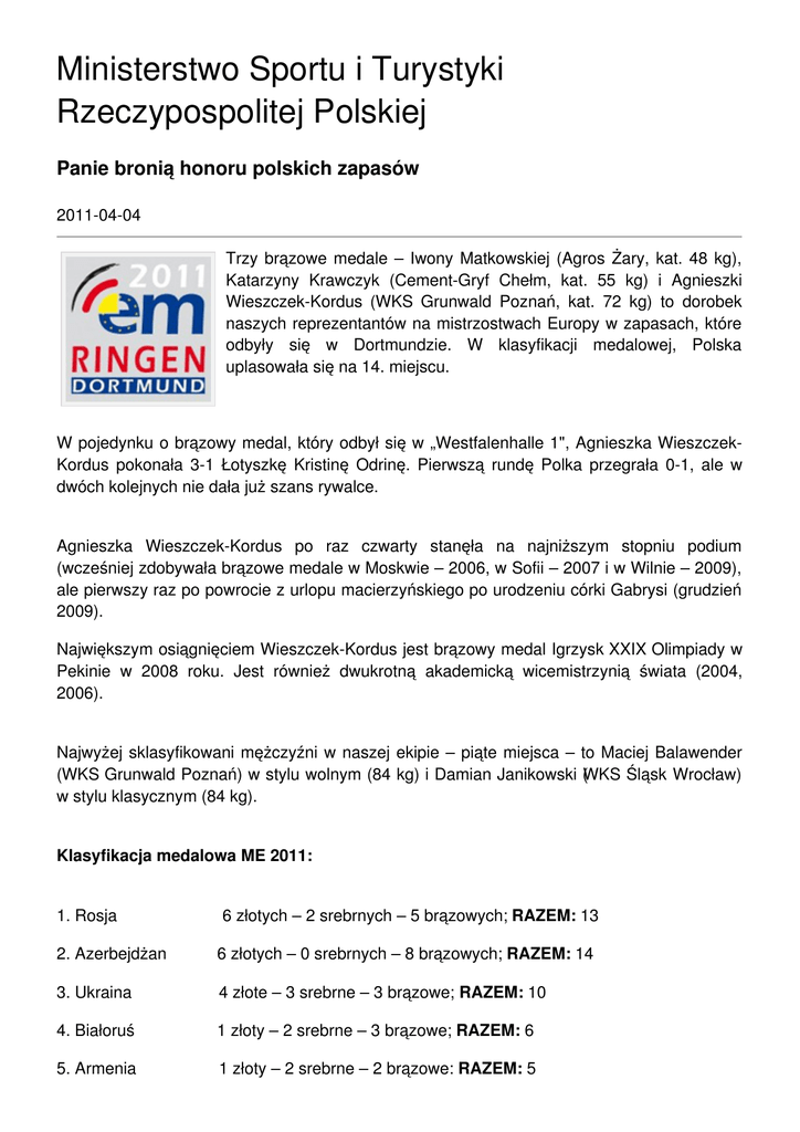 Ministerstwo Sportu i Turystyki Rzeczypospolitej Polskiej Panie bronią honoru polskich zapasów 2011-04-04 Trzy brązowe medale – Iwony Matkowskiej (Agros Żary, kat. 48 kg), Katarzyny Krawczyk (Cement-Gryf Chełm, kat. 55 kg) i Agnieszki Wieszczek-Kordus (WKS Grunwald Poznań, kat. 72 kg) to dorobek naszych reprezentantów na mistrzostwach Europy w zapasach, które odbyły się w Dortmundzie. W klasyfikacji medalowej, Polska uplasowała się na 14. miejscu. W pojedynku o brązowy medal, który odbył się w „Westfalenhalle 1", Agnieszka WieszczekKordus pokonała 3-1 Łotyszkę Kristinę Odrinę. Pierwszą rundę Polka przegrała 0-1, ale w dwóch kolejnych nie dała już szans rywalce. Agnieszka Wieszczek-Kordus po raz czwarty stanęła na najniższym stopniu podium (wcześniej zdobywała brązowe medale w Moskwie – 2006, w Sofii – 2007 i w Wilnie – 2009), ale pierwszy raz po powrocie z urlopu macierzyńskiego po urodzeniu córki Gabrysi (grudzień 2009). Największym osiągnięciem Wieszczek-Kordus jest brązowy medal Igrzysk XXIX Olimpiady w Pekinie w 2008 roku. Jest również dwukrotną akademicką wicemistrzynią świata (2004, 2006). Najwyżej sklasyfikowani mężczyźni w naszej ekipie – piąte miejsca – to Maciej Balawender (WKS Grunwald Poznań) w stylu wolnym (84 kg) i Damian Janikowski (WKS Śląsk Wrocław) w stylu klasycznym (84 kg). Klasyfikacja medalowa ME 2011: 1. Rosja 6 złotych – 2 srebrnych – 5 brązowych; RAZEM: 13 2. Azerbejdżan 6 złotych – 0 srebrnych – 8 brązowych; RAZEM: 14 3. Ukraina 4 złote – 3 srebrne – 3 brązowe; RAZEM: 10 4. Białoruś 1 złoty – 2 srebrne – 3 brązowe; RAZEM: 6 5. Armenia 1 złoty – 2 srebrne – 2 brązowe: RAZEM: 5 6. Gruzja 1 złoty – 2 srebrne – 1 brązowy; RAZEM: 4 7. Turcja 1 złoty – 1 srebrny – 1 brązowy: RAZEM: 3 8. Szwecja 1 złoty – 0 srebrnych – 0 brązowych; RAZEM: 1 9. Bułgaria 0 złotych – 3 srebrne – 4 brązowe; RAZEM: 7 10. Węgry 0 złotych – 2 srebrne – 3 brązowe: RAZEM: 5 11. Rumunia 0 złotych – 2 srebrne – 2 brązowe; RAZEM: 4 12. Mołdawia 0 złotych – 1 srebrne – 2 brązowe; RAZEM: 3 13. Albania 0 złotych – 1 srebrny – 0 brązowych; RAZEM: 1 14. POLSKA 0 złotych – 0 srebrnych – 3 brązowe;RAZEM: 3 15. Niemcy 0 złotych – 0 srebrnych – 2 brązowe; RAZEM: 2 16. Francja 0 złotych – 0 srebrnych – 1 brązowy; RAZEM: 1 Serbia 0 złotych – 0 srebrnych – 1 brązowy; RAZEM: 1 W. Brytania 0 złotych – 0 srebrnych – 1 brązowy; RAZEM: 1 Mistrzostwa Europy 2010: 3 medale Polaków – wszystkie brązowe: Adam Sobieraj (styl wolny – kat. 66 kg), Iwona Matkowska (kobiety – kat. 48 kg) i Agata Pietrzyk (kobiety – kat. 55 kg) Polska zajęła 15. miejsce w klasyfikacji medalowej Mistrzostwa Europy 2009: 4 medale Polaków – złoty: Monika Michalik (kobiety – kat. 63 kg); srebrne: Mariusz Łoś (styl klasyczny – kat. 55 kg) i Edward Barsegjan (styl klasyczny – kat. 60 kg); brązowy: Agnieszka Wieszczek (kobiety – kat. 72 kg) Polska zajęła 5. miejsce w klasyfikacji medalowej Mistrzostwa Europy 2008: 2 medale Polaków – oba brązowe: Iwona Matkowska-Sadowska (kobiety – kat. 48 kg) i Monika Michalik (kobiety – kat. 63 kg) Polska zajęła 17. miejsce w klasyfikacji medalowej