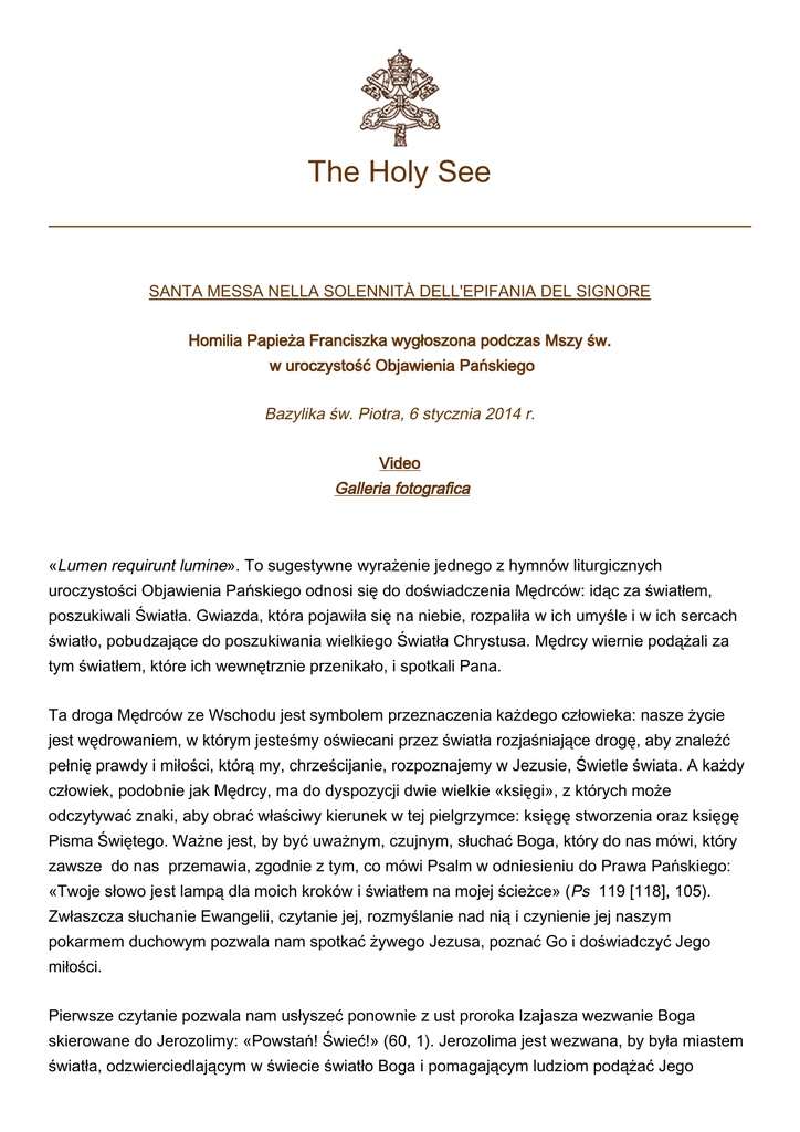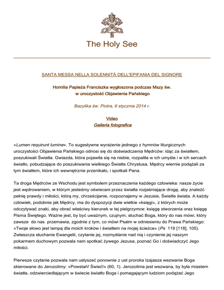 The Holy See SANTA MESSA NELLA SOLENNITÀ DELL'EPIFANIA DEL SIGNORE Homilia Papieża Franciszka wygłoszona podczas Mszy św. w uroczystość Objawienia Pańskiego Bazylika św. Piotra, 6 stycznia 2014 r. Video Galleria fotografica «Lumen requirunt lumine». To sugestywne wyrażenie jednego z hymnów liturgicznych uroczystości Objawienia Pańskiego odnosi się do doświadczenia Mędrców: idąc za światłem, poszukiwali Światła. Gwiazda, która pojawiła się na niebie, rozpaliła w ich umyśle i w ich sercach światło, pobudzające do poszukiwania wielkiego Światła Chrystusa. Mędrcy wiernie podążali za tym światłem, które ich wewnętrznie przenikało, i spotkali Pana. Ta droga Mędrców ze Wschodu jest symbolem przeznaczenia każdego człowieka: nasze życie jest wędrowaniem, w którym jesteśmy oświecani przez światła rozjaśniające drogę, aby znaleźć pełnię prawdy i miłości, którą my, chrześcijanie, rozpoznajemy w Jezusie, Świetle świata. A każdy człowiek, podobnie jak Mędrcy, ma do dyspozycji dwie wielkie «księgi», z których może odczytywać znaki, aby obrać właściwy kierunek w tej pielgrzymce: księgę stworzenia oraz księgę Pisma Świętego. Ważne jest, by być uważnym, czujnym, słuchać Boga, który do nas mówi, który zawsze do nas przemawia, zgodnie z tym, co mówi Psalm w odniesieniu do Prawa Pańskiego: «Twoje słowo jest lampą dla moich kroków i światłem na mojej ścieżce» (Ps 119 [118], 105). Zwłaszcza słuchanie Ewangelii, czytanie jej, rozmyślanie nad nią i czynienie jej naszym pokarmem duchowym pozwala nam spotkać żywego Jezusa, poznać Go i doświadczyć Jego miłości. Pierwsze czytanie pozwala nam usłyszeć ponownie z ust proroka Izajasza wezwanie Boga skierowane do Jerozolimy: «Powstań! Świeć!» (60, 1). Jerozolima jest wezwana, by była miastem światła, odzwierciedlającym w świecie światło Boga i pomagającym ludziom podążać Jego 2 drogami. Takie jest powołanie i misja ludu Bożego w świecie. Ale Jerozolima może nie odpowiedzieć na to wezwanie Pana. Ewangelia mówi nam, że Mędrcy, gdy przybyli do Jerozolimy, na jakiś czas stracili z oczu gwiazdę. Przestali ją widzieć. Jej światła nie było zwłaszcza w pałacu króla Heroda: ten dom jest mroczny, panują tam ciemności, nieufność, lęk, zawiść. Herod bowiem okazuje się podejrzliwy i zaniepokojony narodzinami słabego Dziecięcia, które postrzega jako rywala. W rzeczywistości Jezus nie przyszedł, aby obalić jego, żałosną marionetkę, ale księcia tego świata! Jednakże król i jego doradcy czują, że chwieją się podstawy ich władzy, boją się, że zostaną odwrócone reguły gry, zdemaskowane pozory. Dziecko podważa cały świat budowany na panowaniu, na sukcesie i posiadaniu, na korupcji! I Herod posuwa się aż do zabijania dzieci: «Zabijasz maleństwa w ciele, bo strach zabija twe serce — pisze św. Quodvultdeus (Kazanie 2 o wyznaniu wiary, PL 40, 655). Tak więc lękał się i ten lęk doprowadził go do szaleństwa. Mędrcy potrafili przezwyciężyć tę niebezpieczną chwilę ciemności u Heroda, ponieważ wierzyli Pismom, słowu proroków, które wskazywało na Betlejem jako miejsce narodzin Mesjasza. Dzięki temu nie poddali się odrętwieniu nocy świata, podjęli na nowo drogę do Betlejem i tam ponownie ujrzeli gwiazdę, a Ewangelia mówi, że «bardzo się uradowali» (Mt 2, 10). Tę gwiazdę, której nie było widać w mroku światowego przepychu tamtego pałacu. Jednym z aspektów światła, prowadzącego nas na drodze wiary, jest również święty «spryt». Również ten święty «spryt» jest cnotą. Chodzi o ową duchową przebiegłość, która pozwala nam rozpoznać zagrożenia i ich unikać. Mędrcy potrafili korzystać z owego światła «sprytu», kiedy w drodze powrotnej postanowili, że nie wstąpią do mrocznego pałacu Heroda, ale pójdą inną drogą. Ci mądrzy ludzie, którzy przybyli ze Wschodu, uczą nas, jak unikać pułapek ciemności i jak się bronić przed mrokiem, który usiłuje ogarnąć nasze życie. Oni przez ten święty «spryt» ustrzegli wiarę. I my również musimy strzec wiary. Strzec jej przed tą ciemnością. A także, często, przed mrokiem przybierającym pozory światła! Bowiem demon, mówi św. Paweł, niekiedy przebiera się za anioła światła. Dlatego konieczny jest ten święty «spryt», aby strzec wiary, aby ustrzec ją przed śpiewem syren, które mówią ci: «Patrz, dziś mamy zrobić to i to...». A wiara jest łaską, jest darem. Musimy jej strzec z owym świętym «sprytem», przez modlitwę, miłość, miłosierdzie. Trzeba przyjąć w naszym sercu światło Boga, a jednocześnie pielęgnować ów duchowy spryt, potrafiący łączyć prostotę z przebiegłością, jak tego wymaga Jezus od swoich uczniów: «Bądźcie więc roztropni jak węże, a nieskazitelni jak gołębie!» (Mt 10, 16). W uroczystość Objawienia Pańskiego, kiedy wspominamy objawienie się Jezusa ludzkości w obliczu Dzieciątka, czujemy, że przy nas są Mędrcy, jako roztropni towarzysze drogi. Ich przykład pomaga nam wznieść wzrok ku gwieździe i podążać za wielkimi pragnieniami naszego serca. Uczą nas oni, że nie powinniśmy zadowalać się życiem przeciętnym, «małym kabotażem», ale nieustannie fascynować się tym, co jest dobre, prawdziwe, piękne... Bogiem, który jest tym wszystkim w sposób zawsze większy! I uczą nas też, jak nie dać się zwieść pozorom, temu, co dla świata jest wielkie, mądre, potężne. Nie należy na tym poprzestawać. Trzeba strzec wiary. W obecnych czasach jest to tak bardzo ważne: strzec wiary. Trzeba iść dalej, poza mrok, poza śpiew 3 syren, poza światowość, poza tak liczne przejawy nowoczesności, które dziś mamy, iść do Betlejem, tam, gdzie w prostocie domu na peryferiach między mamą i tatą, pełnymi miłości i wiary, jaśnieje Słońce, które wzeszło z Wysoka, Król Wszechświata. Idąc za przyk