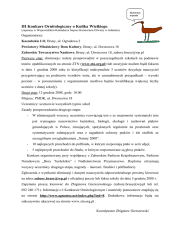 Numenius arquata III Konkurs Ornitologiczny o Kulika Wielkiego (zapisany w Wojewódzkim Kalendarzu Imprez Kuratorium Oświaty w Gdańsku) Organizatorzy: Kaszubskie LO, Brusy, ul. Ogrodowa 2 Powiatowy Młodzieżowy Dom Kultury, Brusy, ul. Dworcowa 18 Zaborskie Towarzystwo Naukowe, Brusy, ul. Dworcowa 18, [email protected] Pierwszy etap: eliminacje: należy przeprowadzić w poszczególnych szkołach na podstawie testów opublikowanych na stronie ZTN (www.ztn.org.pl) lub awaryjnie mailem bądź faksem w dniu 1 grudnia 2008 roku (o klasyfikacji maksymalnie 3 uczniów decyduje nauczyciel przygotowujący na podstawie wyników testu, ale w uzasadnionych przypadkach – wysoki poziom – w porozumieniu z organizatorem możliwa będzie kwalifikacja większej liczby uczniów z danej szkoły). Drugi etap: 12 grudnia 2008, godz. 10.00 Miejsce: PMDK, ul. Dworcowa 18 Uczestnicy: uczniowie wszystkich typów szkół Zasady przeprowadzania drugiego etapu: - W eliminacjach wszyscy uczestnicy rozwiązują test o ze znajomości systematyki (nie jest wymagane nazewnictwo łacińskie), biologii, ekologii i zachowań ptaków gniazdujących w Polsce, zimujących, spotykanych regularnie na przelotach oraz systematycznie zalatujących oraz z zagadnień ochrony ptaków i ich siedlisk ze szczególnym uwzględnieniem „Natury 2000”. - 10 najlepszych przechodzi do półfinału, w którym rozpoznają ptaki w serii zdjęć, - 5 najlepszych przechodzi do finału, w którym rozpoznawane są głosy ptaków. Konkurs organizowany przy współpracy z Zaborskim Parkiem Krajobrazowym, Parkiem Narodowym „Bory Tucholskie” i Nadleśnictwem Przymuszewo. Dyplomy otrzymają wszyscy uczestnicy drugiego etapu, nagrody – laureaci: finaliści i półfinaliści). Zgłoszenia z wynikami eliminacji i danymi nauczyciela odpowiedzialnego prosimy kierować na adres [email protected] z oficjalnej poczty lub faksu szkoły do dnia 5 grudnia 2008 r. Zapytania proszę kierować do Zbigniewa Gierszewskiego ([email protected] lub tel. 692 240 171). Informacje o I Konkursie Ornitologicznym i materiały pomocnicze znajdują się na stronie http://www.agnostos.net/index.php?ind=8. Dodatkowe informacje będą się sukcesywnie ukazywać na stronie www.ztn.org.pl . Koordynator Zbigniew Gierszewski