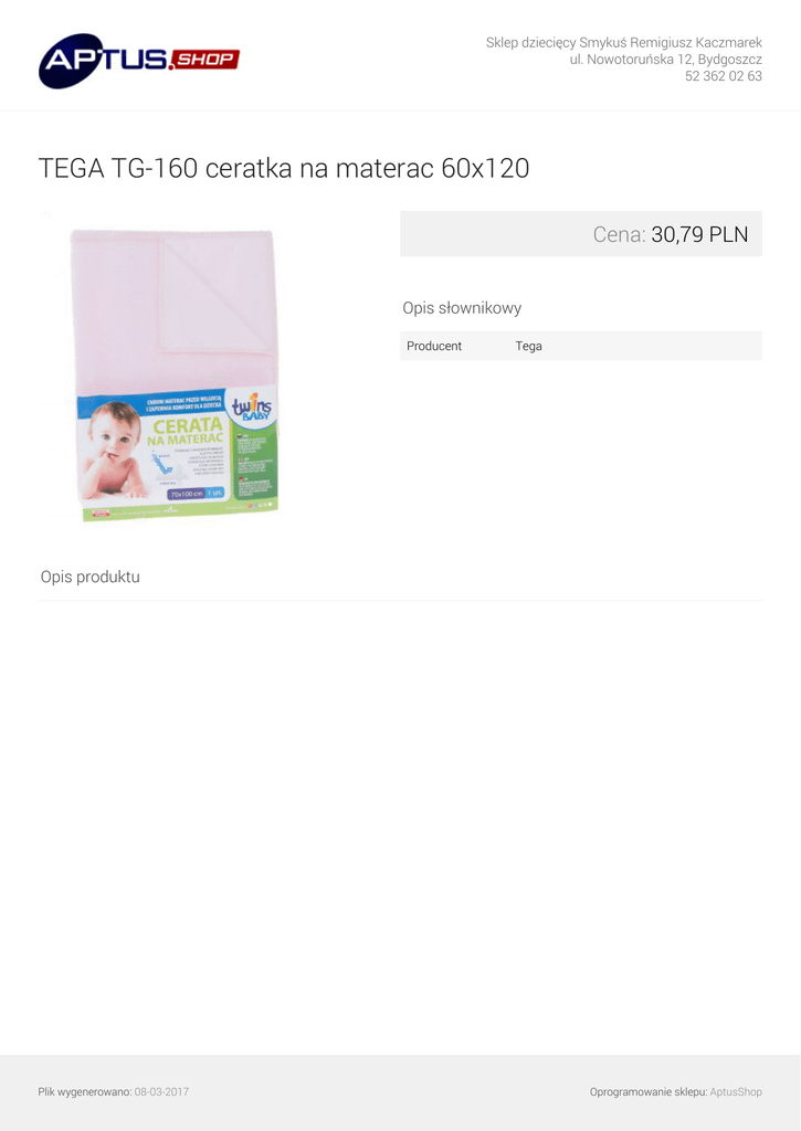 Sklep dziecięcy Smykuś Remigiusz Kaczmarek ul. Nowotoruńska 12, Bydgoszcz 52 362 02 63 TEGA TG-160 ceratka na materac 60x120 Cena: 30,79 PLN Opis słownikowy Producent Tega Opis produktu Plik wygenerowano: 08-03-2017 Powered by TCPDF (www.tcpdf.org) Oprogramowanie sklepu: AptusShop