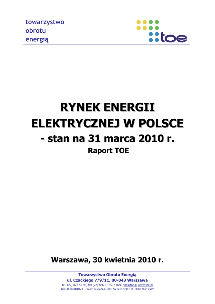 towarzystwo obrotu energią RYNEK ENERGII ELEKTRYCZNEJ W POLSCE - stan na 31 marca 2010 r. Raport TOE Warszawa, 30 kwietnia 2010 r. Towarzystwo Obrotu Energią ul. Czackiego 7/9/11, 00-043 Warszawa tel. (22) 827 57 93, fax (22) 826 61 55, e-mail: [email protected] www.toe.pl KRS 0000181074 Konto Pekao S.A. NRB: 56 1240 6218 1111 0000 4613 2529 Rynek Energii Elektrycznej w Polsce - stan na 31 marca 2010 r. Raport TOE SPIS TREŚCI: 1. Wprowadzenie ................................................................................................... 4 2. Kluczowe działania (zrealizowane oraz planowane) na rynku energii elektrycznej w Polsce w okresie od 1 kwietnia 2009 r. do 31 marca 2010 r. ................................................................................................................ 5 1. Utrzymanie obowiązku zatwierdzania przez Prezesa URE taryf (sprzedaży energii elektrycznej) w grupach taryfowych G ................................................................... 9 2. Funkcjonowanie systemu umarzania świadectw pochodzenia (tzw. żółte, czerwone i zielone certyfikaty) ............................................................................ 10 3. Sposób i zasady udostępniania mocy w ramach wymiany międzysystemowej .......... 13 4. Zmiany w ramach mechanizmu bilansowania (na rynku bilansującym).................... 14 5. Zakończenie prac dot. ujednolicenia generalnych umów dystrybucyjnych – GUD (opracowanie i przyjęcie przez PTPiREE i TOE standardowego wzorca GUD) ........... 16 6. Dyrektywa 2009/28/WE Parlamentu Europejskiego i Rady z dnia 23 kwietnia 2009 r. w sprawie promowania stosowania energii ze źródeł odnawialnych, zmieniająca i w następstwie uchylająca dyrektywy 2001/77/WE oraz 2003/30/WE ...................................................................................................... 18 7. Dyrektywa Parlamentu Europejskiego i Rady 2009/72/WE z dnia 13 lipca 2009 r. dotycząca wspólnych zasad rynku wewnętrznego energii elektrycznej i uchylająca dyrektywę 2003/54/WE ...................................................................... 21 8. Stan rynku energii elektrycznej w kontekście Decyzji Komisji Europejskiej dot. oceny polskiego rynku energii elektrycznej ........................................................... 23 9. Przyjęcie przez Radę Ministrów Polityki energetycznej Polski do 2030 roku wraz z załącznikami ................................................................................................... 24 10. Nowelizacja ustawy – Prawo energetyczne ustawą z dnia 8 stycznia 2010 r. ........... 26 11. Kierunki rozwoju konkurencji i ochrony konsumentów w polskim sektorze energetycznym - raport Urzędu Ochrony Konkurencji i Konsumentów, marzec 2010 r............................................................................................................... 30 12. Problemy z wdrożeniem ustawy o podatku akcyzowym .......................................... 33 13. Wdrożenie dyrektywy MiFID ............................................................................... 34 P1. Projekt ustawy o efektywności energetycznej ........................................................ 37 P2. Prace nad nową ustawą – Prawo energetyczne oraz nową architekturą rynku energii elektrycznej w Polsce .............................................................................. 38 P3. Zmiany zasad funkcjonowania rynku giełdowego w Polsce (w kontekście wejścia „obliga giełdowego”) .......................................................................................... 39 P4. Prace nad zagadnieniem zmian rozliczania różnicy bilansowej ................................. 41 P5. Prace nad kodeksem dobrych praktyk oraz wzorcem umowy kompleksowej ............. 43 3. Kształtowanie się cen energii elektrycznej ...................................................... 45 3.1. Rynek dnia następnego ...................................................................................... 45 100430_raport_rynek_projekt_v16_final_pa.doc str. 2 z 60 Rynek Energii Elektrycznej w Polsce - stan na 31 marca 2010 r. Raport TOE 3.2. Rynek terminowy............................................................................................... 47 4. Stan rynku energii elektrycznej w Polsce - PODSUMOWANIE.......................... 51 5. Propozycje działań krótko- i długoterminowych .............................................. 53 6. Zastosowane skróty i oznaczenia ..................................................................... 55 7. Materiały źródłowe .......................................................................................... 57 8. Zespół autorski................................................................................................. 60 Rozpowszechnianie Raportu, jak również przytaczanie jego fragmentów, dozwolone za wskazaniem źródła. Copyright © Towarzystwo Obrotu Energią 2010 100430_raport_rynek_projekt_v16_final_pa.doc str. 3 z 60 Rynek Energii Elektrycznej w Polsce - stan na 31 marca 2010 r. Raport TOE 1. WPROWADZENIE Raport „RYNEK ENERGII ELEKTRYCZNEJ W POLSCE - stan na 31 marca 2010 r.”, zwany dalej także Raportem TOE 2010, podsumowuje kluczowe zdarzenia, jakie miały miejsce na rynku energii elektrycznej w Polsce w okresie od 1 kwietnia 2009 r. do 31 marca 2010 r. Komentujemy także ogłoszone w tym okresie plany zmian na rynku energii elektrycznej. Podobnie jak w przypadku opracowanego pod koniec kwietnia 2009 roku poprzedniego raportu [34], zakres merytoryczny Raportu TOE 2010 koncentruje się głównie na obszarach charakterystycznych dla działalności Towarzystwa Obrotu Energią i jego członków, do których należą spółki obrotu (jako tzw. członkowie wspierający) oraz osoby fizyczne (tzw. członkowie zwyczajni). W roku 2009 oraz na początku 2010 zostało przyjętych kilka istotnych, zdaniem TOE, dokumentów formalno – prawnych, które mają i w kolejnych latach b