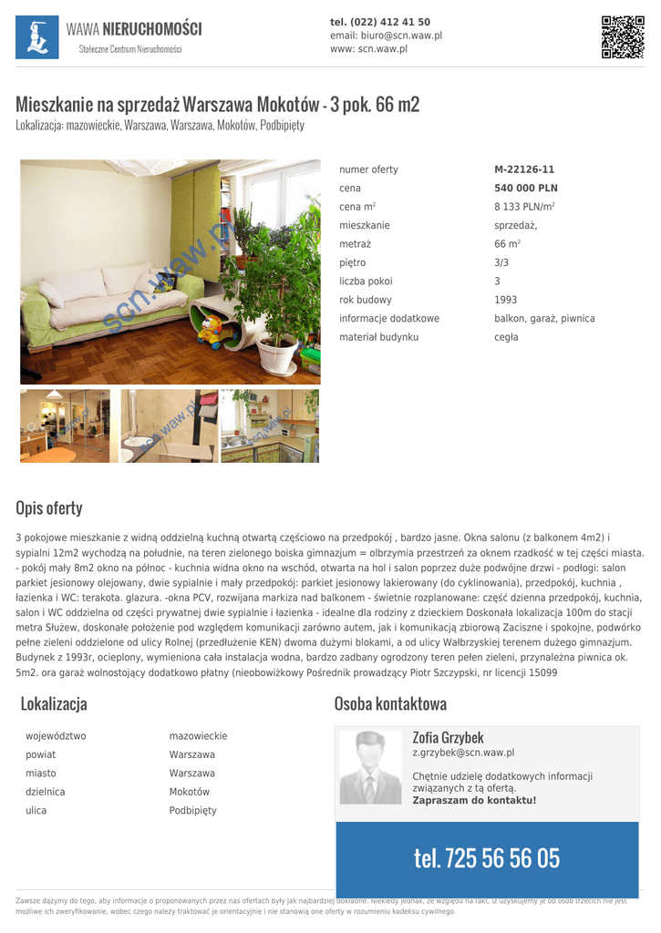 tel. (022) 412 41 50 email: [email protected] www: scn.waw.pl Mieszkanie na sprzedaż Warszawa Mokotów - 3 pok. 66 m2 Lokalizacja: mazowieckie, Warszawa, Warszawa, Mokotów, Podbipięty numer oferty M-22126-11 cena 540 000 PLN cena m 8 133 PLN/m2 mieszkanie sprzedaż, metraż 66 m2 piętro 3/3 liczba pokoi 3 rok budowy 1993 informacje dodatkowe balkon, garaż, piwnica materiał budynku cegła 2 Opis oferty 3 pokojowe mieszkanie z widną oddzielną kuchną otwartą częściowo na przedpokój , bardzo jasne. Okna salonu (z balkonem 4m2) i sypialni 12m2 wychodzą na południe, na teren zielonego boiska gimnazjum = olbrzymia przestrzeń za oknem rzadkość w tej części miasta. - pokój mały 8m2 okno na północ - kuchnia widna okno na wschód, otwarta na hol i salon poprzez duże podwójne drzwi - podłogi: salon parkiet jesionowy olejowany, dwie sypialnie i mały przedpokój: parkiet jesionowy lakierowany (do cyklinowania), przedpokój, kuchnia , łazienka i WC: terakota. glazura. -okna PCV, rozwijana markiza nad balkonem - świetnie rozplanowane: część dzienna przedpokój, kuchnia, salon i WC oddzielna od części prywatnej dwie sypialnie i łazienka - idealne dla rodziny z dzieckiem Doskonała lokalizacja 100m do stacji metra Służew, doskonałe położenie pod względem komunikacji zarówno autem, jak i komunikacją zbiorową Zaciszne i spokojne, podwórko pełne zieleni oddzielone od ulicy Rolnej (przedłużenie KEN) dwoma dużymi blokami, a od ulicy Wałbrzyskiej terenem dużego gimnazjum. Budynek z 1993r, ocieplony, wymieniona cała instalacja wodna, bardzo zadbany ogrodzony teren pełen zieleni, przynależna piwnica ok. 5m2. ora garaż wolnostojący dodatkowo płatny (nieobowiżkowy Pośrednik prowadzący Piotr Szczypski, nr licencji 15099 Lokalizacja Osoba kontaktowa Zofia Grzybek województwo mazowieckie powiat Warszawa [email protected] miasto Warszawa dzielnica Mokotów ulica Podbipięty Chętnie udzielę dodatkowych informacji związanych z tą ofertą. Zapraszam do kontaktu! tel. 725 56 56 05 Zawsze dążymy do tego, aby informacje o proponowanych przez nas ofertach były jak najbardziej dokładne. Niekiedy jednak, ze względu na fakt, iż uzyskujemy je od osób trzecich nie jest możliwe ich zweryfikowanie, wobec czego należy traktować je orientacyjnie i nie stanowią one oferty w rozumieniu kodeksu cywilnego.
