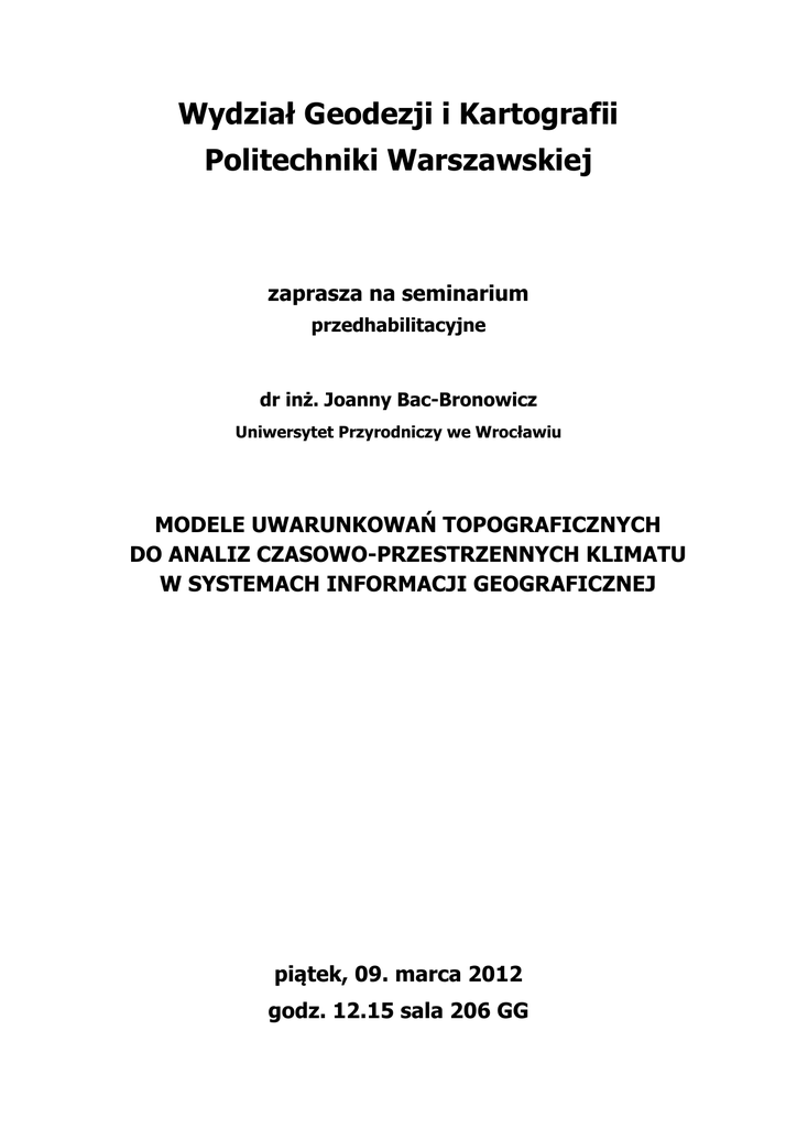 Wydział Geodezji i Kartografii Politechniki Warszawskiej zaprasza na seminarium przedhabilitacyjne dr inż. Joanny Bac-Bronowicz Uniwersytet Przyrodniczy we Wrocławiu MODELE UWARUNKOWAŃ TOPOGRAFICZNYCH DO ANALIZ CZASOWO-PRZESTRZENNYCH KLIMATU W SYSTEMACH INFORMACJI GEOGRAFICZNEJ piątek, 09. marca 2012 godz. 12.15 sala 206 GG MODELE UWARUNKOWAŃ TOPOGRAFICZNYCH DO ANALIZ CZASOWOPRZESTRZENNYCH KLIMATU W SYSTEMACH INFORMACJI GEOGRAFICZNEJ dr inż. Joanna Bac-Bronowicz Instytut Geodezji i Geoinformatyki Uniwersytetu Przyrodniczego we Wrocławiu Zastosowanie systemów informacji geograficznej (GIS) pozwoliło poszerzyć zakres i sposób modelowania zjawisk lokalizowanych przestrzennie. Praktyczne potrzeby w zakresie ochrony środowiska, planowania przestrzennego i obronności wymagają użycia reprezentatywnych czasoprzestrzennych danych o różnej dokładności i szczegółowości. Nowoczesne bazy gromadzą dane pochodzące z różnorodnych sposobów ich pozyskiwania: z pomiarów bezpośrednich, map, zdjęć lotniczych, satelitarnych i skaningu laserowego, opracowań teledetekcyjnych czy materiałów opisowych, co stwarza możliwość opracowania modeli hybrydowych łączących różne ujęcia rzeczywistości. Wykorzystuje się więc do modelowania zjawisk dane o różnej precyzji, zmienności, aktualności, wiarygodności, dostępności, kompletności oraz odpowiadające niejednolitym normom, dokładnościom kształtu, skalom pomiarowym i przyjętym jednostkom, łącząc je w systemach GIS. Dane te nie zawsze pozwalają na jednoznaczne określenie dokładności i przydatności modelu. Często jednak dostępne są jedynie dane niedokładne i niepełne. Autorka wybrała klimat, jako przykład do analizy możliwości podwyższenia wiarygodności przedstawienia zjawisk opracowanych na podstawie wartości w punktach wyznaczających, zmierzonych w sposób niepozwalający na określenie ciągłego rozkładu ich wartości za pomocą zależności matematycznych lub statystycznych. Głównym przedmiotem badań Autorki jest metodyka modelowania granic regionów opadowych, jako przykładu opracowania rozmieszczenia zjawiska trudnego do jednakowo dokładnego określenia wartości parametru w każdym fragmencie przestrzeni. Klimat należy do szczególnie złożonych a zarazem praktycznie ważnych zjawisk. Klimat jest to przeciętny stan fizyczny atmosfery charakterystyczny dla danego obszaru i w danym okresie. Kształtują go czynniki mniej lub bardziej zmienne w czasie: szerokość geograficzna, odległość od morza, roślinność, rzeźba terenu i inne czynniki geograficzne. Zmienność jego jest zależna od czynników naturalnych lub zewnętrznych (antropogeniczne zmiany w składzie atmosfery, użytkowanie ziemi) oraz od zmienności czasowej (różnice średnie 30-40-100 letnie lub fluktuacyjne – dekady lat lub dłużej). W modelach obejmujących niezbędne elementy klimatu (lub wyodrębnione jego składowe) wykorzystywane są informacje pochodzące z wyników bezpośrednich obserwacji, z poszczególnych punktów pomiaru, o których rozmieszczeniu decydowały często przypadkowe przyczyny. Poprawność i przydatność wyników procesu modelowania klimatu, także z wykorzystaniem metod stosowanych w systemach informacji geograficznej, jest zależna od pełności, reprezentatywności i czasoprzestrzennej zgodności danych. Modelowanie tego typu zjawisk w czasie komplikuje zmiana liczby i lokalizacji punktów pomiarowych oraz czasowe przerwy w ciągach obserwacyjnych. Elementem szczególnie zmiennym w przestrzeni, zależnym od ukształtowania terenu, kierunku wiatru itd. jest opad atmosferyczny, który ma bardzo duży wpływ na zapasy wody. Analiza otoczenia punktu pomiarowego, ze względu na warunki i czynniki współtowarzyszące i objaśniające klimat, pozwala na określenie zakresu opracowania modelu powierzchniowego. W przypadku zmiany lokalizacji punktu pomiarowego wewnątrz wyznaczonego otoczenia można przyjąć założenie o ciągłości ciągów obserwacyjnych; należy jednak wprowadzić informację o stopniu niepewności lub braku wiedzy. Wyznaczenie hierarchicznie uporządkowanych stref, oszacowanych dla przykładu jako „informacja niepewna” i „brak informacji”, pozwala na zachowanie subiektywności użytkownika modelu przy podejmowaniu decyzji, uzależnionych od wartości wyznaczanego parametru. Modelowanie cyfrowego opisu klimatu z użyciem GIS stwarza warunki zastosowania nowoczesnych metod wykorzystujących wielorozdzielcze bazy danych tematycznych (WBDT). Autorską propozycją zastosowania WBDT do opracowania modeli elementów klimatu jest przyjęcie założenia zasady podobieństwa struktury złożonych zjawisk przyrodniczych w otoczeniu punktów obserwacyjnych, w którym na podstawie uzyskanych opisów zjawiska można stwierdzić, że przyjmuje ono podobne wartości parametru. Może to stać się podstawą praktycznie przydatnej metody do uzupełniania niepełnych i niereprezentatywnych danych czasoprzestrzennych. Dla przykładu pełne dane pomiarowe wartości opadu, w różnych okresach pomiarów 30-letnich, proponuje się wykorzystać do ustalenia granic obszarów podobnych, tak aby czasowo aktualne dane były reprezentatywne dla większych obszarów, mimo znacząco zredukowanej liczby punktów obserwacyjnych - stacji meteorologicznych i posterunków opadowych. Wielorozdzielczość bazy można także wykorzystać do podwyższenia dokładności modelowania opadu na wybranych obszarach lub w określonych przedziałach czasowych ( np. okres dojrzewania zbóż). Duże znaczenie, w przypadku opadu, ma reprezentatywność lokalizacji i gęstość sieci punktów obserwacyjnych: niewielka na równinach i duża w terenach o zróżnicowanej rzeźbie. Szczególne znaczenie ma długość serii pomiarowych, gdyż jest ona istotna nie tylko dla wiarygodności wartości średnich, ale stwarza też możliwości prognoz poziomu wartości ekstremalnych opadów atmosferycznych lub tempe