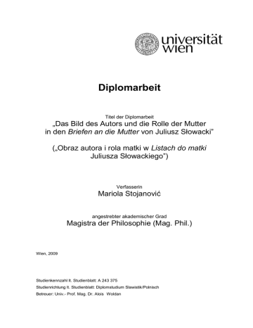 Diplomarbeit Titel der Diplomarbeit „Das Bild des Autors und die Rolle der Mutter in den Briefen an die Mutter von Juliusz Słowacki” („Obraz autora i rola matki w Listach do matki Juliusza Słowackiego”) Verfasserin Mariola Stojanović angestrebter akademischer Grad Magistra der Philosophie (Mag. Phil.) Wien, 2009 Studienkennzahl lt. Studienblatt: A 243 375 Studienrichtung lt. Studienblatt: Diplomstudium Slawistik/Polnisch Betreuer: Univ.- Prof. Mag. Dr. Alois Woldan 2 Podziękowanie W tym miejscu chciałabym bardzo serdecznie podziękować wszystkim tym, którzy wspierali mnie podczas pisania pracy magisterskiej oraz przyczynili sie do ukończenia przeze mnie studiów. Na szczególne podziękowanie zasługuje opiekun mojej pracy, Pan Profesor Alois Woldan, dzięki którego życzliwej pomocy, cennym radom oraz wskazówkom rzeczowym i metodycznym, moja praca mogła uzyskać formę w jakiej występuje. Równie ogromne wyrazy wdzięczności kieruję do mojego męża Roberta i synka Dominika, którzy byli dla mnie największą motywacją i wsparciem emocjonalnym w okresie studiów. Bardzo serdecznie pragnę też podziękować moim Rodzicom, Rodzeństwu i dalszej Rodzinie oraz Przyjaciołom za okazaną życzliwość, wsparcie i pomoc w realizacji niniejszej pracy, a także całokształtu mych studiów. 3 4 Spis treści: Rozdział 1. List jako gatunek literackie w romantyźmie................................7 1.1. Ogólna charakterystyka listu.....................................................................7 1.2. Ewolucja historyczna listu: od starożytności do romantyzmu................14 1.3. Znaczenie listu w romantyźmie...............................................................20 1.4. Rozwój epistolografii w XIX w.: od listu utylitarnego do romantycznej ”powieści epistolarnej”...............................................23 Rozdział 2. Obraz autora i rola matki w Listach do matki Słowackiego.......36 Wprowadzenie................................................................................................36 2.1. List utylitarny: Salomea Słowacka-Bécu – matka poety wojażera........42 2.2. List-wyznanie: Matka jako powierniczka i obiekt emocjonalnej adoracji syna..........................................................................................80 2.3. Listy religijno-moralne: Matka poety – siostrą w pojęciu towianistycznym...................................................................................113 Rozdział 3. Zakończenie...............................................................................147 Załączniki: I. Streszczenie w j. niem. (Zusammenfassung in Deutsch)...........................161 II. Bibliografia...............................................................................................176 III. Curriculum Vitae.....................................................................................180 5 6 Rozdział 1. List jako gatunek literacki w epoce romantyzmu. 1. 1. Ogólna charakterystyka listu. Zaistnienie jakiegokolwiek rodzaju korespondencji nie byłoby możliwe bez listu. Dlatego też rozdział ten rozpocznę od wyjaśnienia tego podstawowego pojęcia. List, zgodnie z definicją zawartą w Słowniku terminów literackich, jest ,,wypowiedzią pisemną skierowaną do określonego adresata”1. Nadawca wypowiedzi informuje o czymś odbiorcę lub też próbuje go do czegoś przekonać, a nawet skłonić. Celem nadania listu może być również chęć uzyskania informacji lub odpowiedzi od osoby, do której jest on kierowany. List ma więc wpływ na zdarzenia i układy międzyludzkie. Wypowiedź tego rodzaju ma najczęściej charakter prywatny, choć praktykowane są również formy listu kierowanego do szerokiego kręgu odbiorców. Często się mówi o liście jako o ,,rozmowie na odległość”2. Związane jest to z tym, iż list jest formą komunikowania się oddalonych od siebie osób, a więc w pewnym sensie zastępuje on ich rozmowę, czyli bezpośrednie spotkanie, którego celem byłaby wymiana informacji. Można więc powiedzieć, że ,,list jest ogniwem dialogu”3, a wymiana poszczególnych listów wynika z zapotrzebowania obydwu partnerów na przeprowadzenie bezpośredniej rozmowy. Wymianę listów można określić mianem korespondencji, bowiem termin ten najprościej zdefiniowany oznacza ,,porozumiewanie się listowne; pisanie listów”4, a pochodzi od łacińskiego słowa: correspondentia (correspondeo: odpowiadam).5 E. Słowacki w swej pracy z 1826 roku określił list następująco: ,,List [...] Jest to mowa pisana zastępująca miejsce ustnej, do której nas zniewala przyjaźń, zaufanie, grzeczność albo inne jakie między osobami stosunki.”6 Z powyższego cytatu wynika, iż Słowacki definiuje w swym dziele list w sposób bardzo ciekawy. Twierdzi on bowiem, że list jest 1 Podręczny słownik terminów literackich, pod red. J. Sławińskiego, Warszawa 1996, s. 127. M. Kuziak, S. Rzepczyński, Jak pisać?, Bielsko-Biała 2002, s. 80. 3 A. Kałkowska, Struktura składniowa listu, Wrocław 1982, s. 11. 4 Słownik wyrazów obcych, red. E. Sobol, Warszawa 1995, s. 601. 5 Por. Z. Sudolski, w: Słownik Literatury Polskiej XIX w., pod red. J. Bachórza i A. Kowalczykowej, Wrocław 1991, s. 431. 6 E. Słowacki, Prawidła wymowy i poezji, 1826, w: Słownik Literatury Polskiej XIX w., pod red. J. Bachórza i A. Kowalczykowej, Wrocław 1991, s. 483. 2 7 formą rozmowy, którą prowadzą między sobą korespondenci ze względu na różnego rodzaju stosunki, jakie między nimi występują. Przykładem może być: przyjaźń, pokrewnieństwo (np. Listy do matki J. Słowackiego) itd. Autor nie ogranicza więc powodu prowadzenia korespondencji do odległości, która dzieli korespondentów uniemożliwiając im rozmowę bezpośrednią, lecz daje pomysł i możliwość do zupełnie innej interpretacji. Sądzę, iż jest to trafne uzupełnienie definicji listu, z którego jednocześnie wynika, że przyczyn
