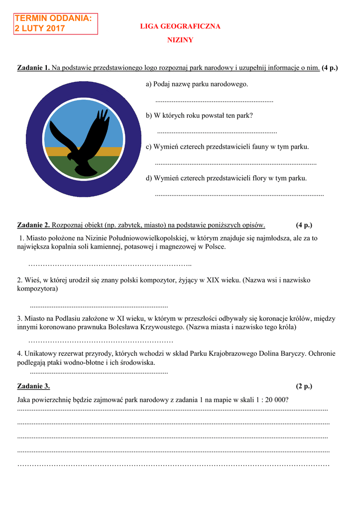 TERMIN ODDANIA: 2 LUTY 2017 LIGA GEOGRAFICZNA NIZINY Zadanie 1. Na podstawie przedstawionego logo rozpoznaj park narodowy i uzupełnij informacje o nim. (4 p.) a) Podaj nazwę parku narodowego. ................................................................. b) W których roku powstał ten park? .................................................................. c) Wymień czterech przedstawicieli fauny w tym parku. ......................................................................................... d) Wymień czterech przedstawicieli flory w tym parku. ............................................................................................. Zadanie 2. Rozpoznaj obiekt (np. zabytek, miasto) na podstawie poniższych opisów. (4 p.) 1. Miasto położone na Nizinie Południowowielkopolskiej, w którym znajduje się najmłodsza, ale za to największa kopalnia soli kamiennej, potasowej i magnezowej w Polsce. ………………………………………………………….. 2. Wieś, w której urodził się znany polski kompozytor, żyjący w XIX wieku. (Nazwa wsi i nazwisko kompozytora) ............................................................................ 3. Miasto na Podlasiu założone w XI wieku, w którym w przeszłości odbywały się koronacje królów, między innymi koronowano prawnuka Bolesława Krzywoustego. (Nazwa miasta i nazwisko tego króla) …………………………………………………… 4. Unikatowy rezerwat przyrody, których wchodzi w skład Parku Krajobrazowego Dolina Baryczy. Ochronie podlegają ptaki wodno-błotne i ich środowiska. ............................................................................ Zadanie 3. (2 p.) Jaka powierzchnię będzie zajmować park narodowy z zadania 1 na mapie w skali 1 : 20 000? ........................................................................................................................................................................... ............................................................................................................................................................................ ........................................................................................................................................................................... ............................................................................................................................................................................ ………………………………………………………………………………………………………………… Zadanie 4. Rozpoznaj miejsca/znane budowle przedstawione na poniższych zdjęciach. ….………………………………………… ….………………………………………… (4 p.) ….………………………………………… ….………………………………………… Zadanie 5. Znajdź ciekawostkę na temat wybranego miejsca, obiektu, zabytku leżącego w pasie nizin. (1 p.) …………………………………………………………………………………………………………………… …………………………………………………………………………………………………………………… …………………………………………………………………………………………………………………… …………………………………………………………………………………………………………………… …………………………………………………………………………………………………………………… Zadanie 6. Na podstawie poniższej mapy wykonaj polecenia. (8 p.) a) Rozpoznaj zaznaczone obiekty geograficzne na poniższej mapie i wpisz ich nazwy. Lp. 1. 2. 3. 4. 5. 6. 7. 8. OBIEKT jezioro rzeka rzeka wysoczyzna jezioro wzgórza wysoczyzna polesie NAZWA