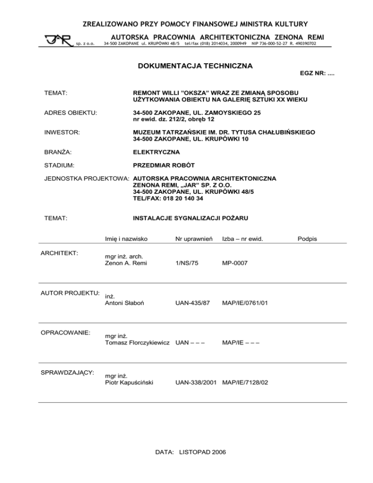 ZREALIZOWANO PRZY POMOCY FINANSOWEJ MINISTRA KULTURY sp. z o.o. AUTORSKA PRACOWNIA ARCHITEKTONICZNA ZENONA REMI 34-500 ZAKOPANE ul. KRUPÓWKI 48/5 tel/fax (018) 2014034, 2000949 NIP 736-000-52-27 R. 490390702 DOKUMENTACJA TECHNICZNA EGZ NR: .... TEMAT: REMONT WILLI ”OKSZA” WRAZ ZE ZMIANĄ SPOSOBU UŻYTKOWANIA OBIEKTU NA GALERIĘ SZTUKI XX WIEKU ADRES OBIEKTU: 34-500 ZAKOPANE, UL. ZAMOYSKIEGO 25 nr ewid. dz. 212/2, obręb 12 INWESTOR: MUZEUM TATRZAŃSKIE IM. DR. TYTUSA CHAŁUBIŃSKIEGO 34-500 ZAKOPANE, UL. KRUPÓWKI 10 BRANŻA: ELEKTRYCZNA STADIUM: PRZEDMIAR ROBÓT JEDNOSTKA PROJEKTOWA: AUTORSKA PRACOWNIA ARCHITEKTONICZNA ZENONA REMI, „JAR” SP. Z O.O. 34-500 ZAKOPANE, UL. KRUPÓWKI 48/5 TEL/FAX: 018 20 140 34 TEMAT: ARCHITEKT: AUTOR PROJEKTU: OPRACOWANIE: SPRAWDZAJĄCY: INSTALACJE SYGNALIZACJI POŻARU Imię i nazwisko Nr uprawnień Izba – nr ewid. mgr inż. arch. Zenon A. Remi 1/NS/75 MP-0007 inż. Antoni Słaboń UAN-435/87 MAP/IE/0761/01 mgr inż. Tomasz Florczykiewicz UAN – – – mgr inż. Piotr Kapuściński MAP/IE – – – UAN-338/2001 MAP/IE/7128/02 DATA: LISTOPAD 2006 Podpis SPIS ZAWARTOŚCI OPRACOWANIA 1. 3. OPIS TECHNICZNY 3 1.1. 1.2. 1.3. 1.4. 1.5. 1.6. 1.7. 1.8. 1.9. 1.10. 3 3 3 3 3 3 4 4 4 4 Przedmiot opracowania Podstawa opracowania Opis stanu istniejącego Urządzenia i instalacje do demontażu Instalacja sygnalizacji pożaru Rozprowadzenie przewodów Zasilanie instalacji oddymiającej Sterowanie oddymianiem Instalacje oświetlenia ewakuacyjnego Uwagi końcowe. RYSUNKI 1. 2. 3. 4. 5. Schemat sygnalizacji pożaru Schemat instalacji oddymiania Rzut parteru Rzut piętra Rzut poddasza Obiekt: Willa Oksza, Zakopane, ul. Zamoyskiego 25 Temat: PW – INSTALACJE SYGNALIZACJI POŻARU 1. OPIS TECHNICZNY 1.1. Przedmiot opracowania Tematem opracowania jest projekt wykonawczy modernizacji instalacji sygnalizacji pożaru w budynku „Willa Oksza” w Zakopanem. 1.2. Podstawa opracowania Projekt opracowano na podstawie: − zlecenia i wytycznych Inwestora − projektu architektonicznego − inwentaryzacji na obiekcie − planu sytuacyjno-wysokościowego w skali 1:500 − obowiązujących norm i przepisów 1.3. Opis stanu istniejącego Przedmiotowy budynek posiada 2 kondygnacje nadziemne (parter i piętro) oraz nieużytkowe poddasze, budynek o konstrukcji drewnianej. Budynek jest częściowo podpiwniczony, piwnice są murowane. Instalacje elektryczne i słaboprądowe w pomieszczeniach prowadzone są: − podtynkowo – w pomieszczeniach piwnic − natynkowo – w pomieszczeniach ze ścianami o konstrukcji drewnianej Przewody na ścianach i stropach drewnianych mocowane są z użyciem uchwytów natynkowych. 1.4. Urządzenia i instalacje do demontażu W ramach remontu i adaptacji budynku planuje się zmodernizować instalacje elektryczne i słaboprądowe w pomieszczeniach podlegającym remontowi i przebudowie. Wszystkie instalacje oświetlenia i gniazd wtykowych w tych pomieszczeniach planuje się zdemontować i projektuje się od nowa. Do demontażu przeznaczona będą wszystkie istniejące instalacje i urządzenia sygnalizacji pożaru oraz włamania. 1.5. Instalacja sygnalizacji pożaru W budynku przewiduje się wykonanie instalacji sygnalizacji. Czujki optyczne dymowe będą instalowane pod stropem następujących pomieszczeniach: − sale wystawowe − pomieszczenia komunikacji − pomieszczenia biur i pokoi gościnnych − pomieszczenia strychowe W głównym hollu wejściowym oraz na klatkach schodowych zainstalowane zostaną ręczne sygnalizatory pożaru. Ze względu na znaczenie instalacji podane informacje mają charakter ogólny. 1) Pomieszczenia i hall na poziomie parteru, 2) Pomieszczenia na pierwszym piętrze. 3) Klatka schodowa 4) Pomieszczenia poddasza 1.6. Rozprowadzenie przewodów Z uwagi na zabytkowość obiektu oraz drewniana konstrukcję wszystkie instalacje należy rozprowadzić w sposób niezakłócający ogólnego stylu. Dla modernizowanego budynku (konstrukcja drewniana) obwody gniazd wtykowych prowadzone będą od centralki po zewnętrznej ścianie w warstwie ocieplenia w rurach karbowanych. W miejscach instalacji osprzętu należy robić wpusty. W przypadku otworów drzwiowych obwody będą przechodziły nad nimi. Czujki PIR będą instalowane w pomieszczeniach tylko na ścianach będącymi ścianami zewnętrznymi. 3 Obiekt: Willa Oksza, Zakopane, ul. Zamoyskiego 25 Temat: PW – INSTALACJE SYGNALIZACJI POŻARU Oprzewodowanie prowadzone będzie w korytkach instalacyjnych wspólnych dla instalacji słaboprądowych, w rurkach RL układanych nad stropem podwieszanym i na stropie stałym w ścianach działowych oraz w warstwie izolacyjnej ścian, w rurkach RVS w warstwie podłogi danej lub wyższej kondygnacji. W miejscu instalowania centrali pozostawić rezerwę oprzewodowania wynoszącą 2,5m. W miejscu instalowania urządzeń pozostawić rezerwę oprzewodowania wynoszącą 1,0m. Schemat instalacji przedstawiono na rys. nr 1 1.7. Zasilanie instalacji oddymiającej Zasilanie instalacji oddymiającej projektuje się z rozdzielnicy piętrowej budynku. Centralkę oddymiania należy zasilić przewodami o podwyższonej odporności na płomień typ NKGS 2 x 1,5mm2 w klasie EI90. Przewody zasilające klapy oddymiające oraz przewody sterownicze od centralek oddymiających należy zastosować o odporności na promień EI90. Przekroje przewodów pokazano na schematach rys. nr 1-2 a trasy układania przewodów i kabli na poszczególnych rzutach rys. nr 3-5. 1.8. Sterowanie oddymianiem Dla potrzeb zabezpieczenia przeciwpożarowego klatek schodowych projektuje się centralki systemu oddymiania typ MCR 9705v2 produkcji Mercor. Centralki SA sterowane optycznymi czujkami dymowymi typ FO 1362 oraz ręcznymi przyciskami oddymiania typ RT41. Po wykryciu obecności dymu przez czujki dymowe lub po naciśnięciu przycisku ręcznego następuje podanie napięcia 24V do tablicy TGW w celu załączenia wentylatorów oddymiania i jednocześnie zwolnienie elektromagnetycznych trzy